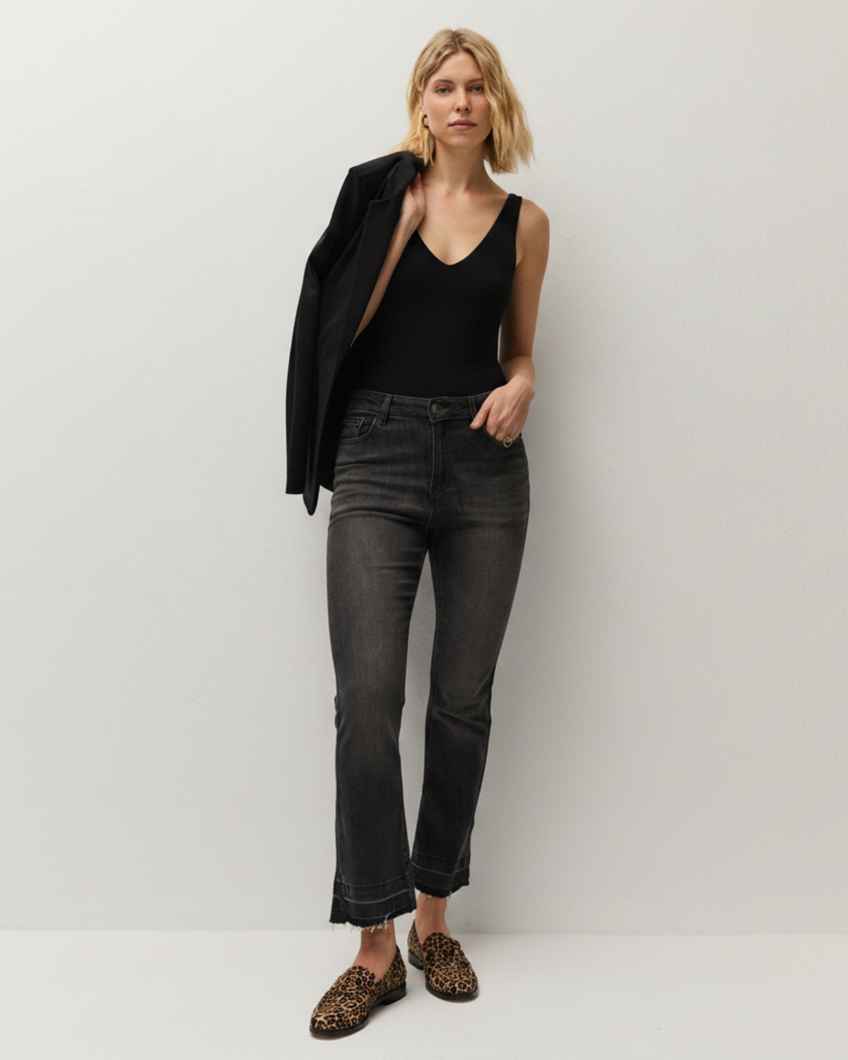 The model is 1.75 cm tall and wears size 38.