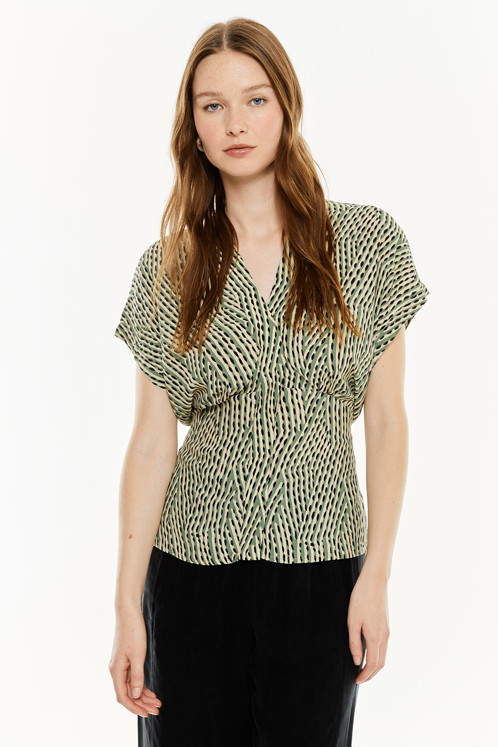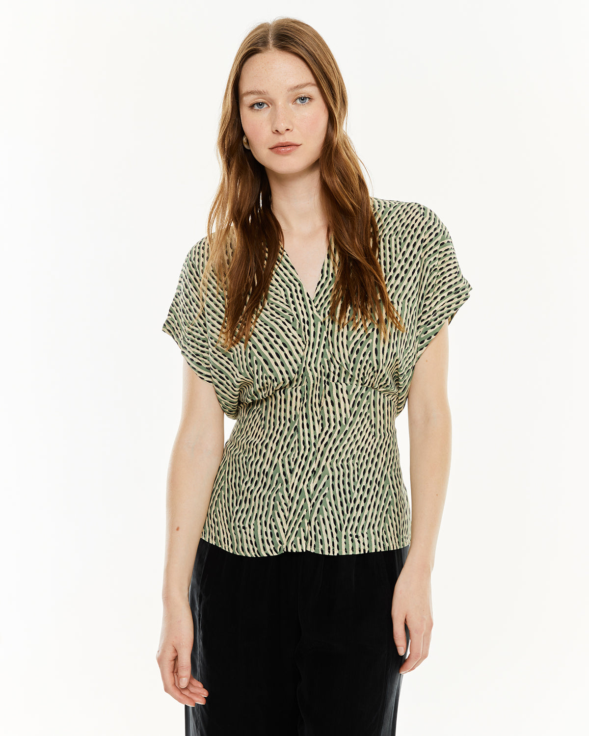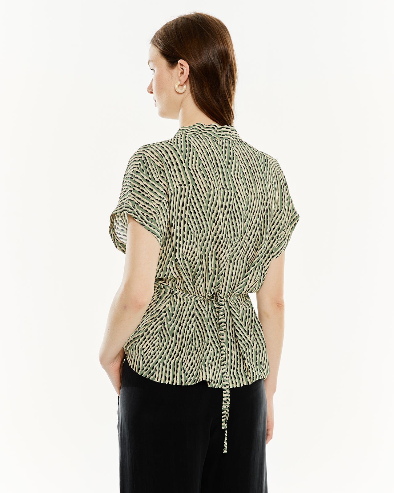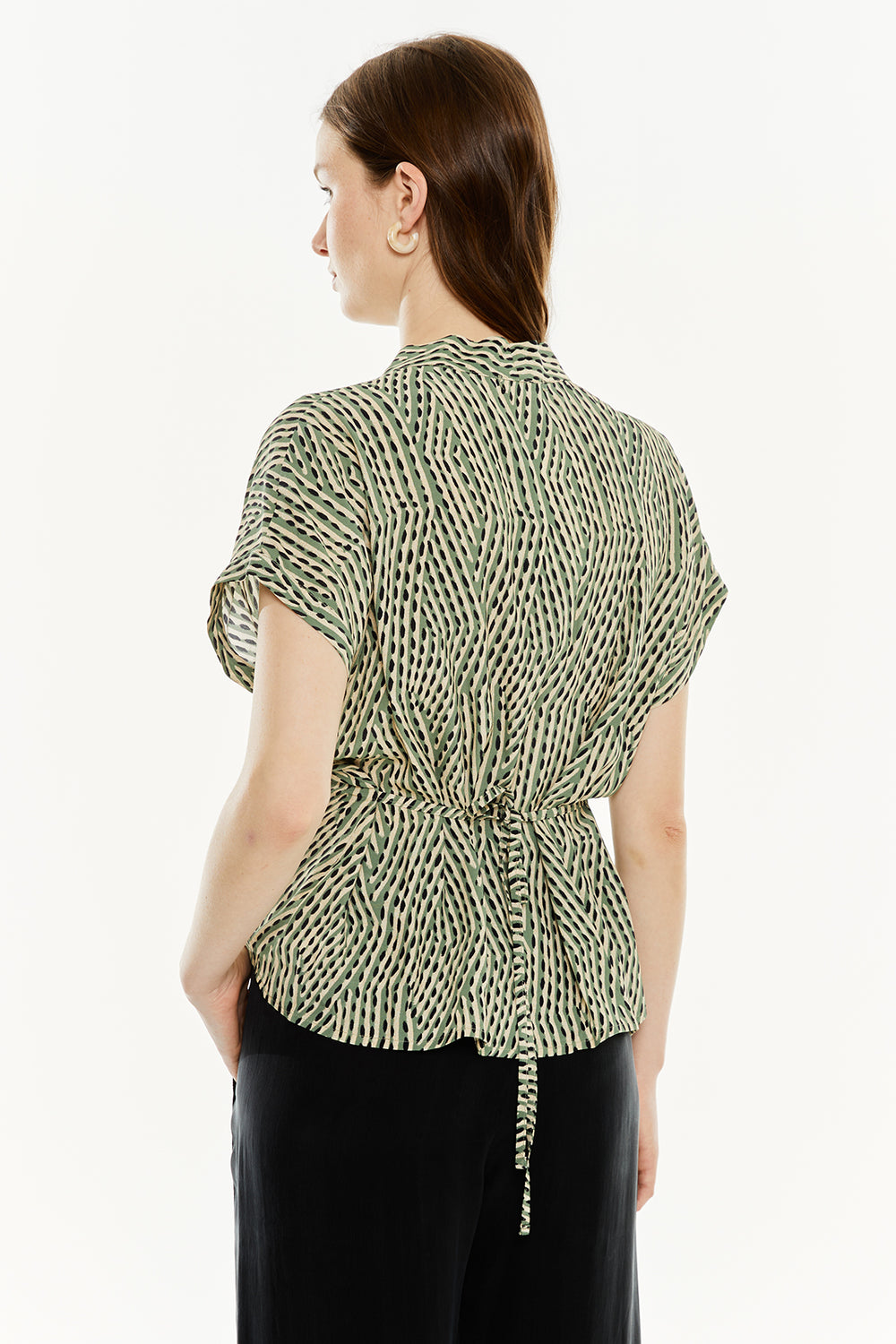 Printed women's shirt with a V-neckline and button closure at the front. Bow detail at the back. Sustainable garment.