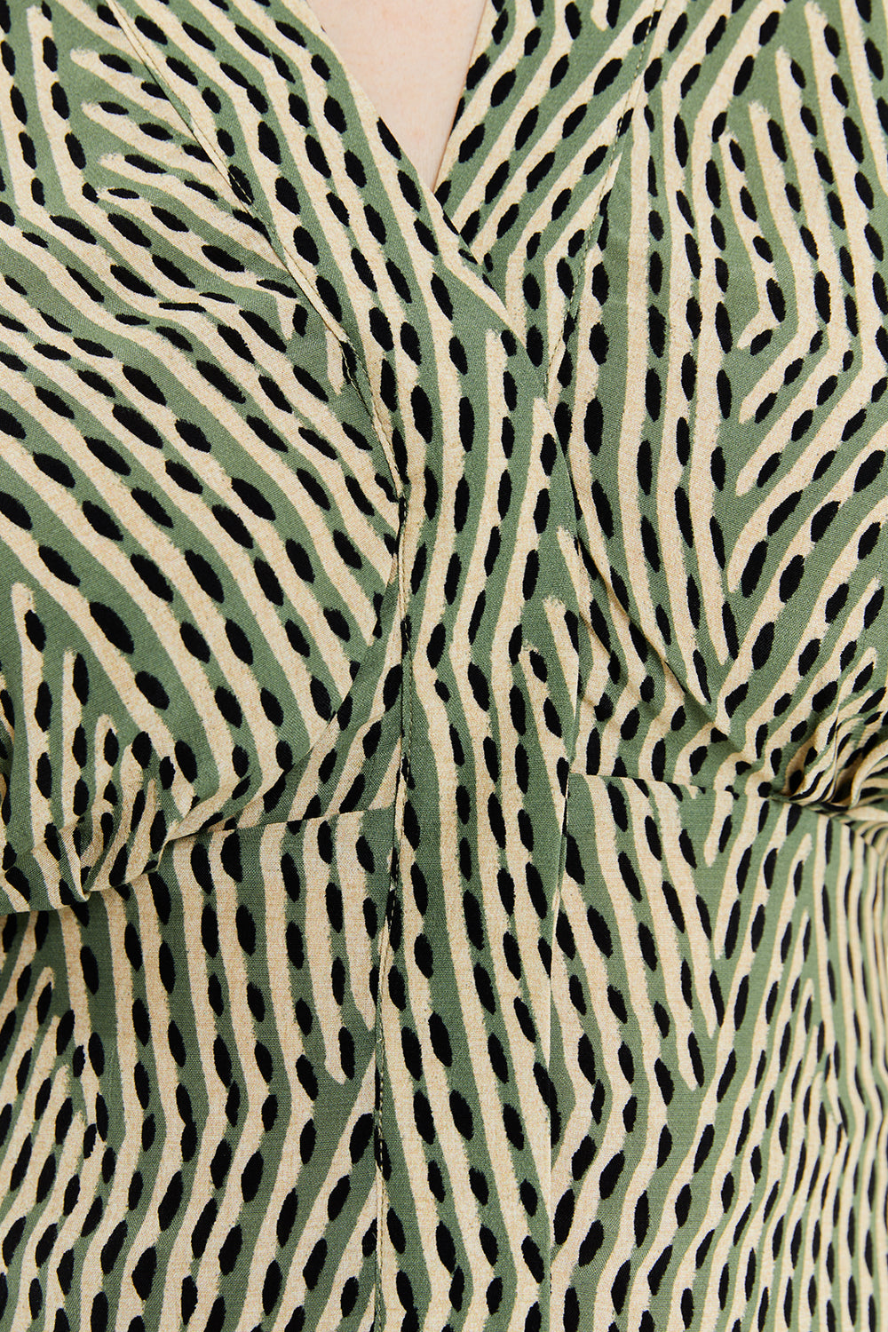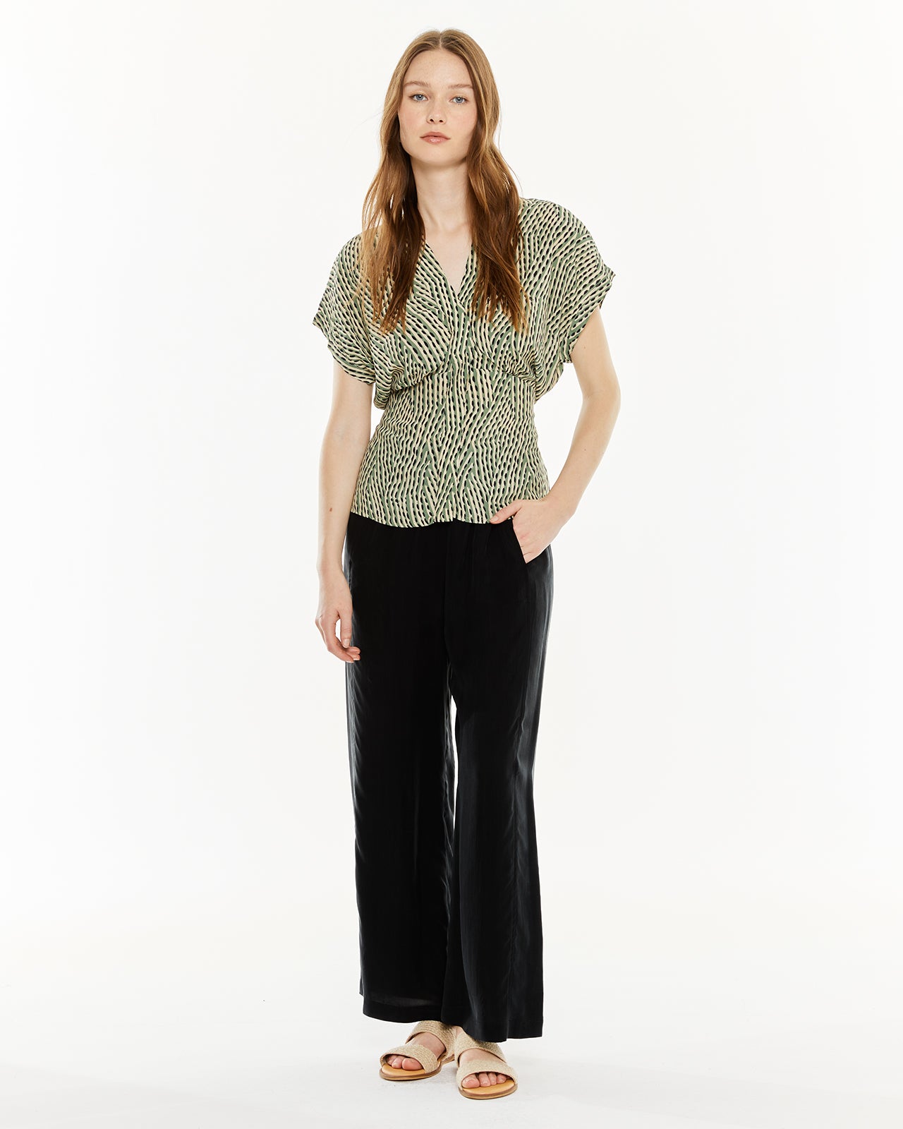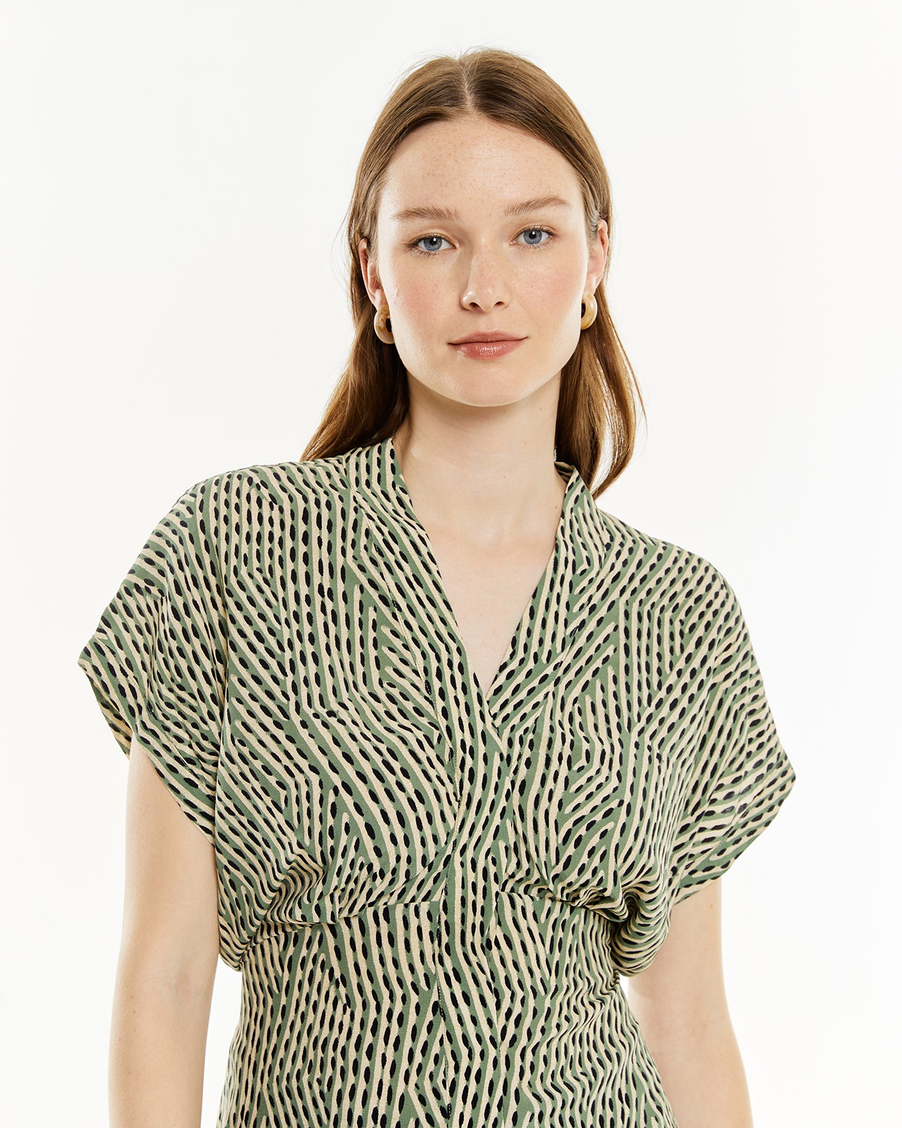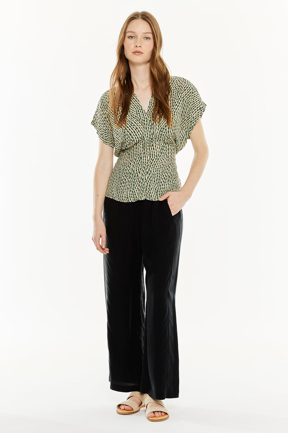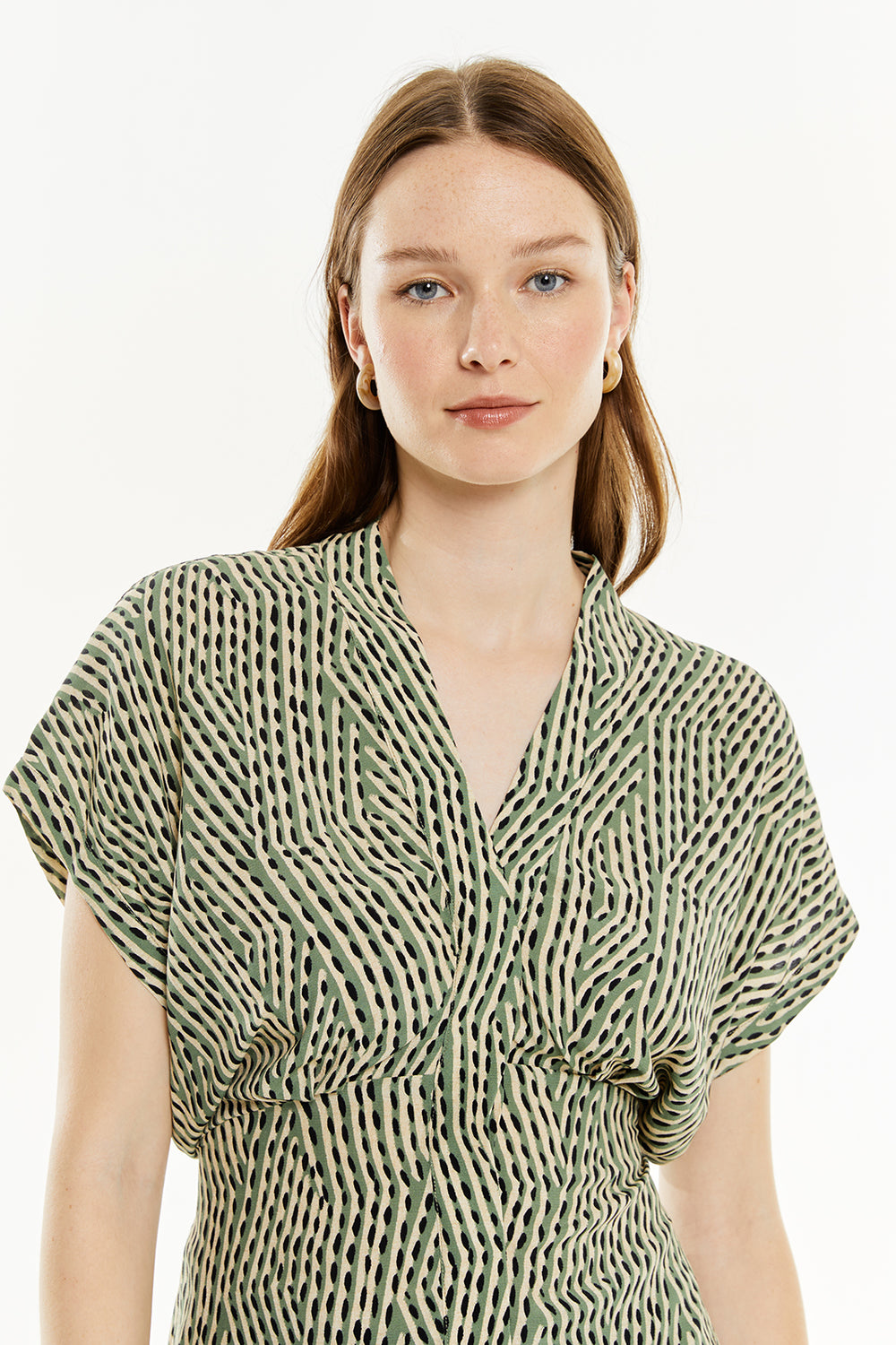 Printed women's shirt with a V-neckline and button closure at the front. Bow detail at the back. Sustainable garment.