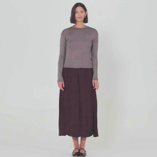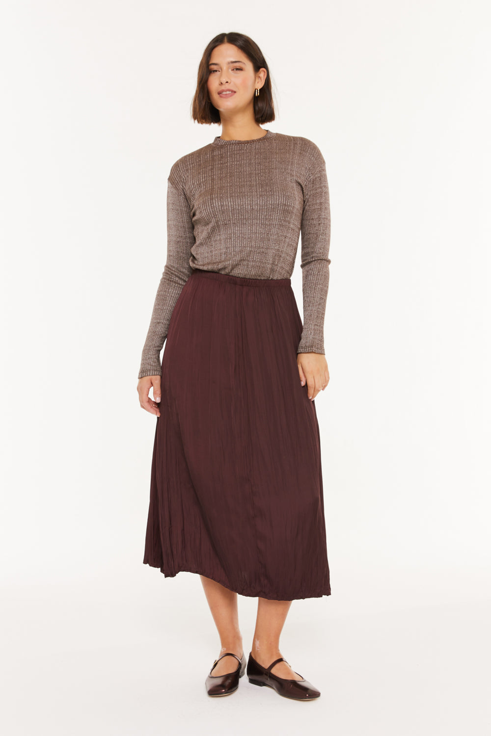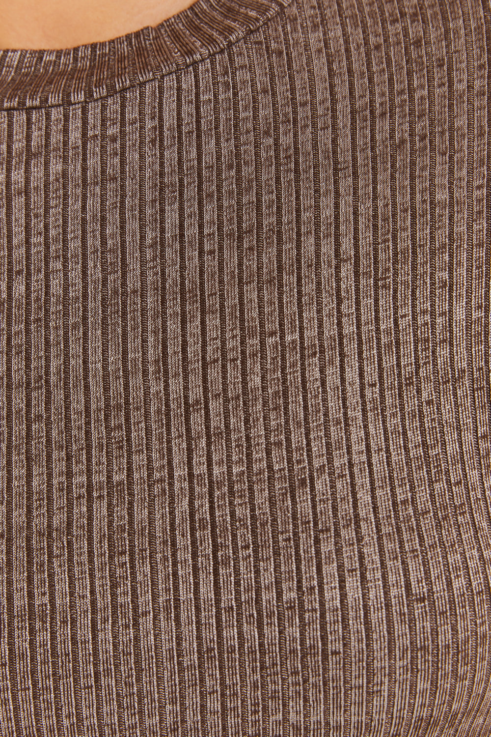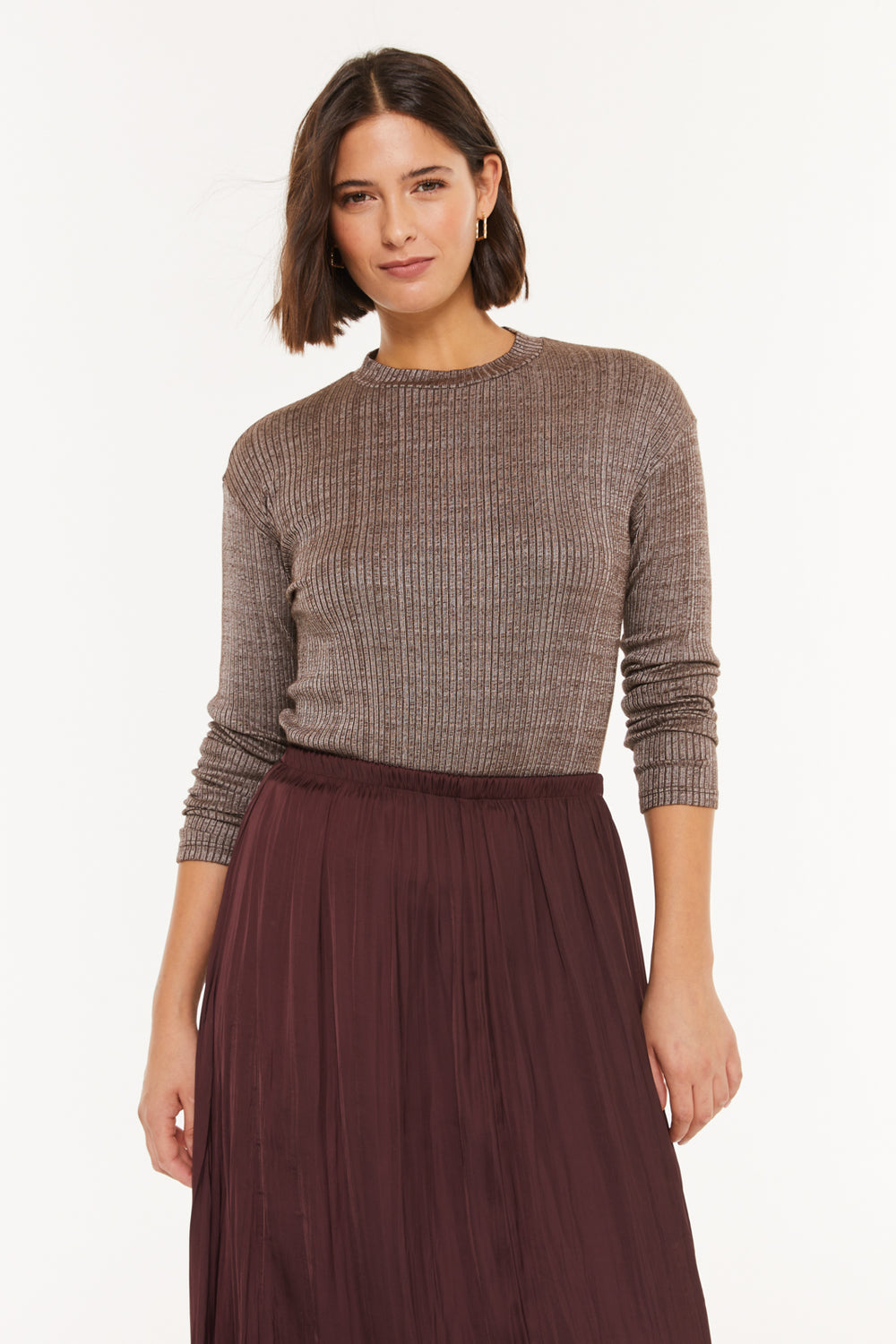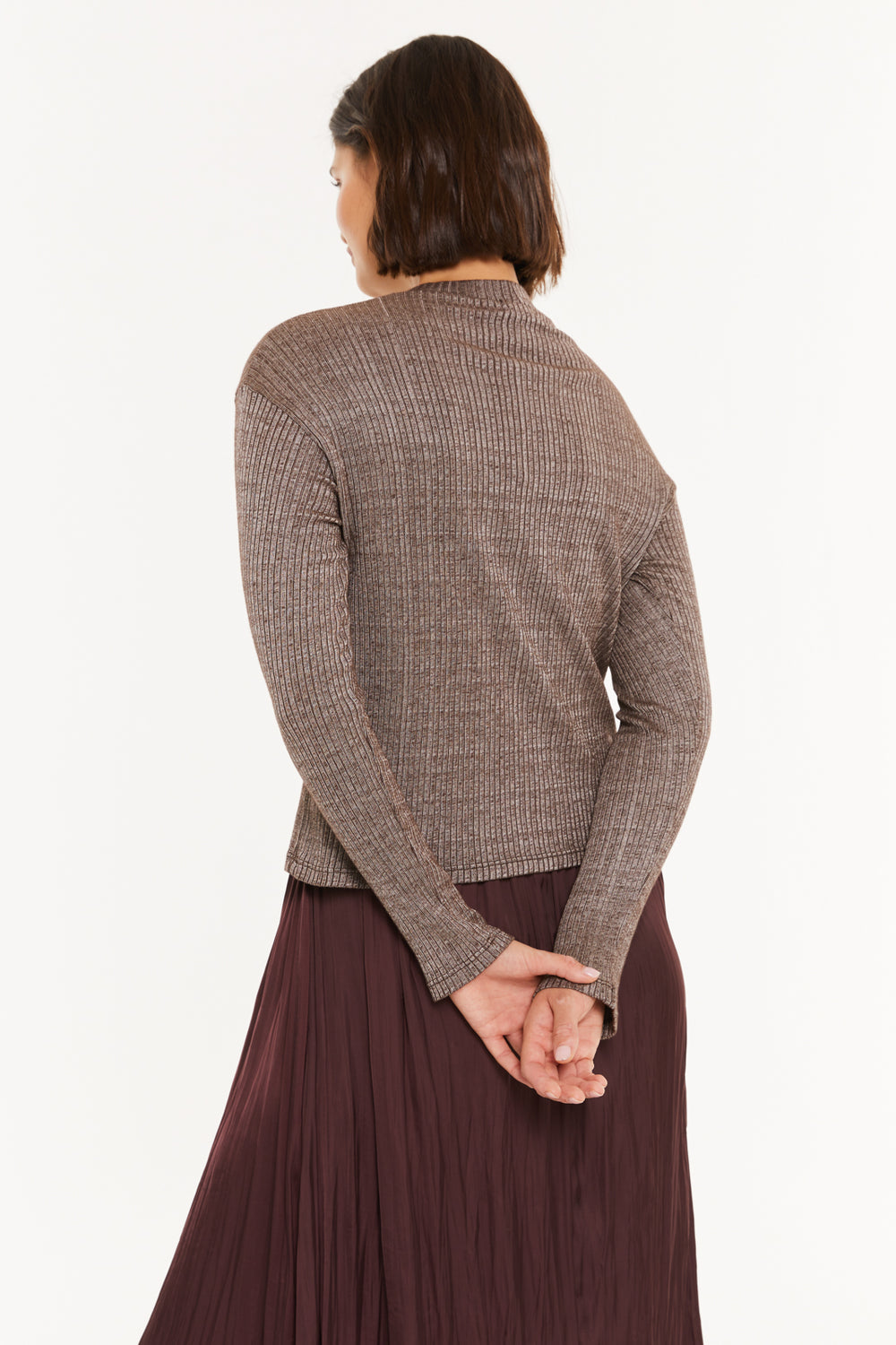 Women's ribbed T-shirt with a mock neckline and long sleeves. Sustainable garment.