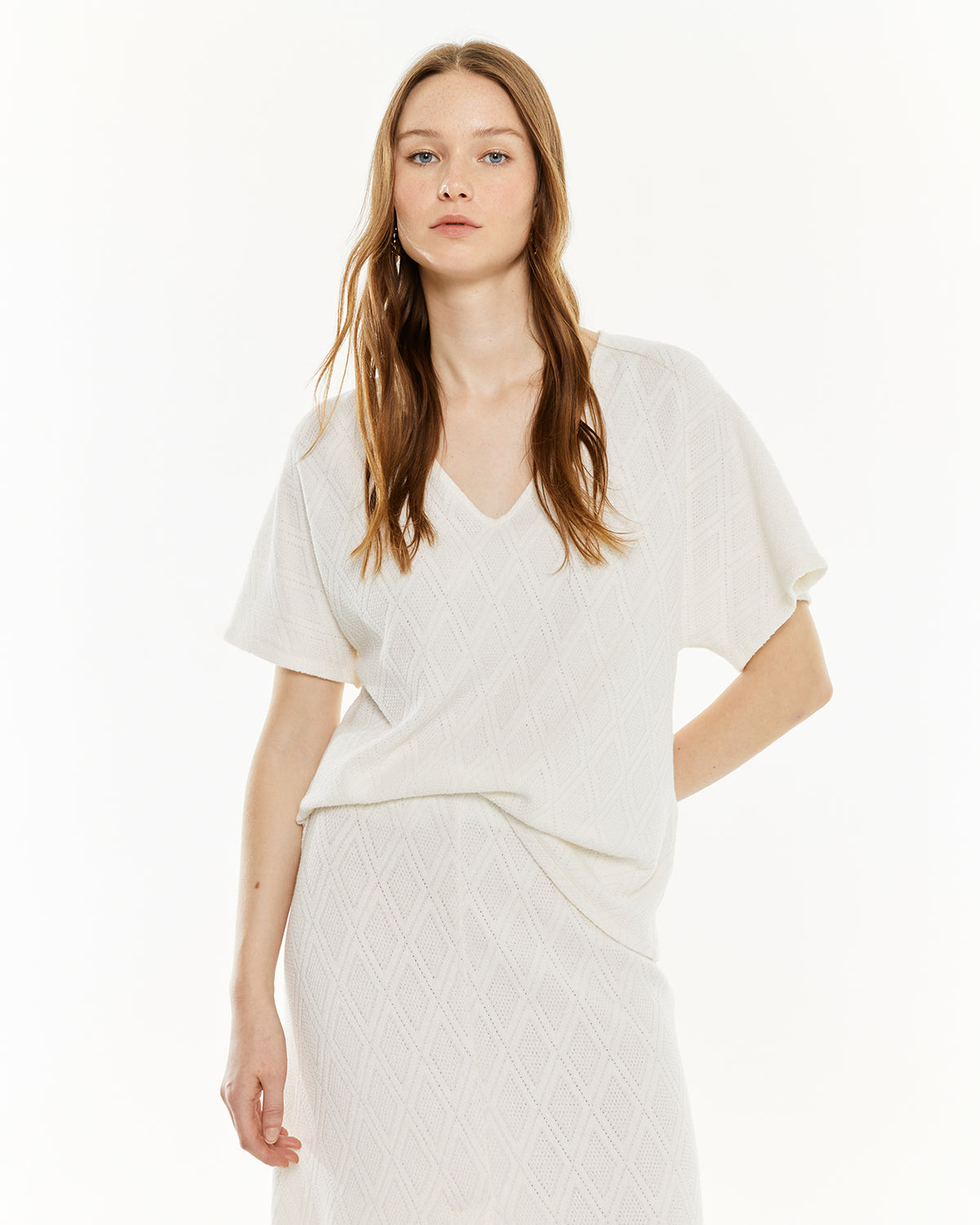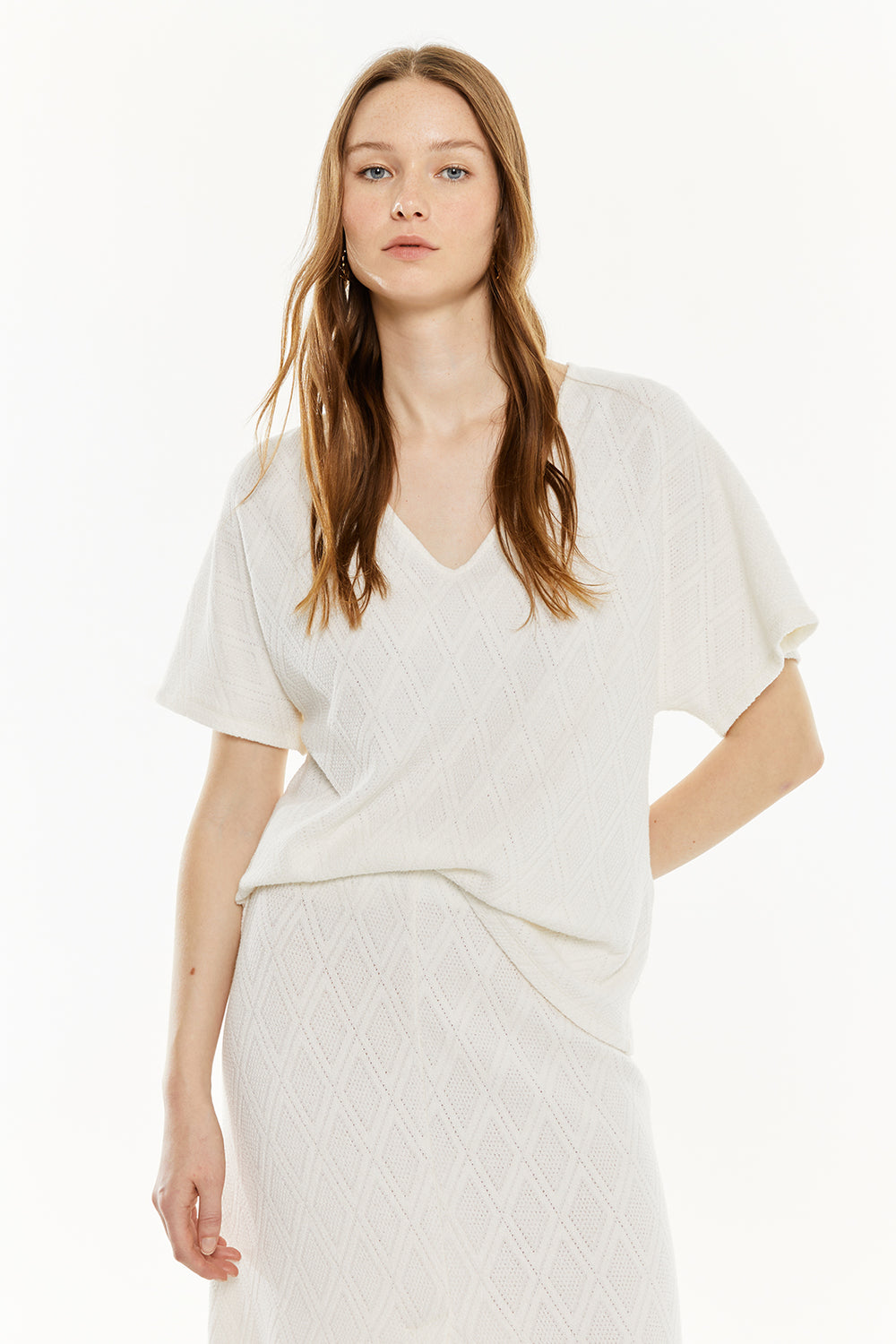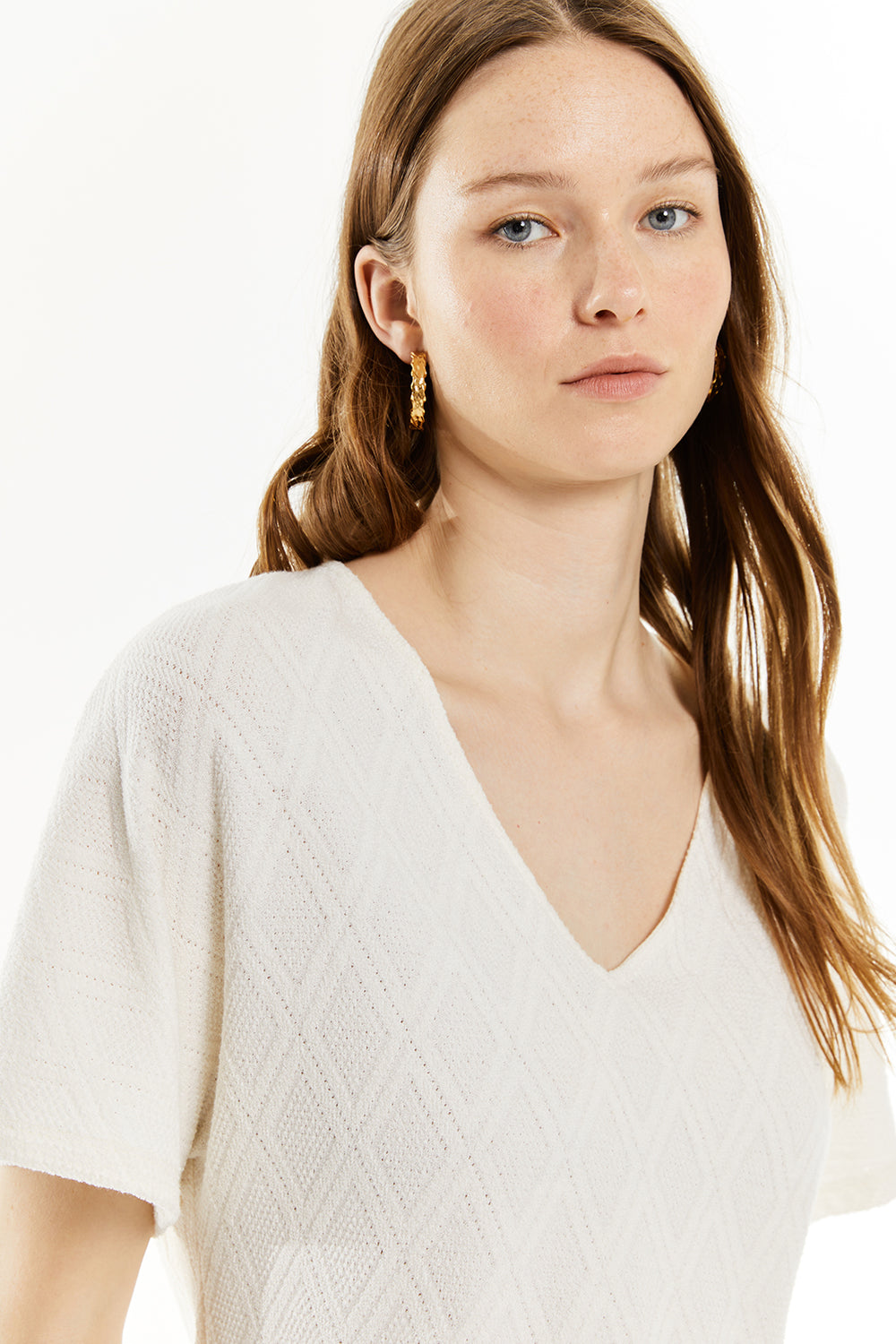 Women's short-sleeved T-shirt with a V-neck and patterned fabric. Sustainable garment.