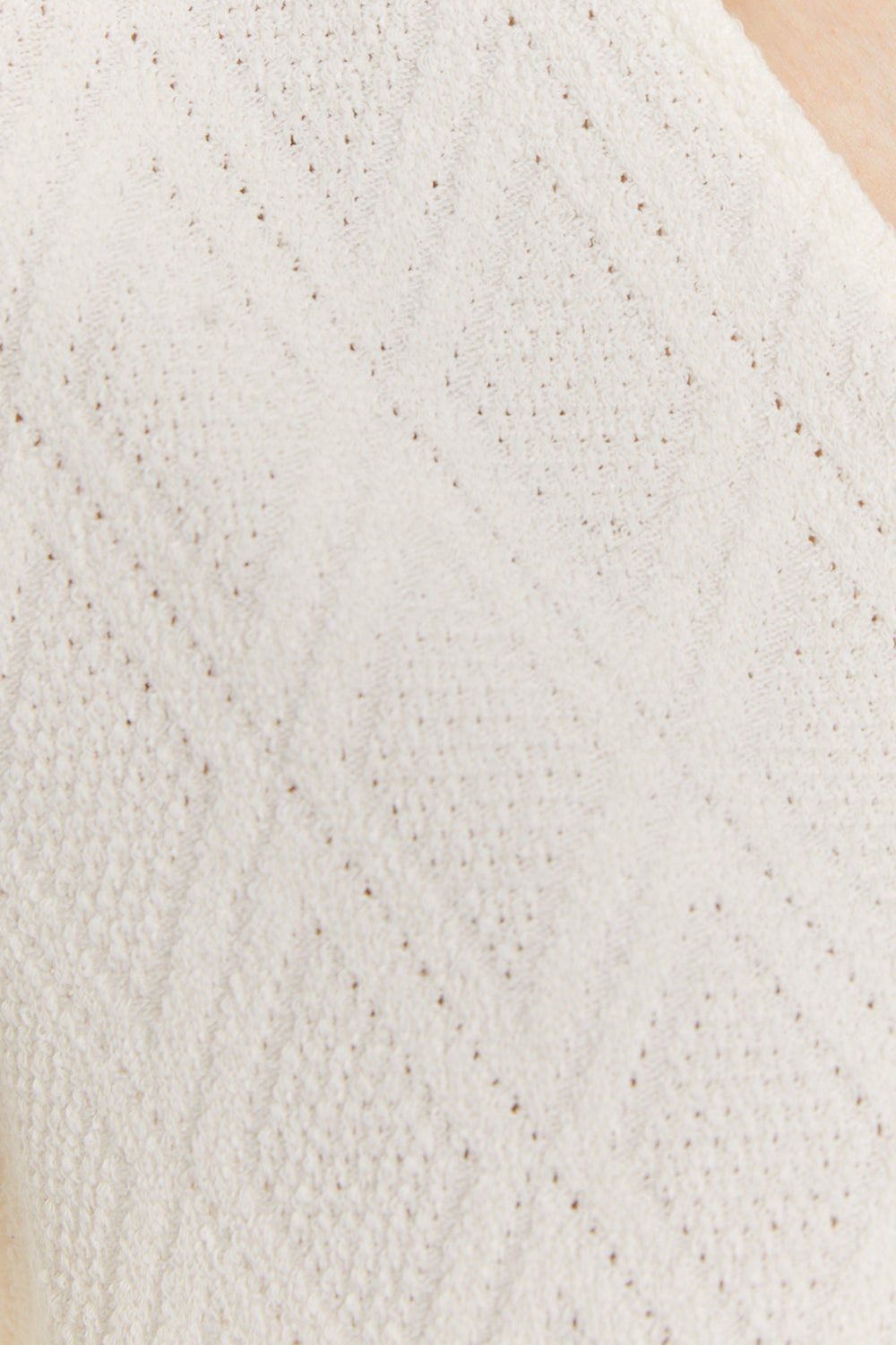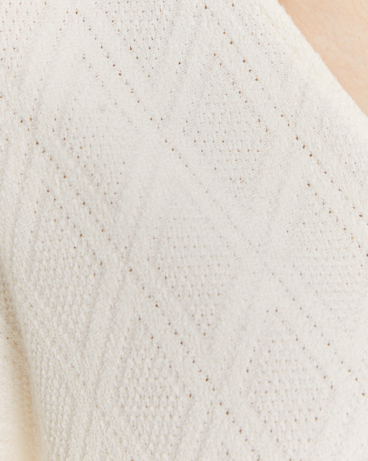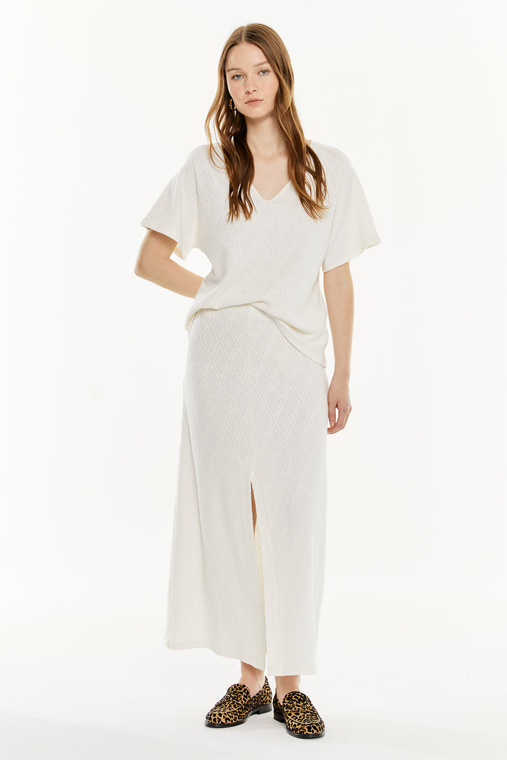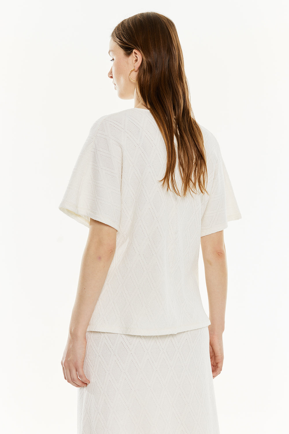 Women's short-sleeved T-shirt with a V-neck and patterned fabric. Sustainable garment.