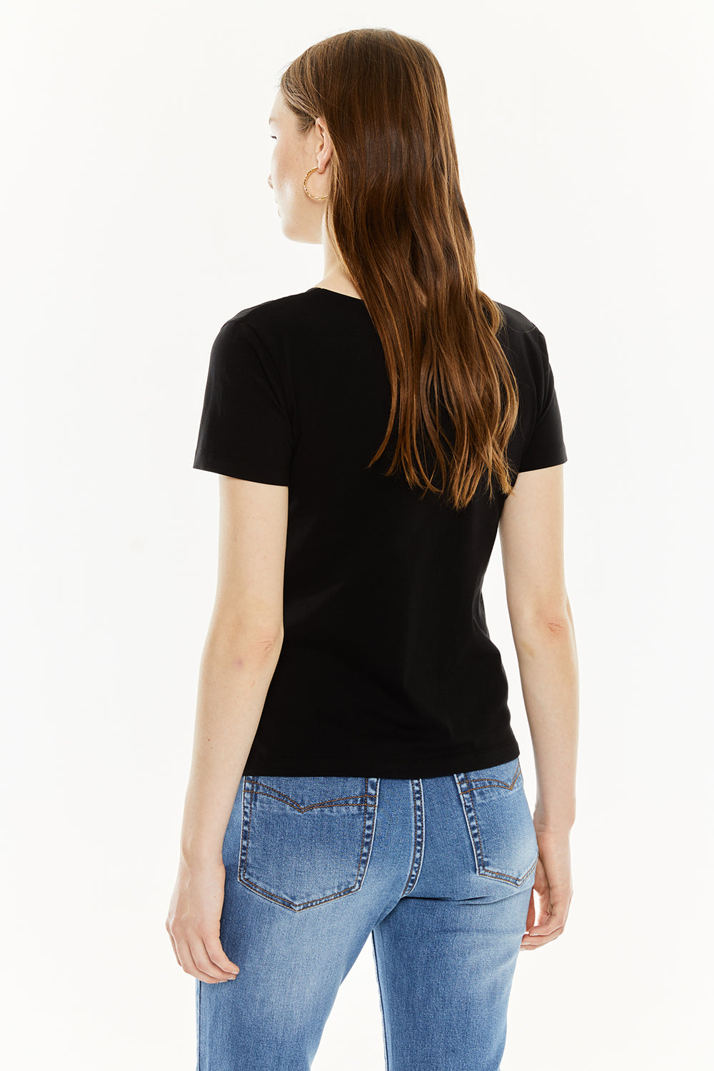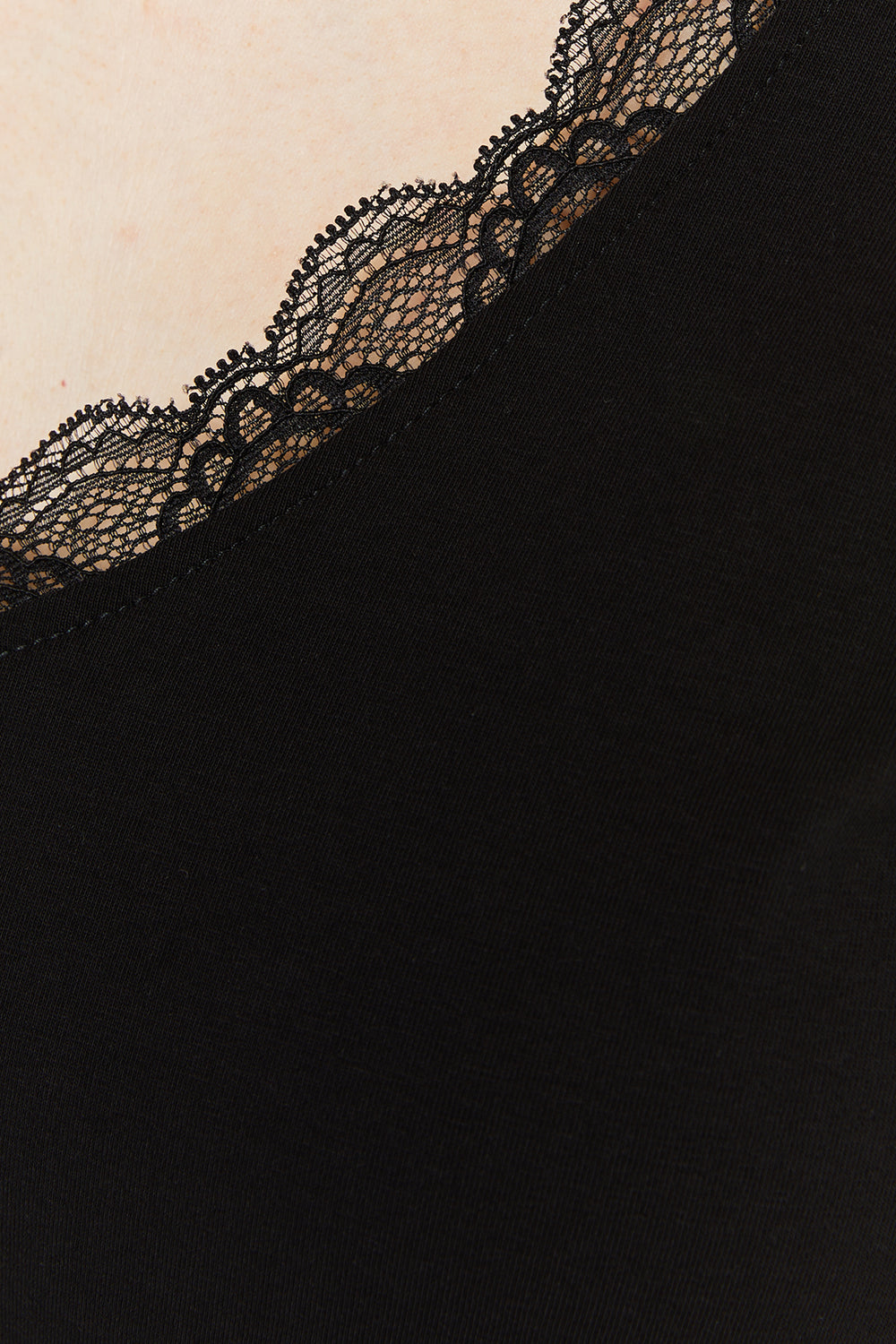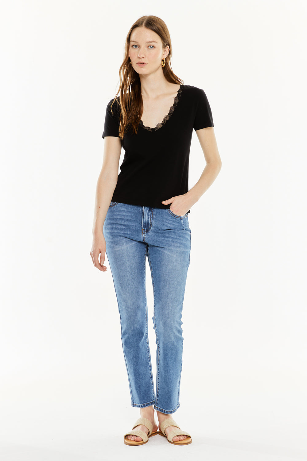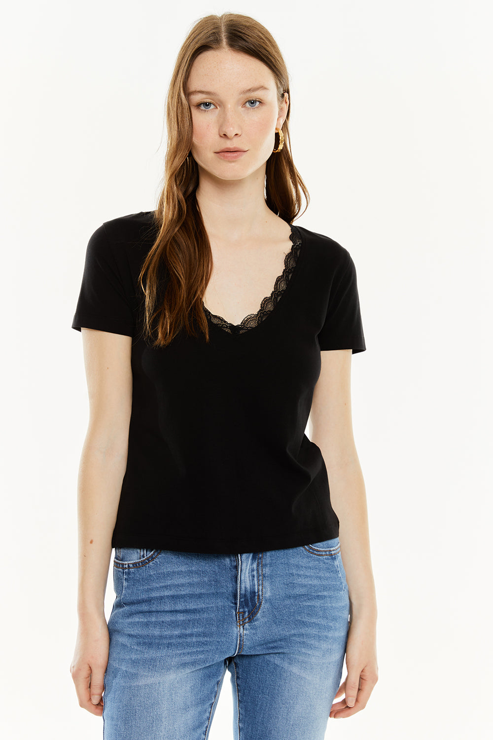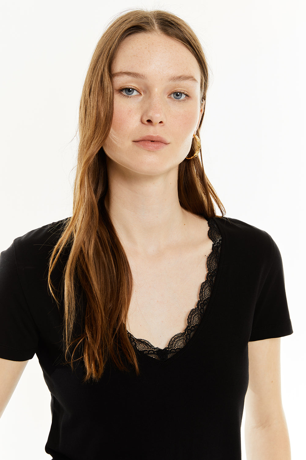 Women's short-sleeved T-shirt with a V-neck and lace trim. Sustainable garment.