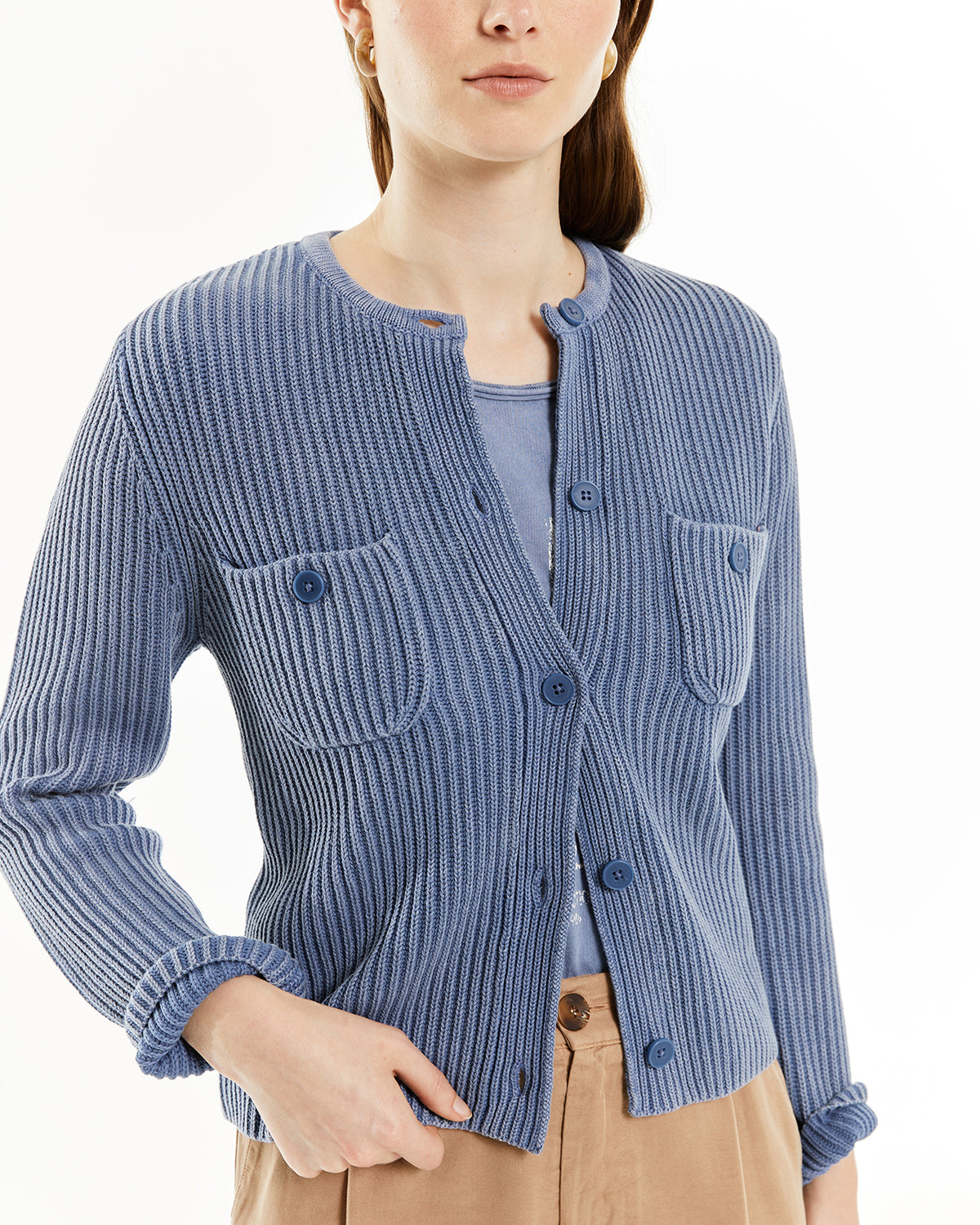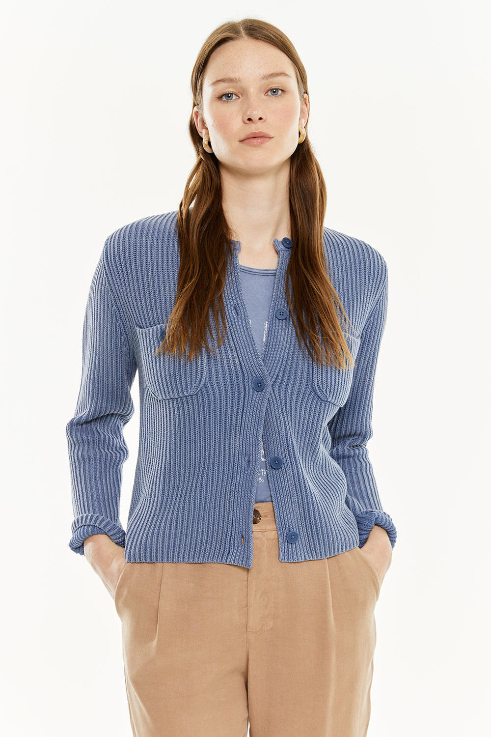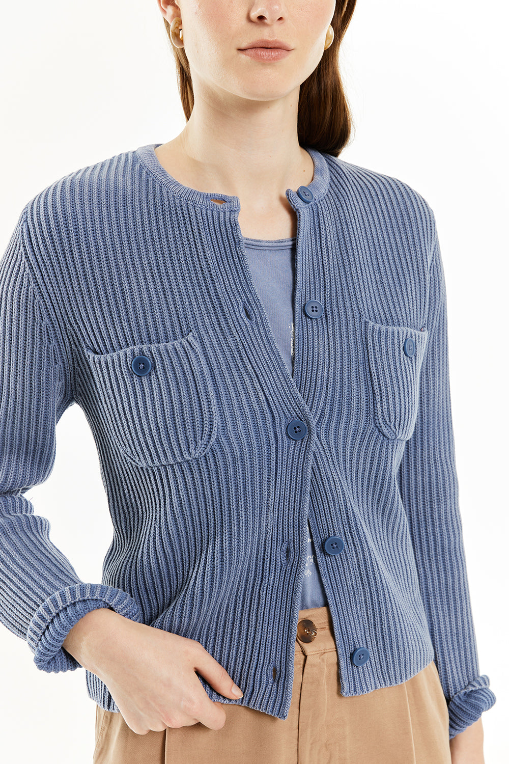 Knitted cardigan with a round neck, front button closure, and buttoned patch pockets.