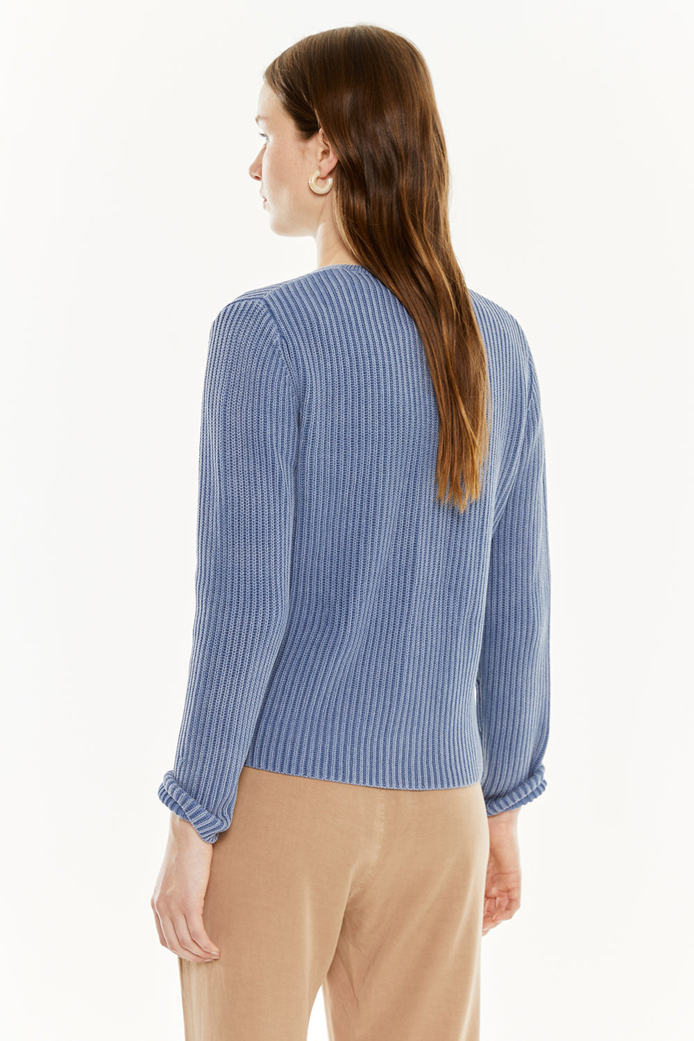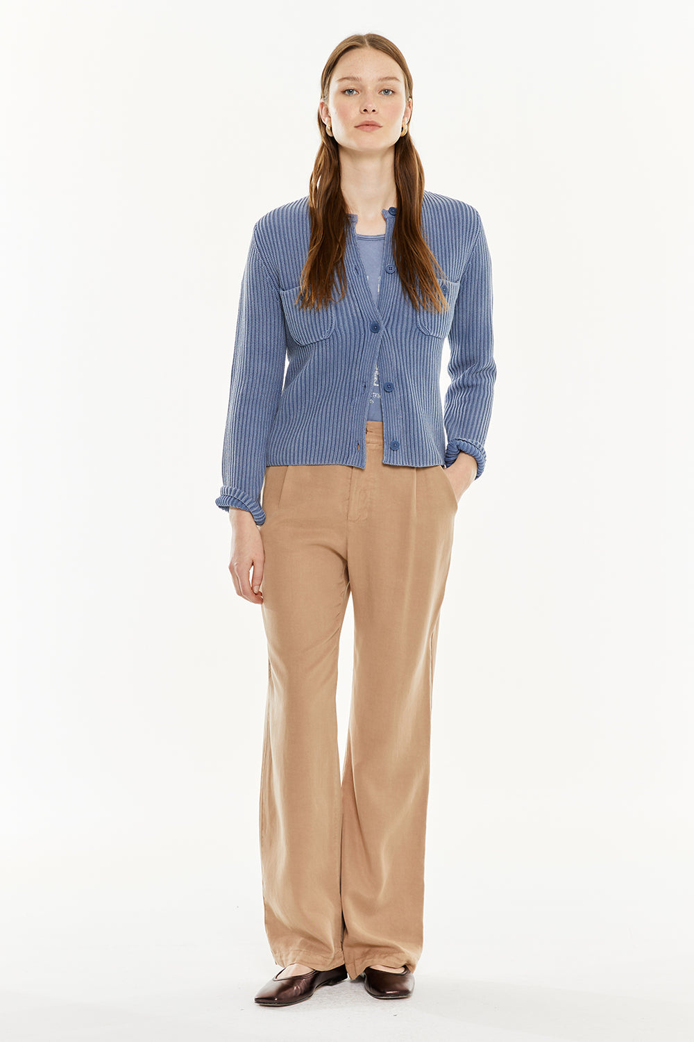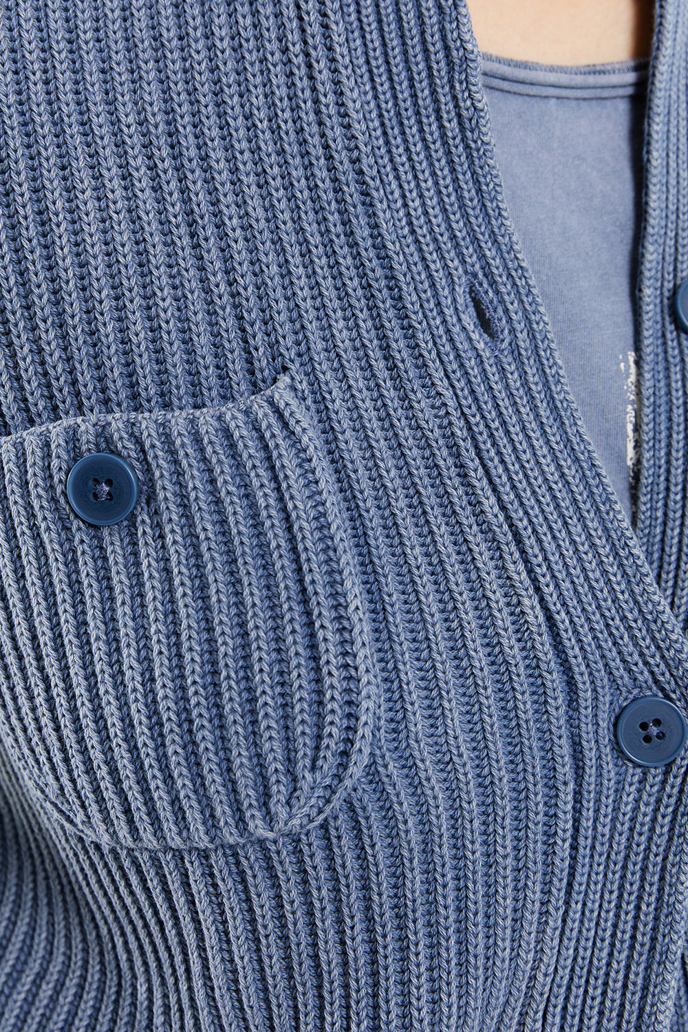 Knitted cardigan with a round neck, front button closure, and buttoned patch pockets.