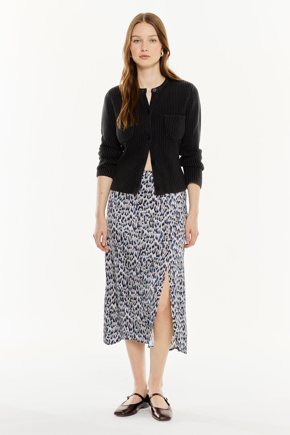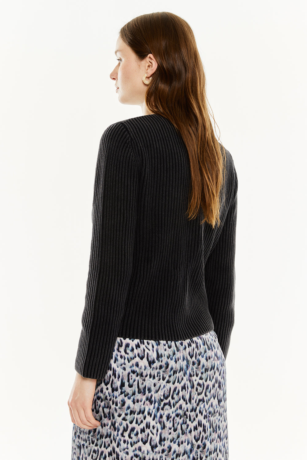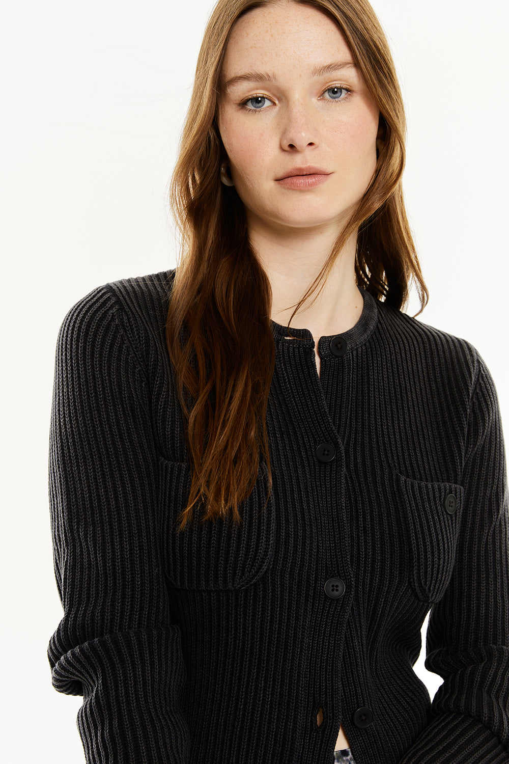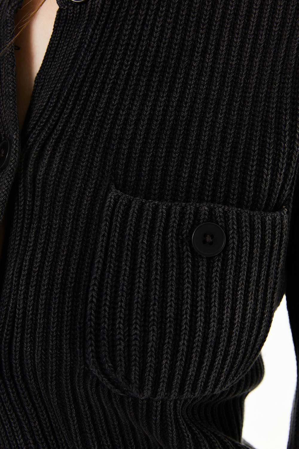 Knitted cardigan with a round neck, front button closure, and buttoned patch pockets.