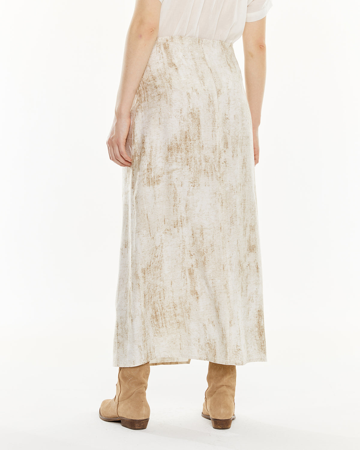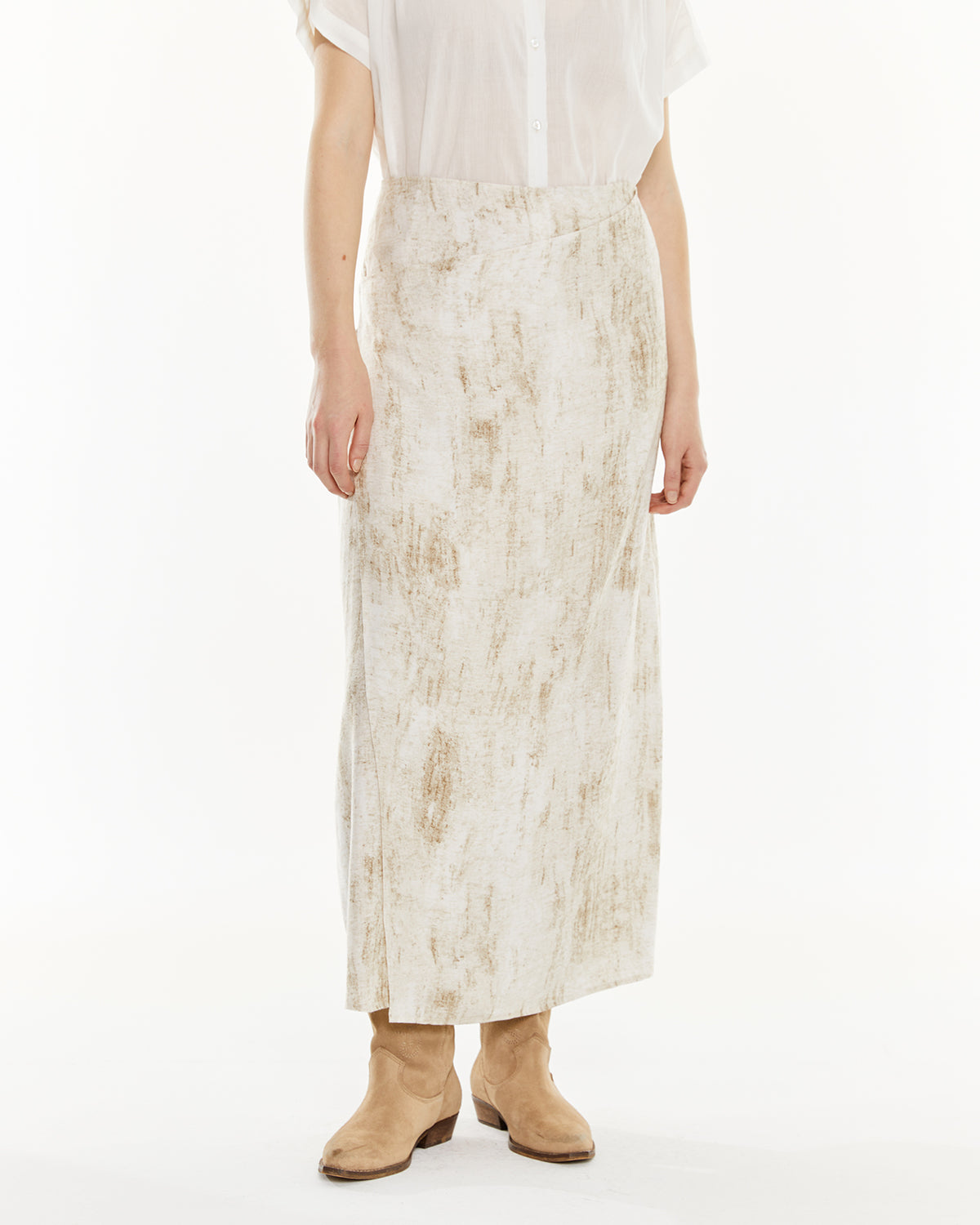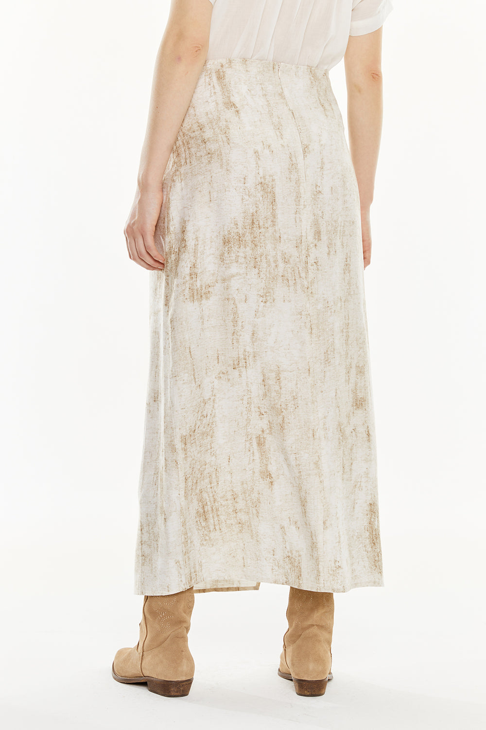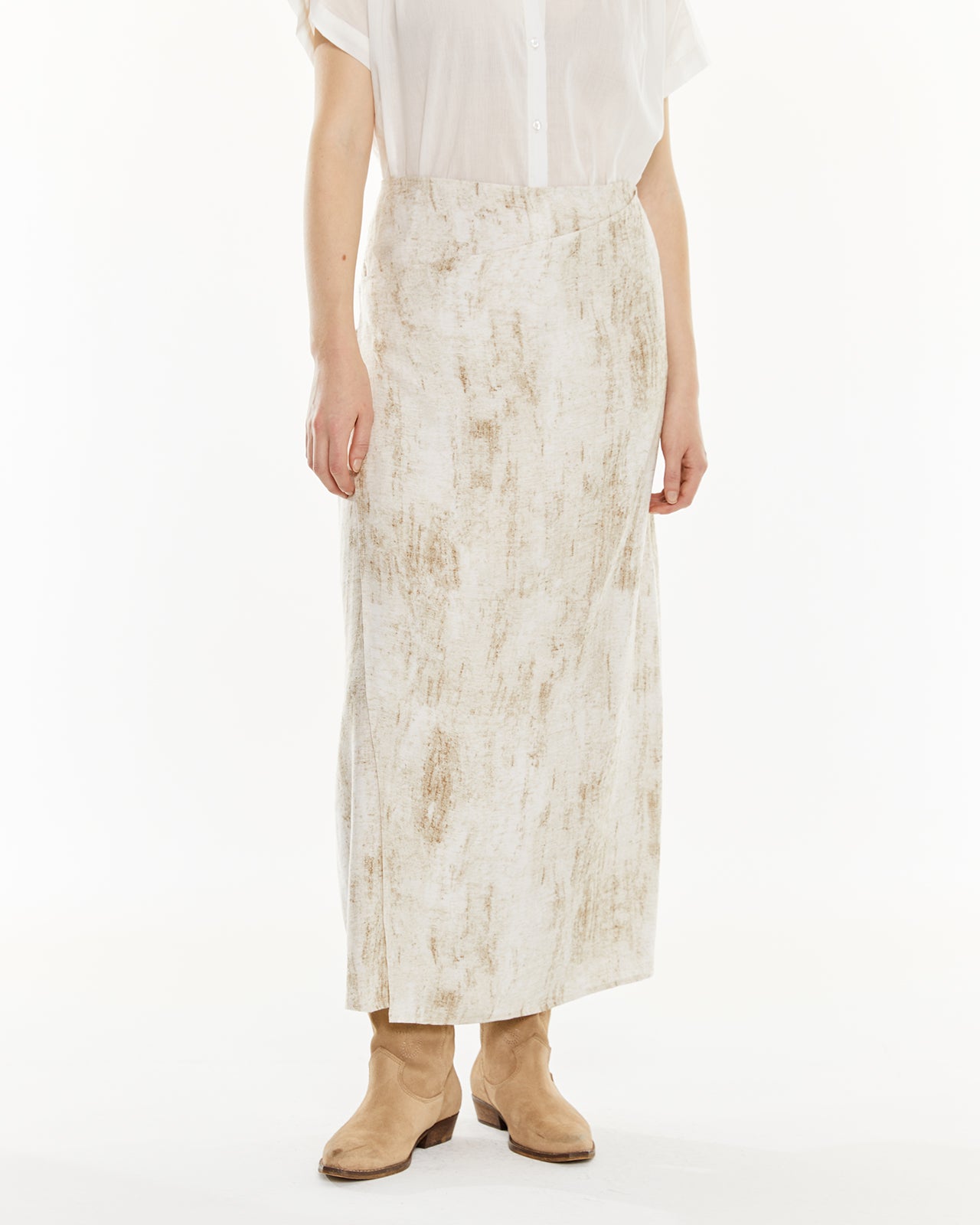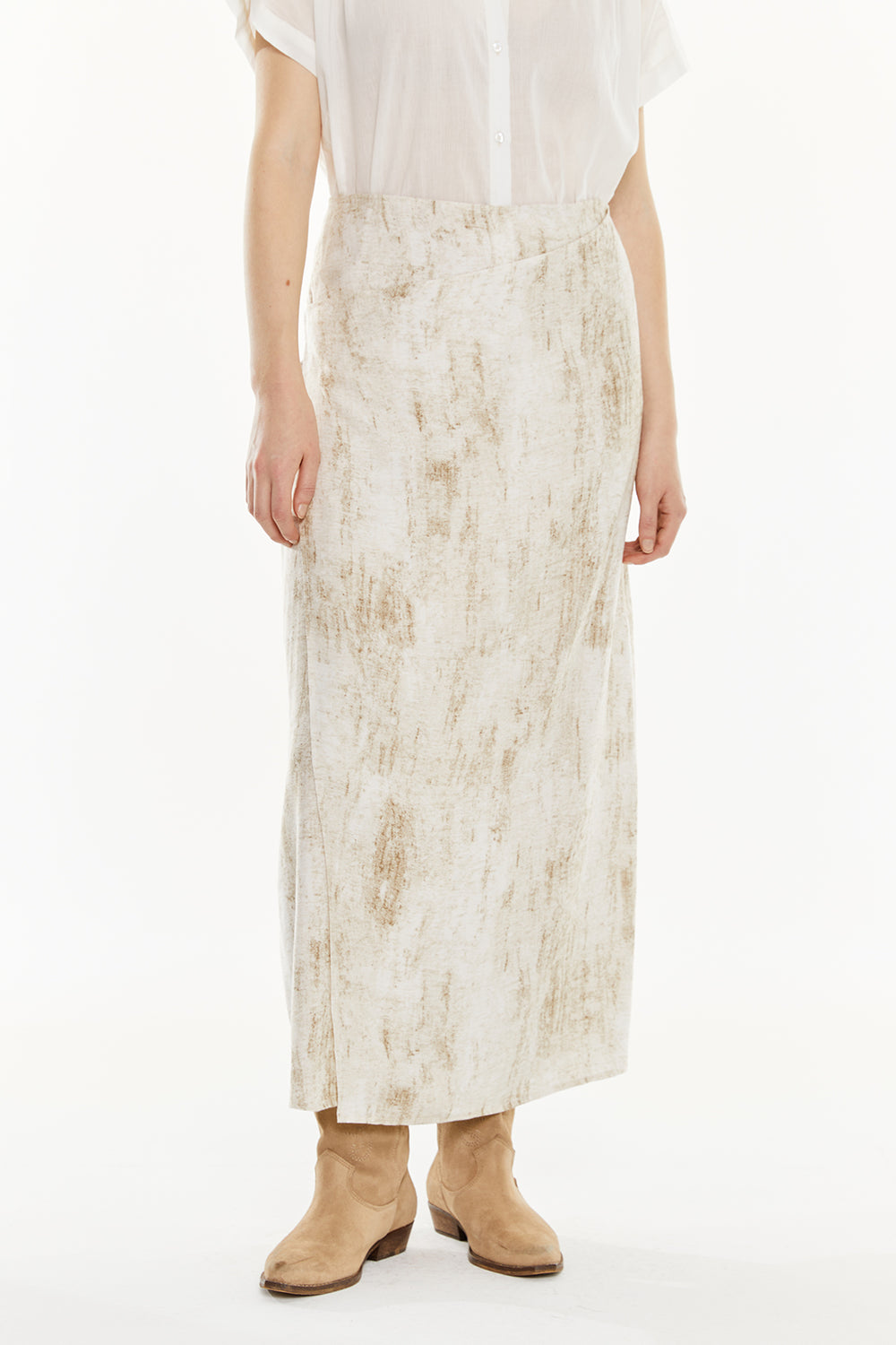 Women's sarong-style midi skirt with a tie-dye print and side zipper closure. Sustainable garment.