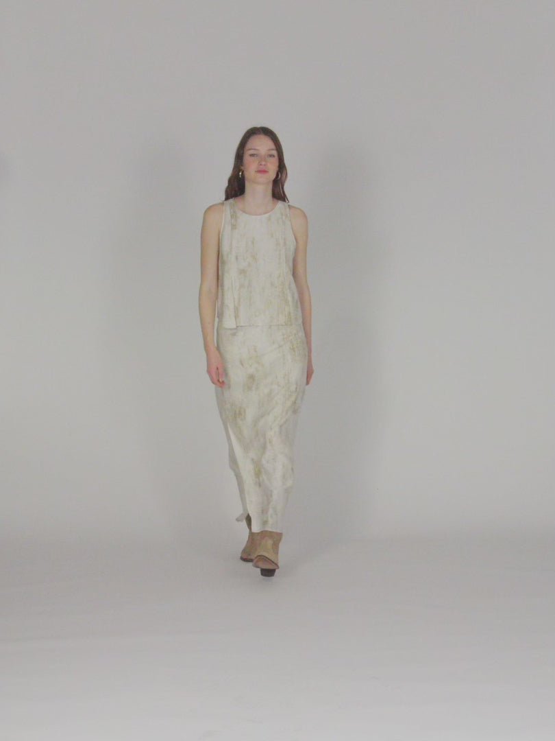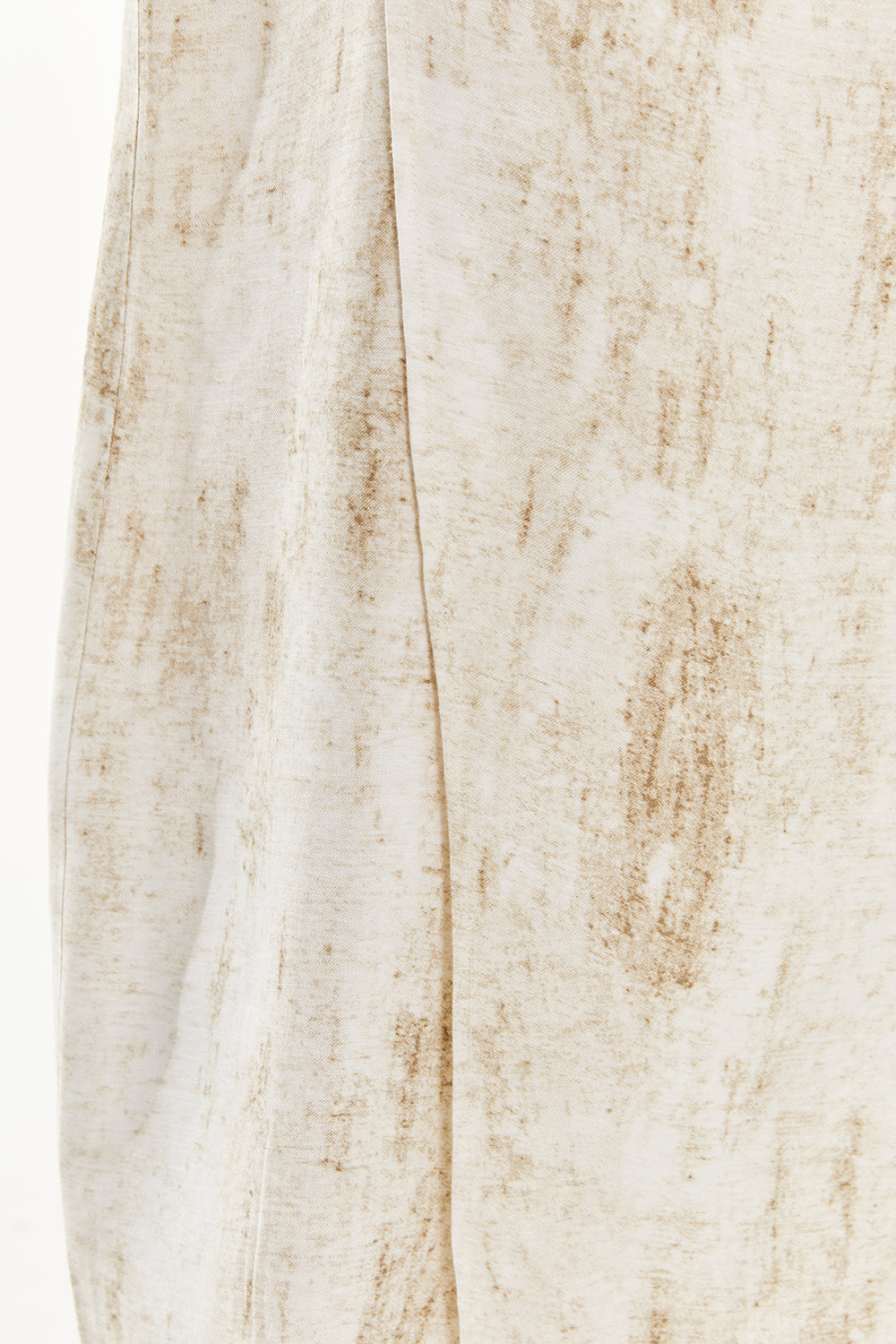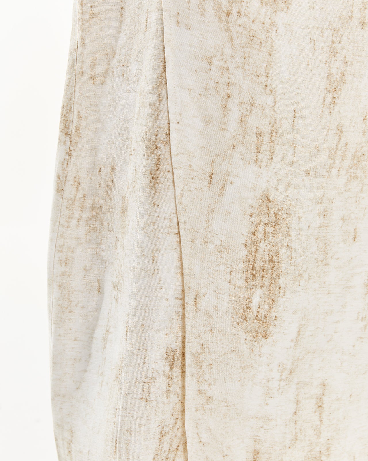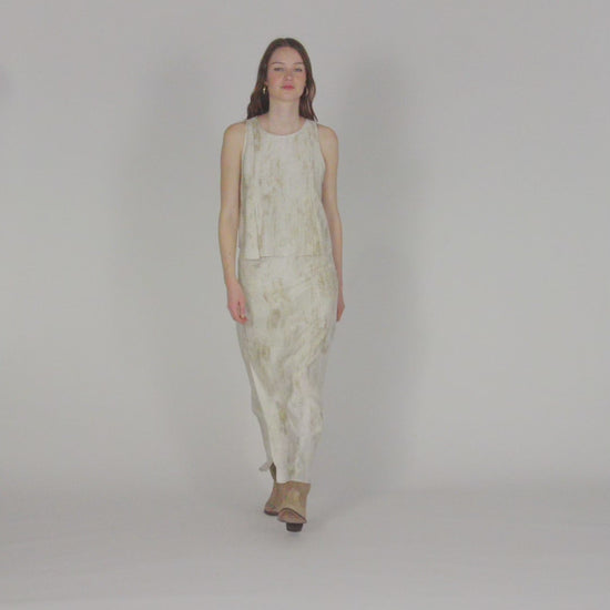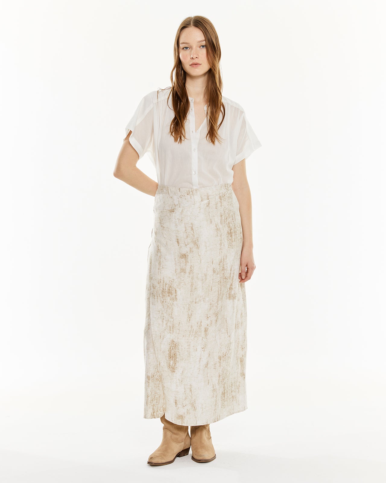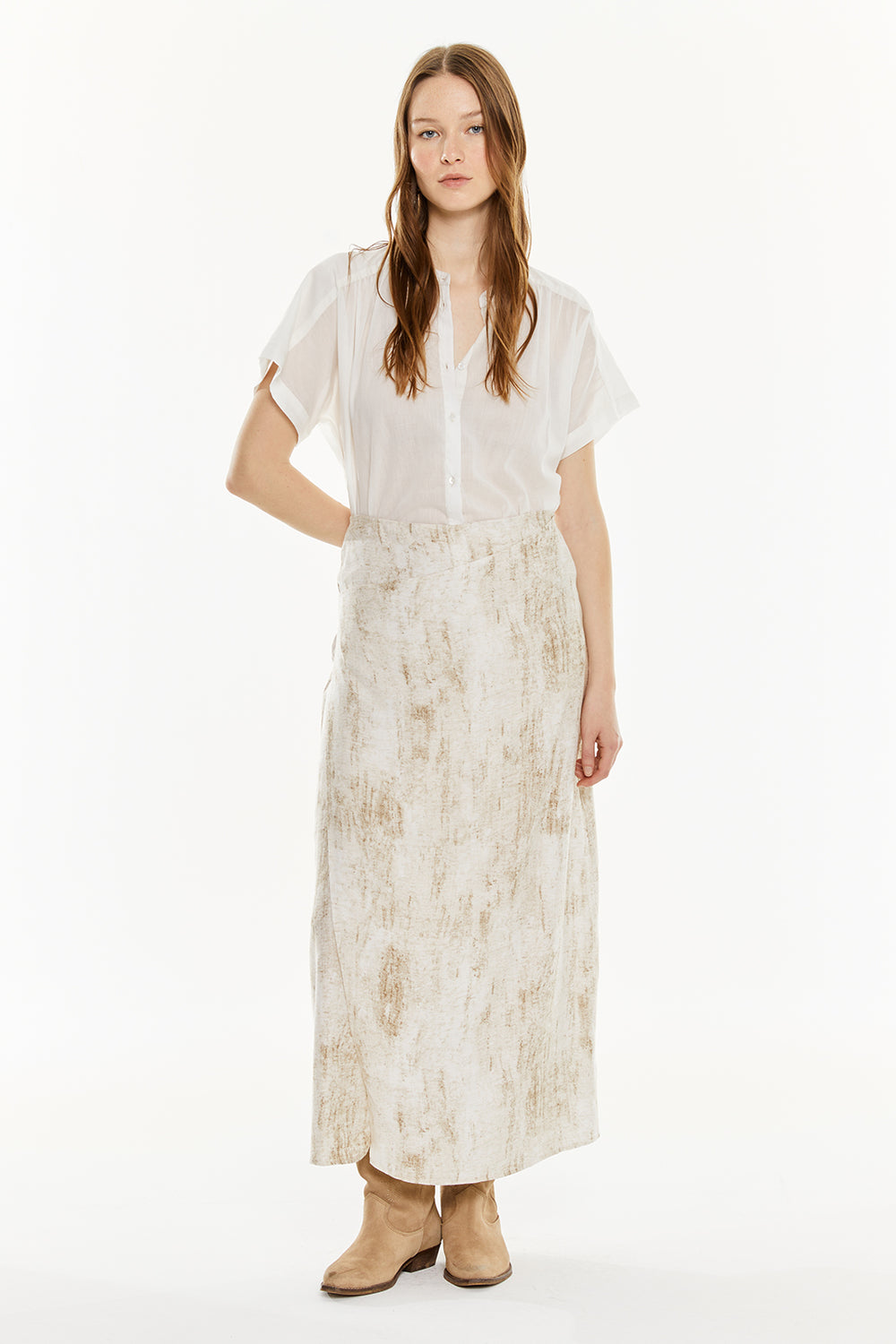 Women's sarong-style midi skirt with a tie-dye print and side zipper closure. Sustainable garment.