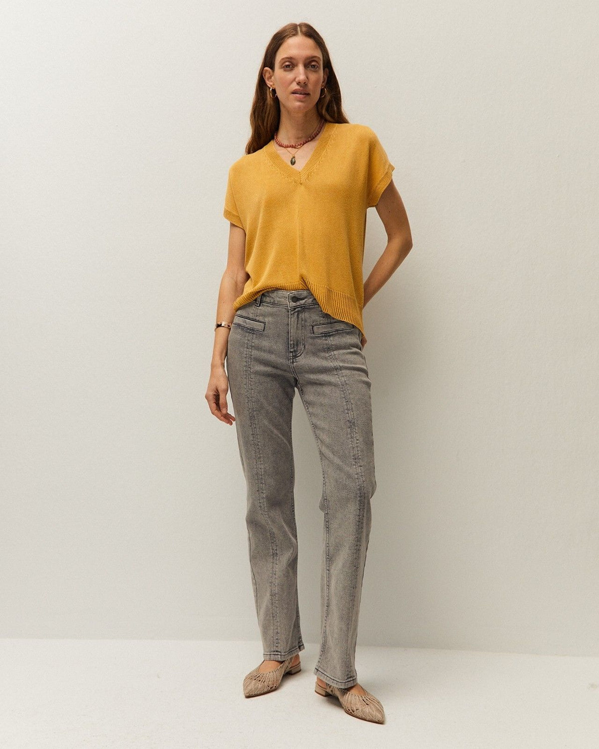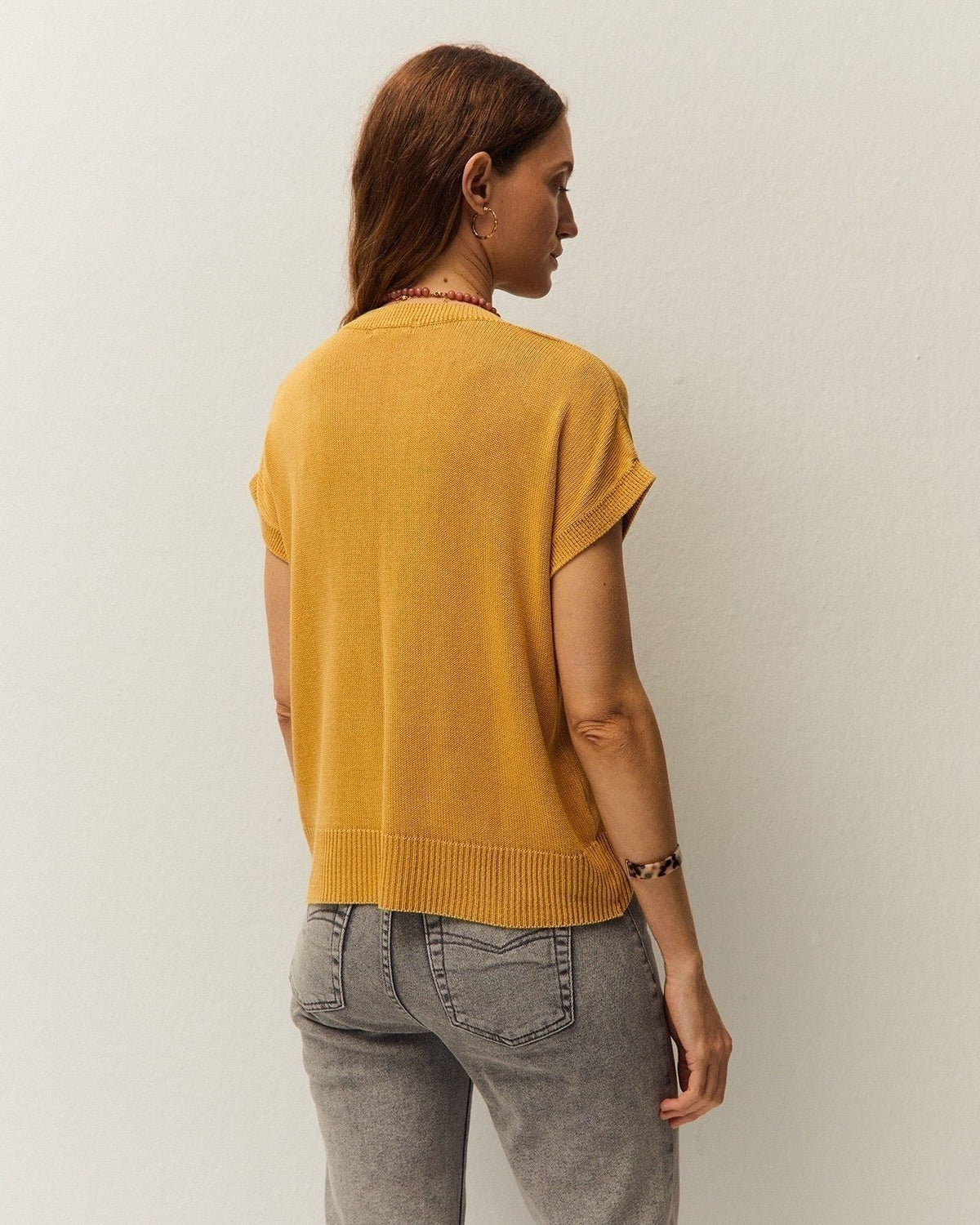 Jersey con cuello pico y manga corta. Tintura corrosiva. Prenda sostenible.