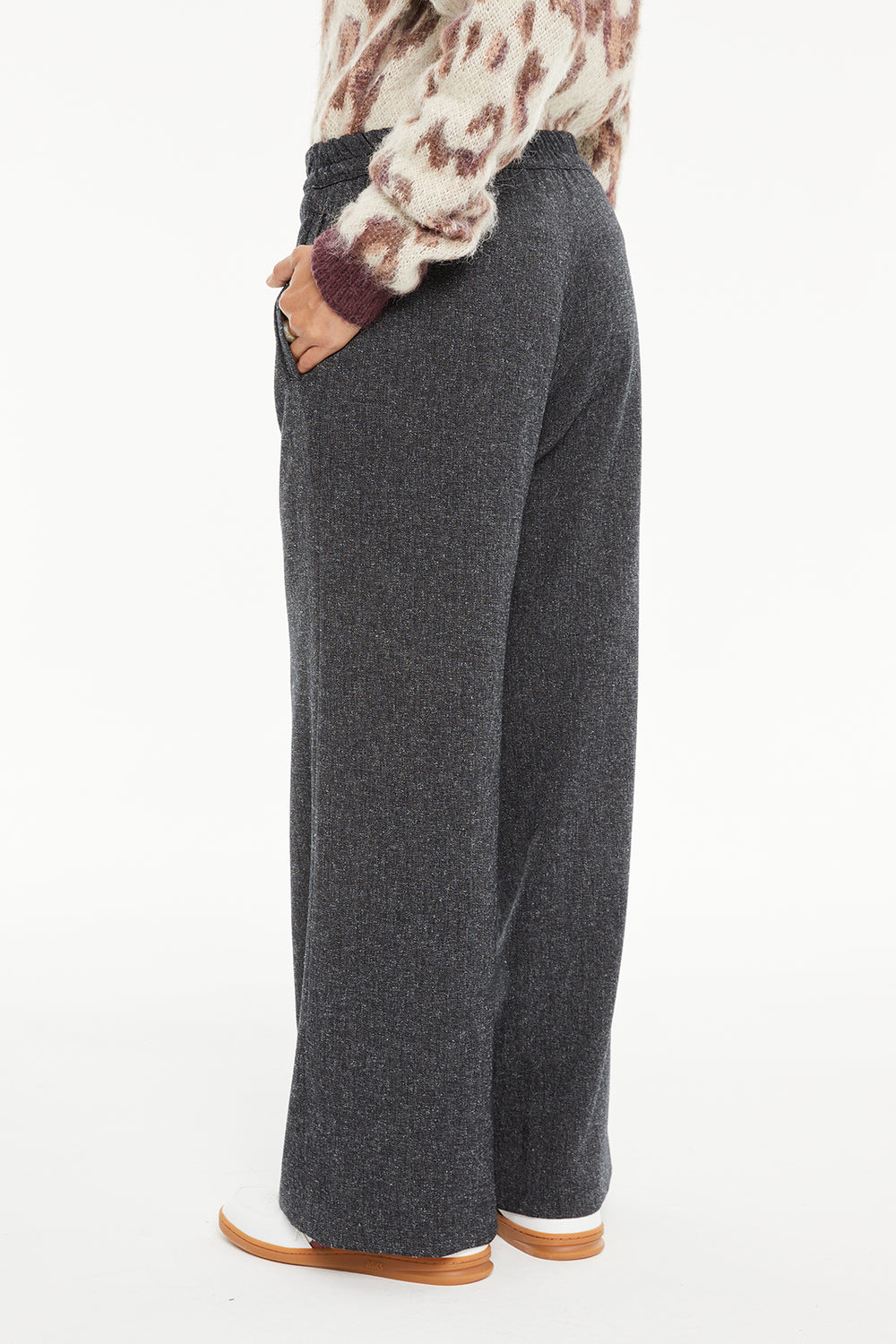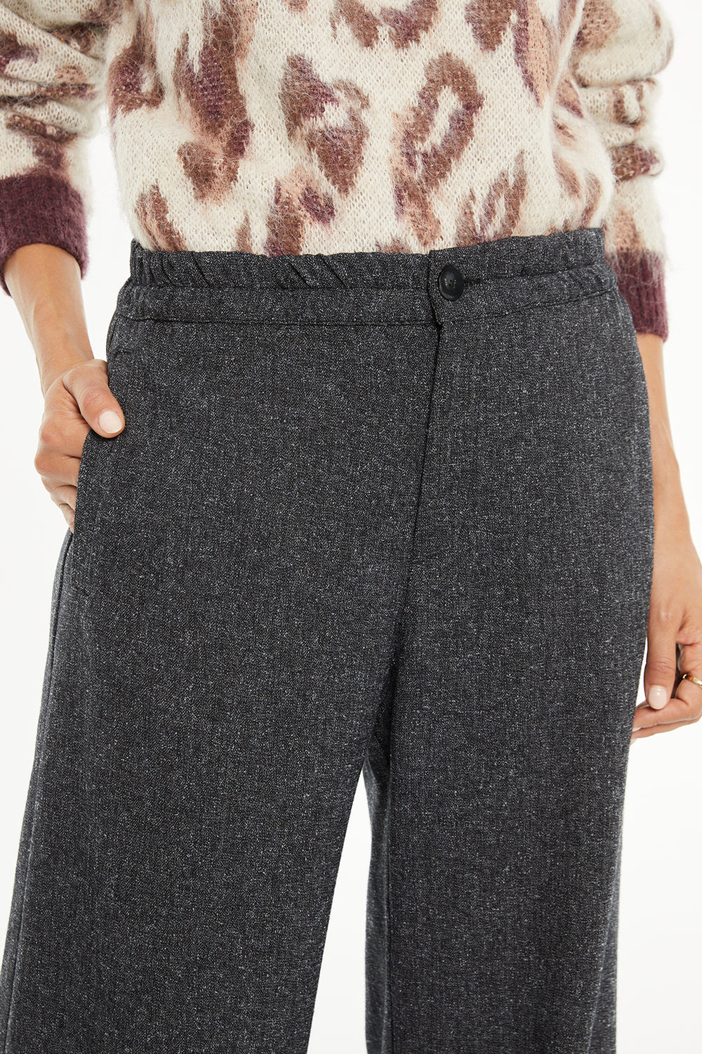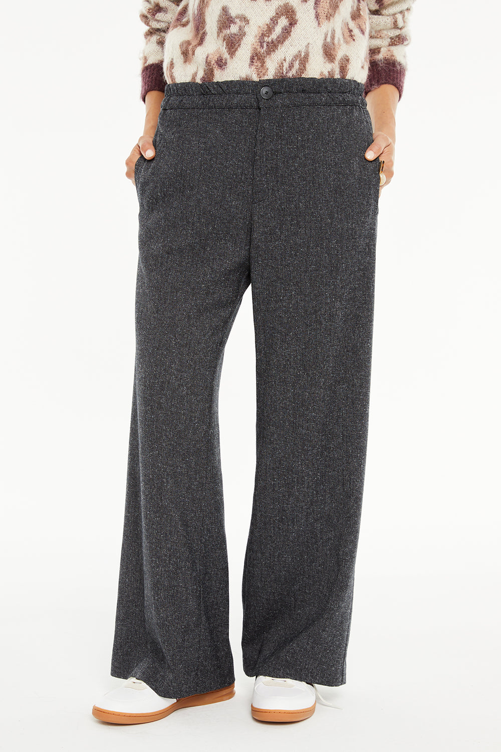 Women's wide-leg trousers with welt pockets at the front, elasticated waistband and button closure.