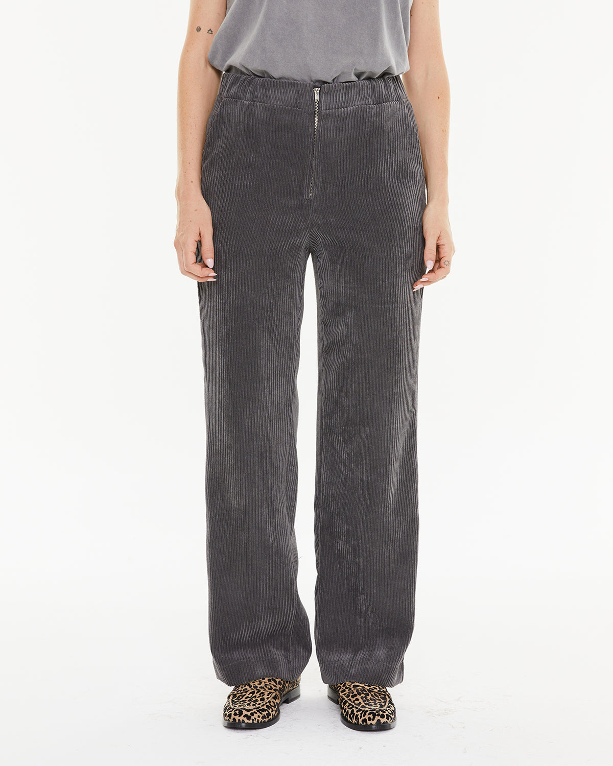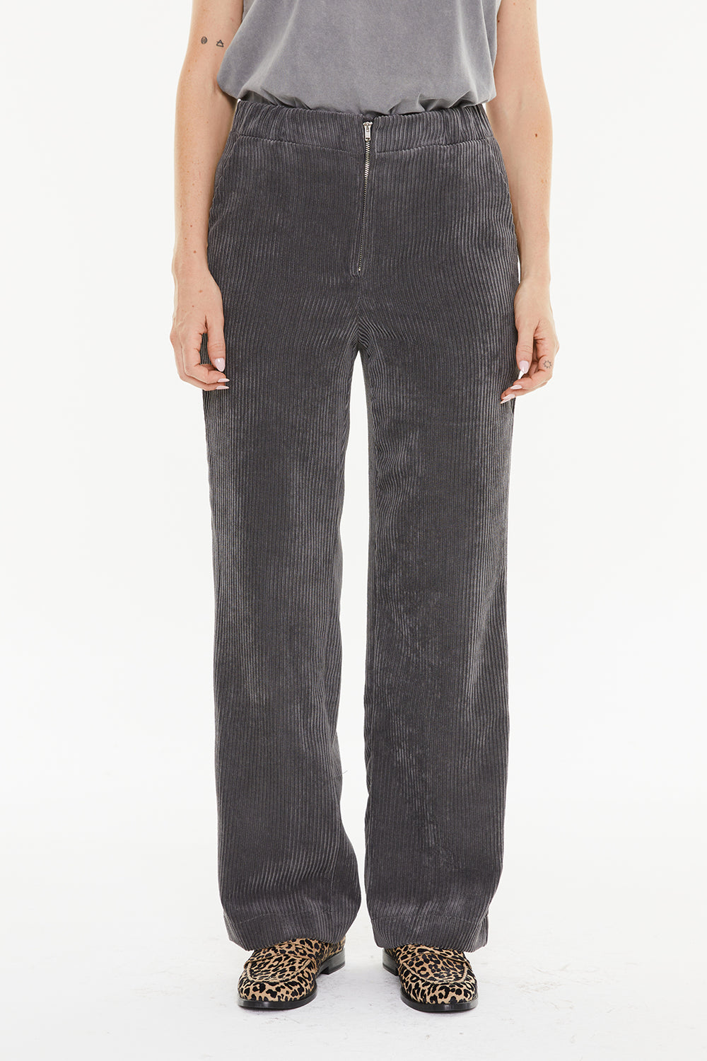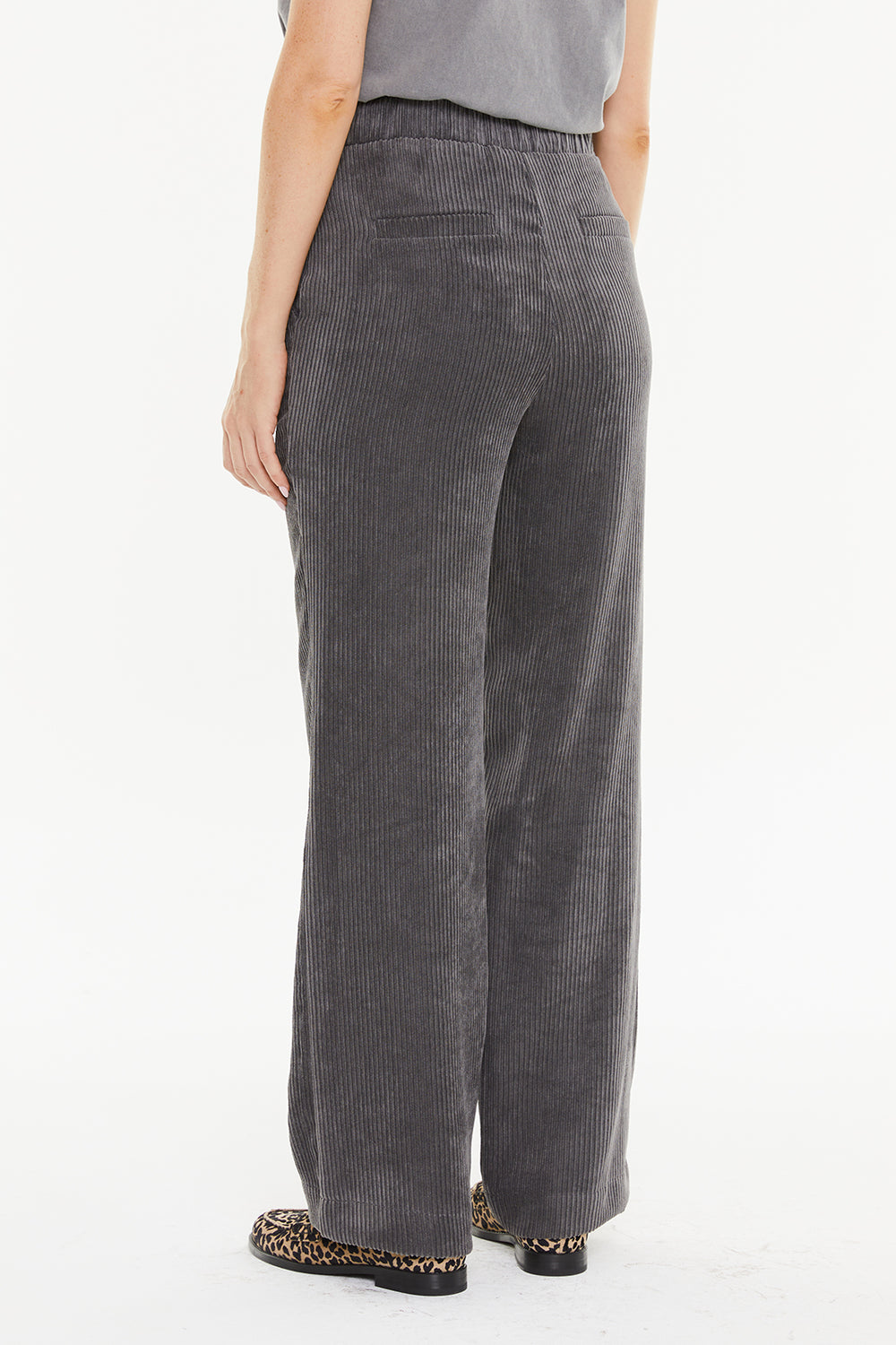 Women's corduroy trousers with elasticated back, ribbed detailing on the front, and zip fastening. Sustainable garment.