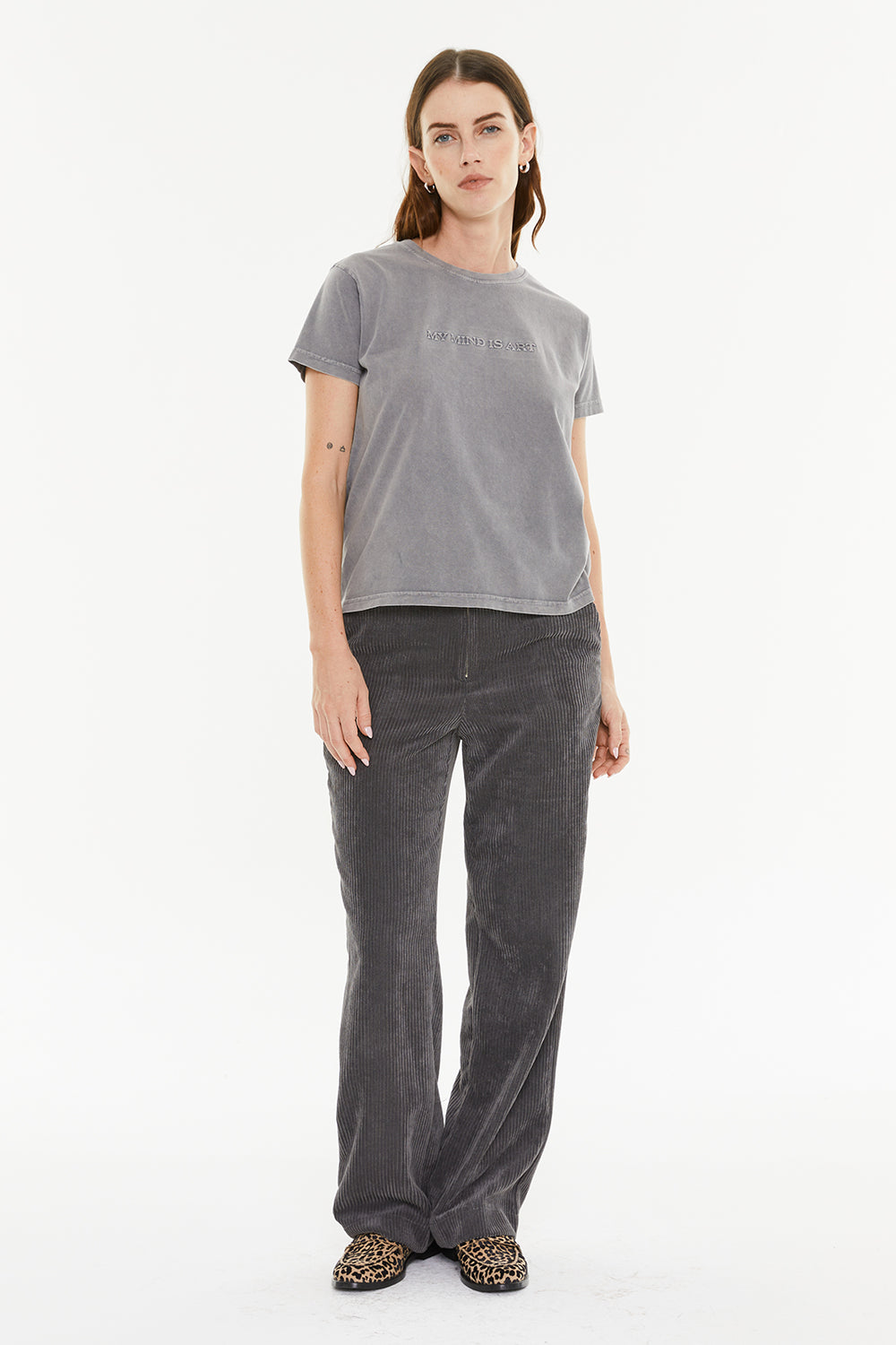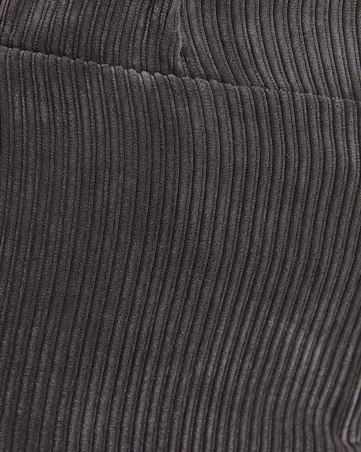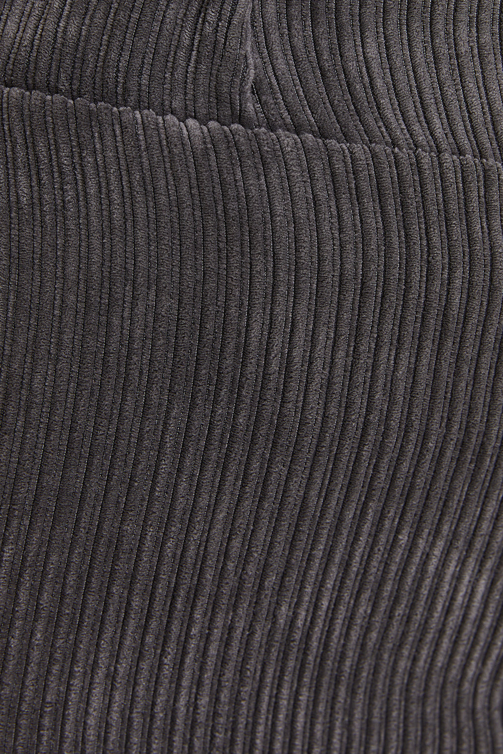 Women's corduroy trousers with elasticated back, ribbed detailing on the front, and zip fastening. Sustainable garment.