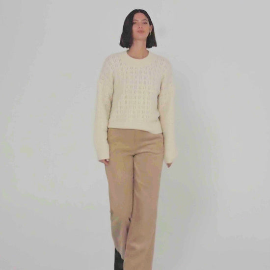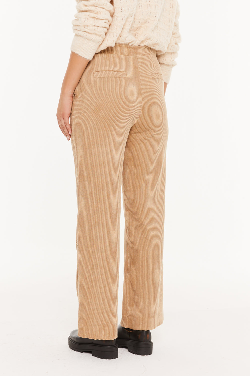 Pantalón de pana de mujer con goma en la espalda, detalle de nervios en el delantero y cierre con cremallera. Prenda sostenible.