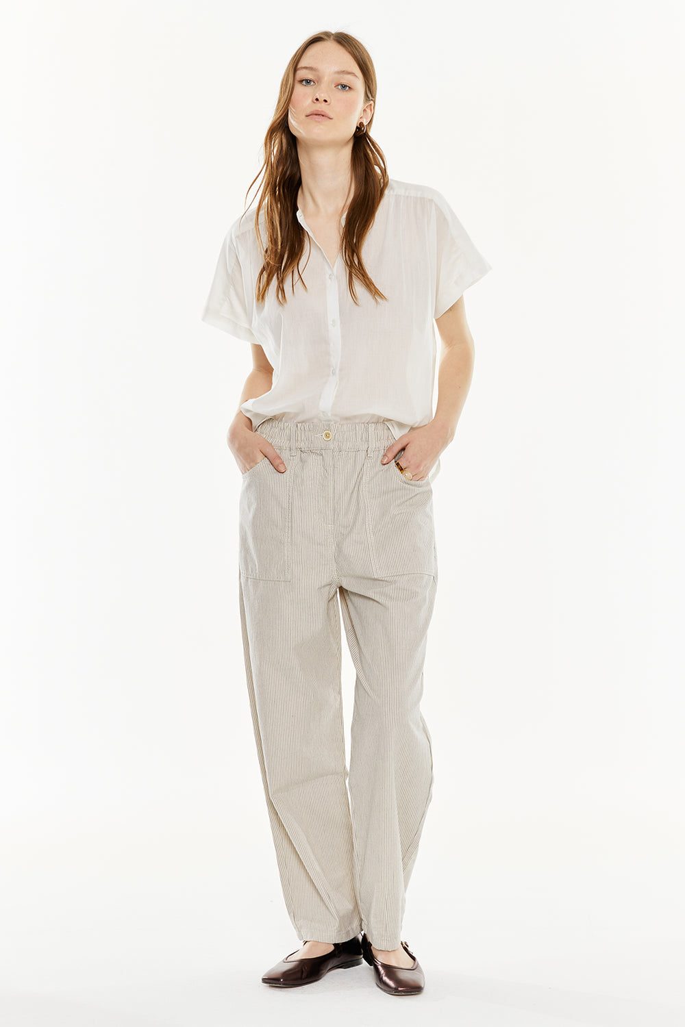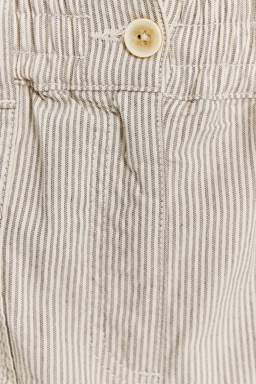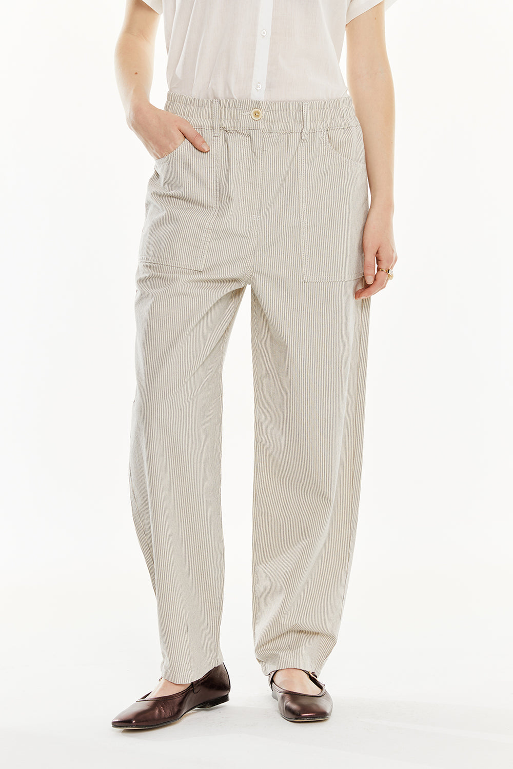 Women's striped trousers with an elastic waistband and button. Large front pockets.