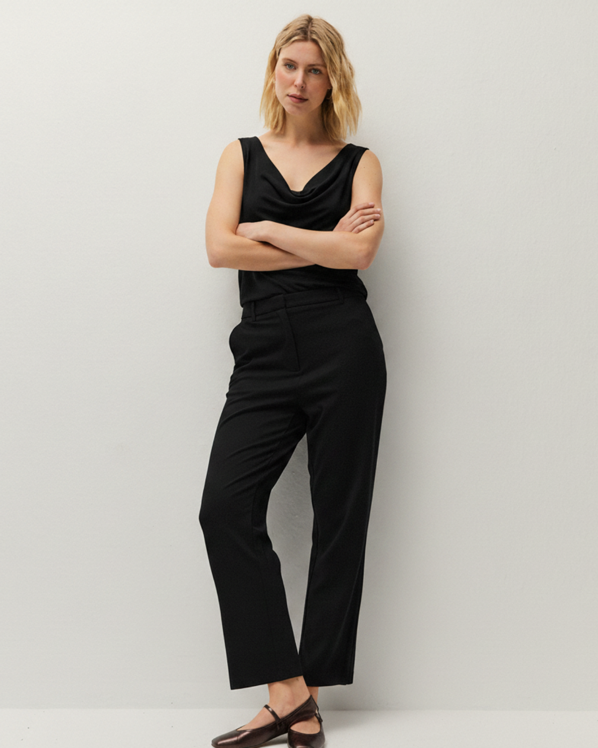 Women's sleeveless top with a draped neckline, made from a flowing fabric. Sustainable garment.