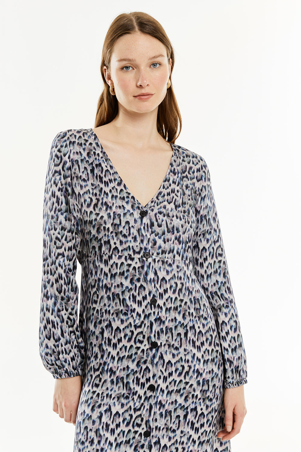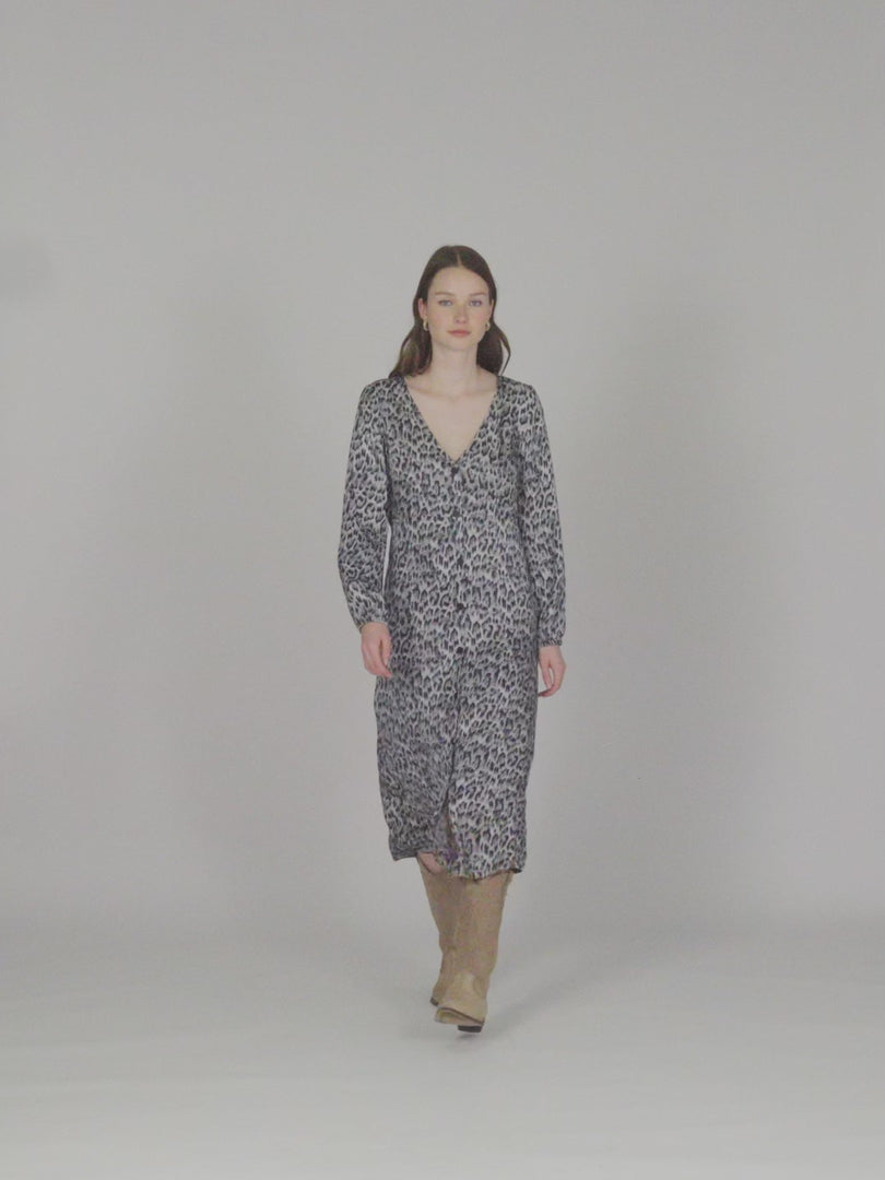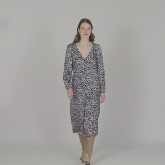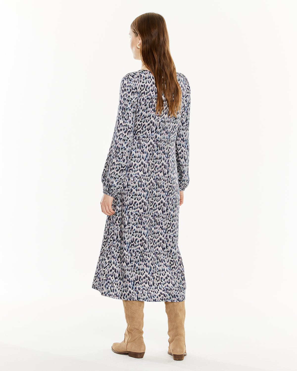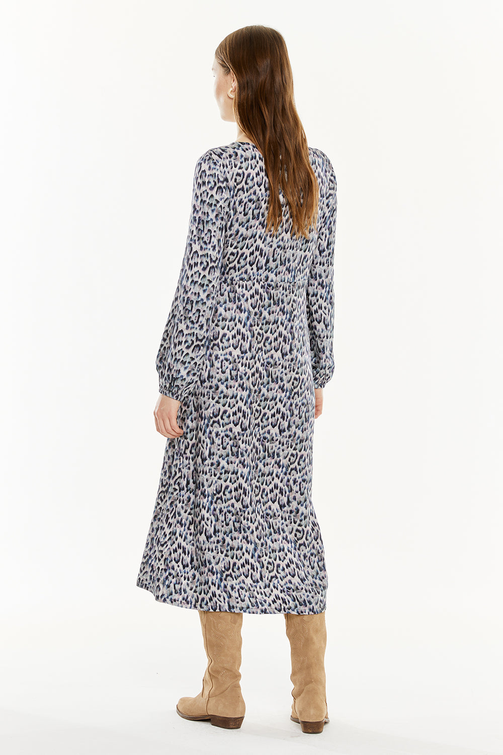 Women's midi dress with an animal print, V-neckline, and long sleeves with elastic cuffs. Sustainable garment.