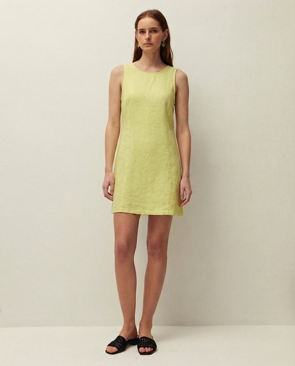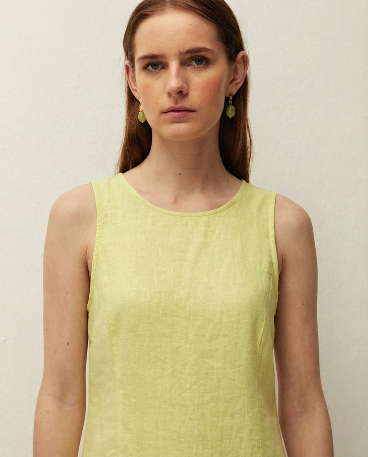 Vestido corto de lino con escote redondo y sin mangas. Pinzas en el delantero. Prenda sostenible.