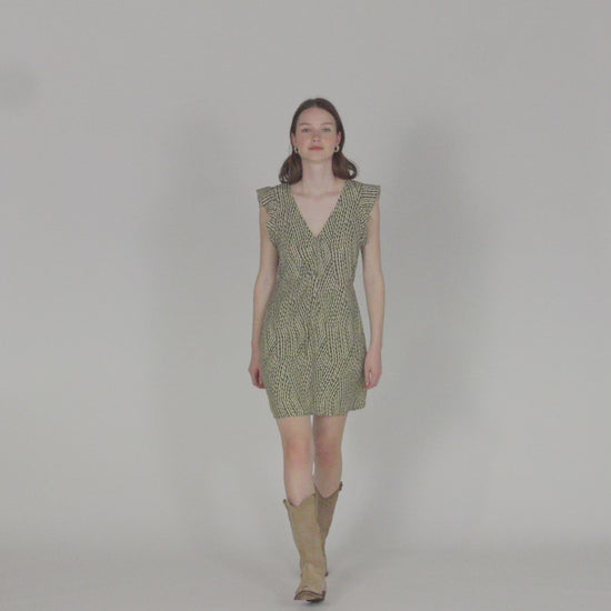 Women's short printed dress with a V-neckline, sleeves with a mini ruffle, and a gathered front. Sustainable garment.