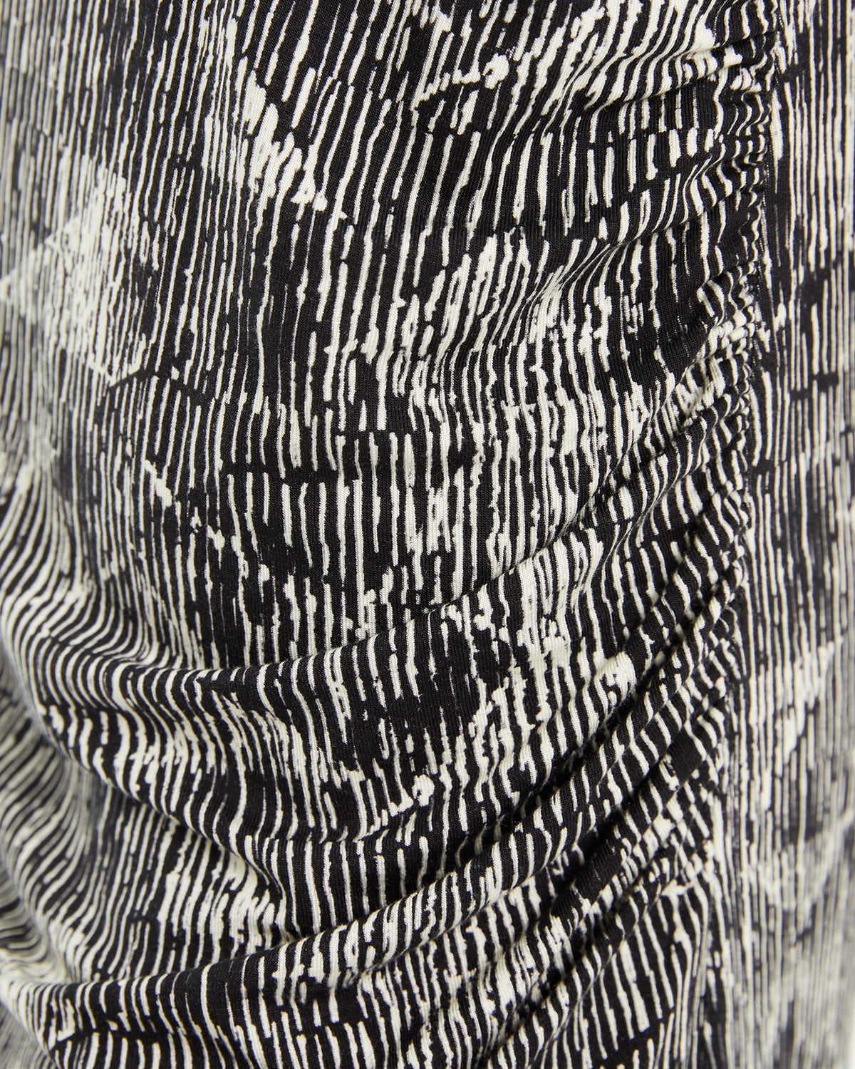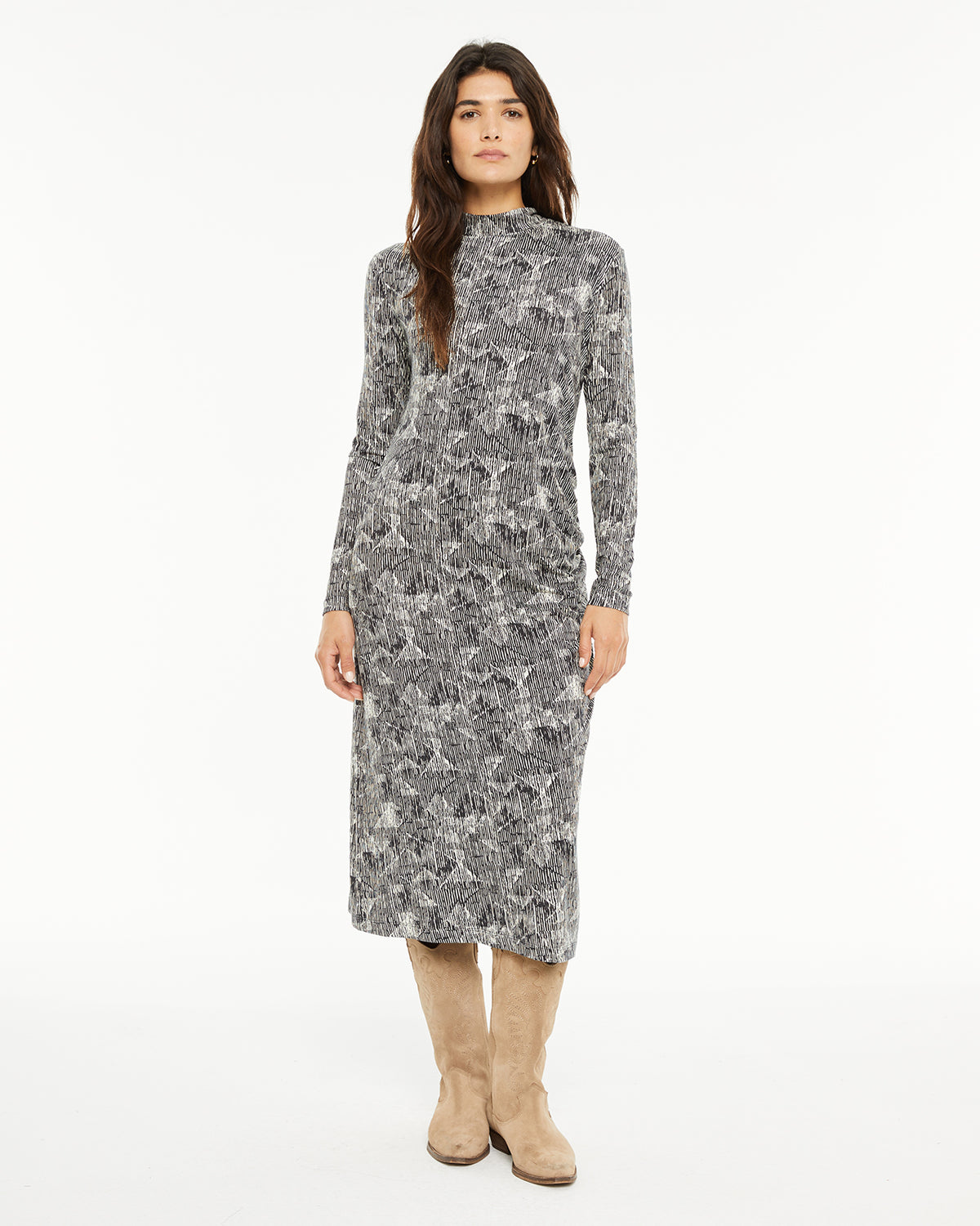 Women's comfortable dress with a two-tone print, round neckline, and long sleeves. Sustainable garment.