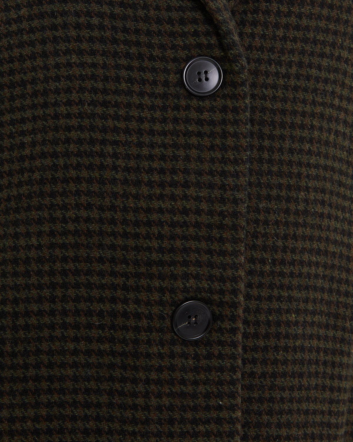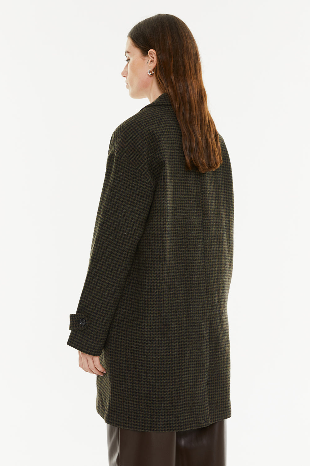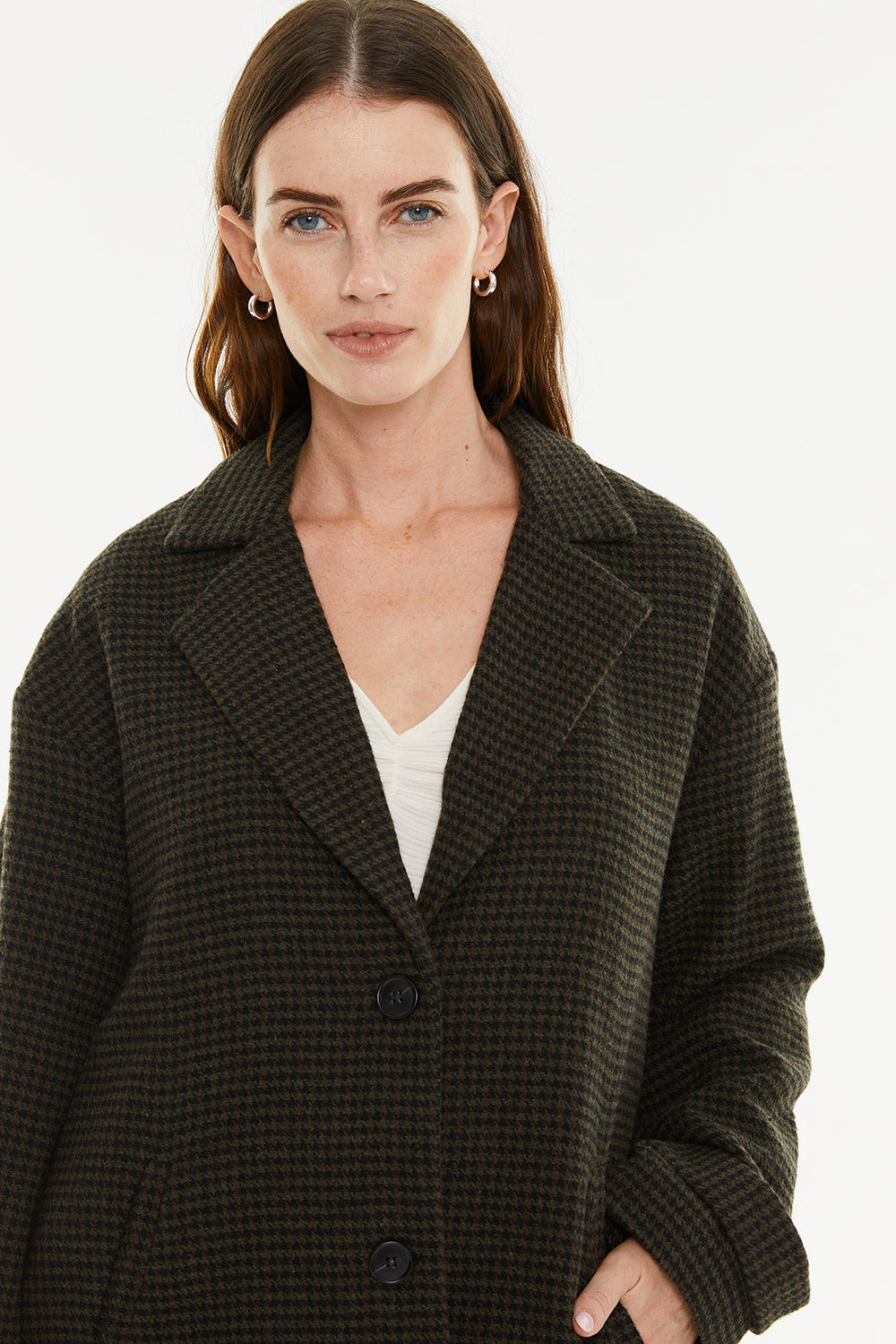 Manteau mi-long pour femme en tissu vichy gris et noir, doté d'un col à revers, de poches passepoilées et d'une fermeture boutonnée.