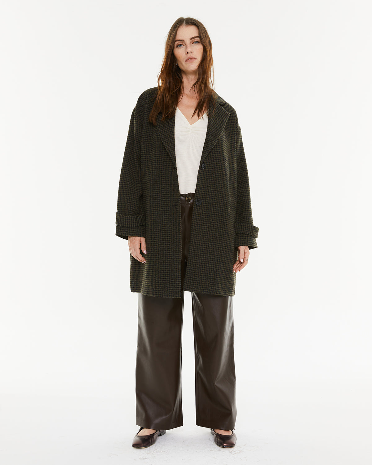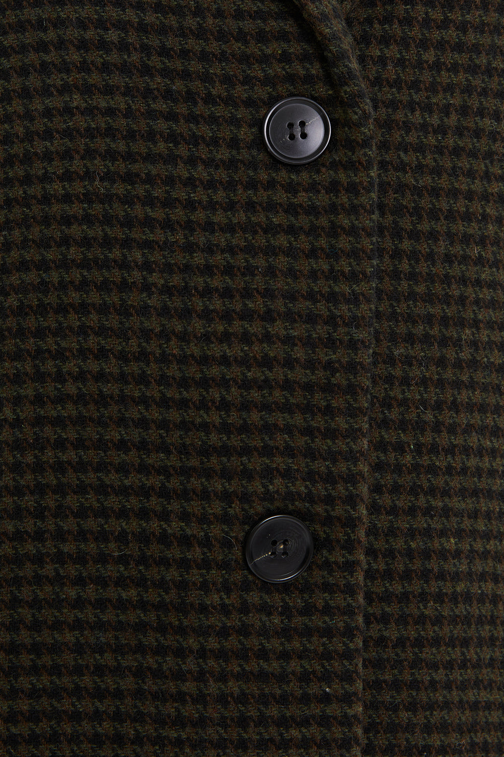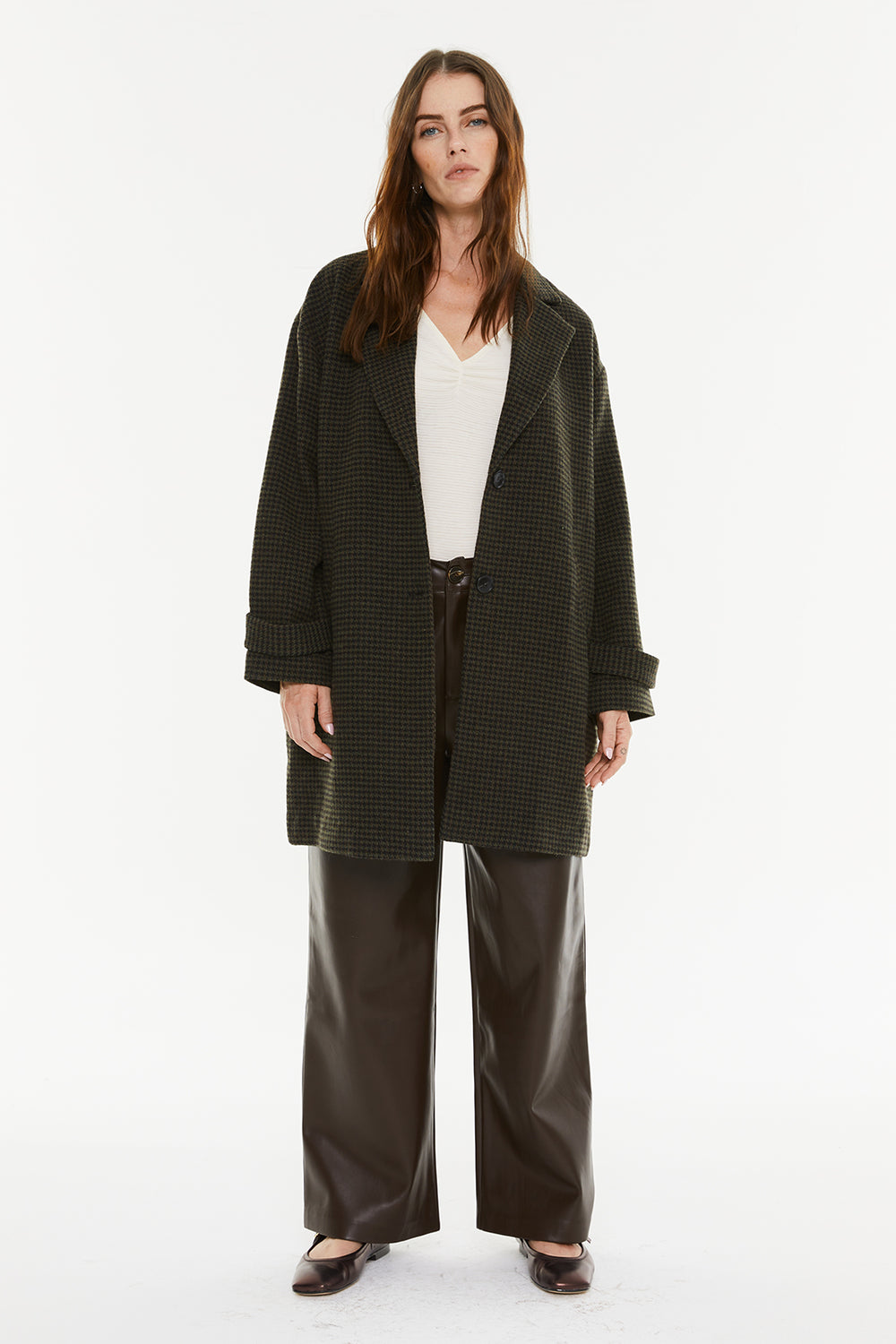 Manteau mi-long pour femme en tissu vichy gris et noir, doté d'un col à revers, de poches passepoilées et d'une fermeture boutonnée.