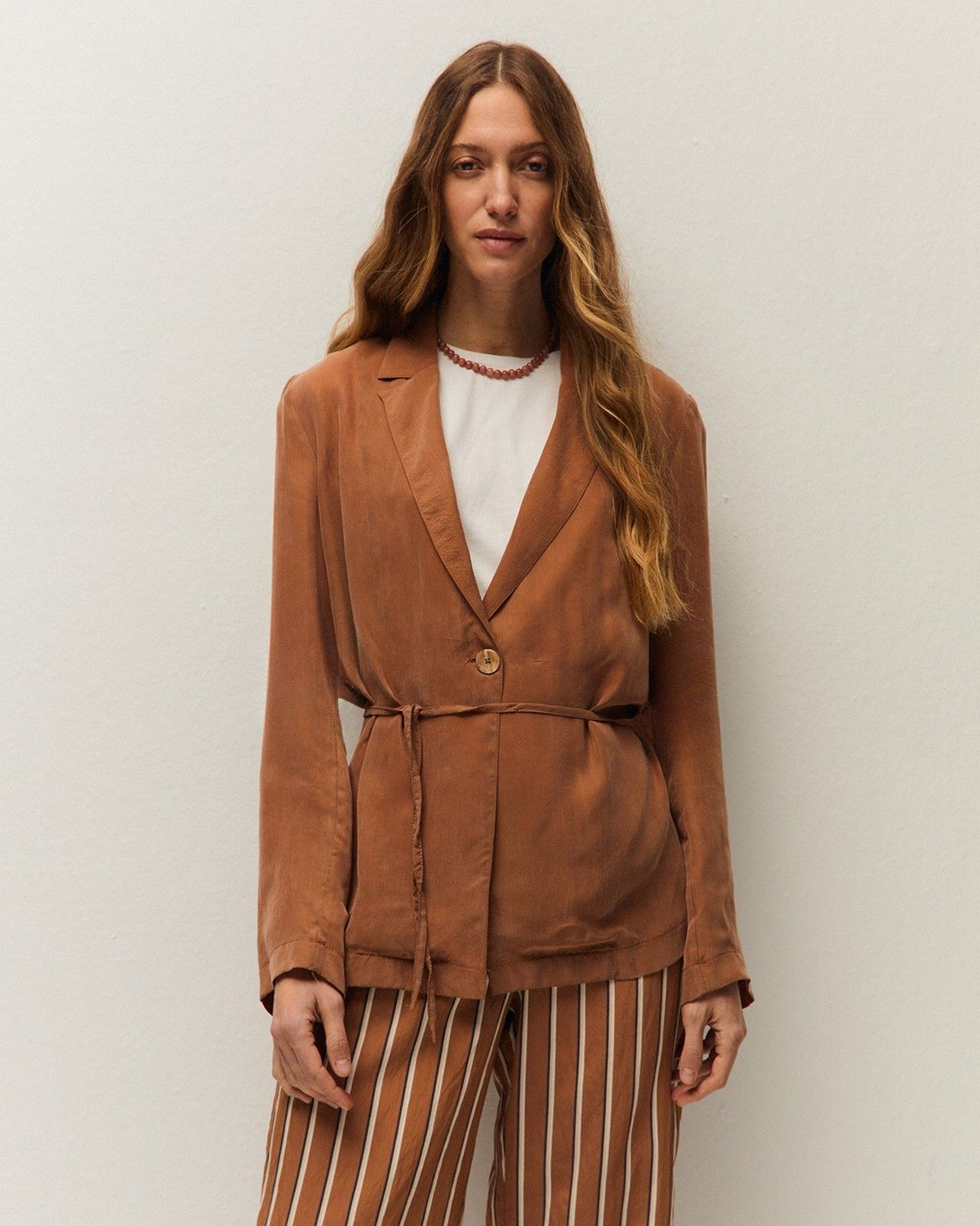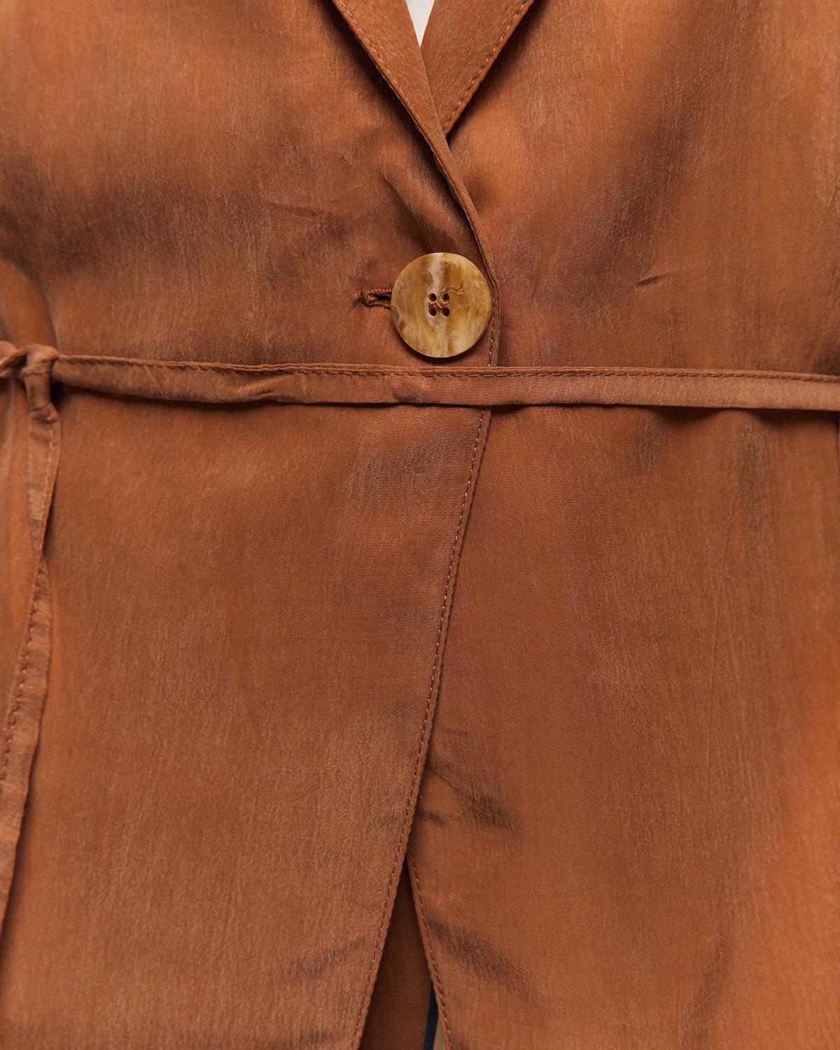 Americana fluida con cuello de solapa y manga larga, confeccionada en tejido de cupro. Detalle de cinturón del mismo tejido. Cierre con botón en el delantero.