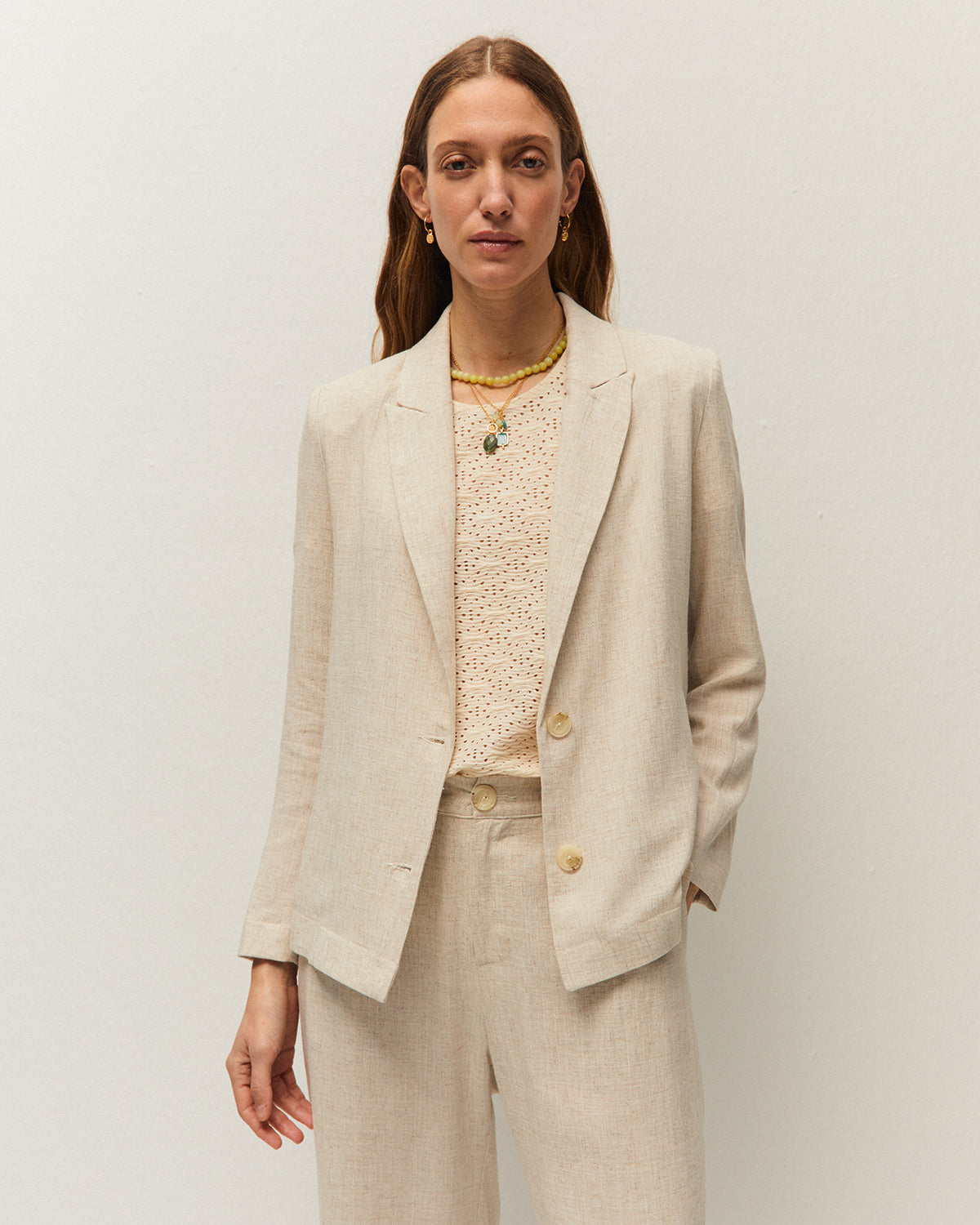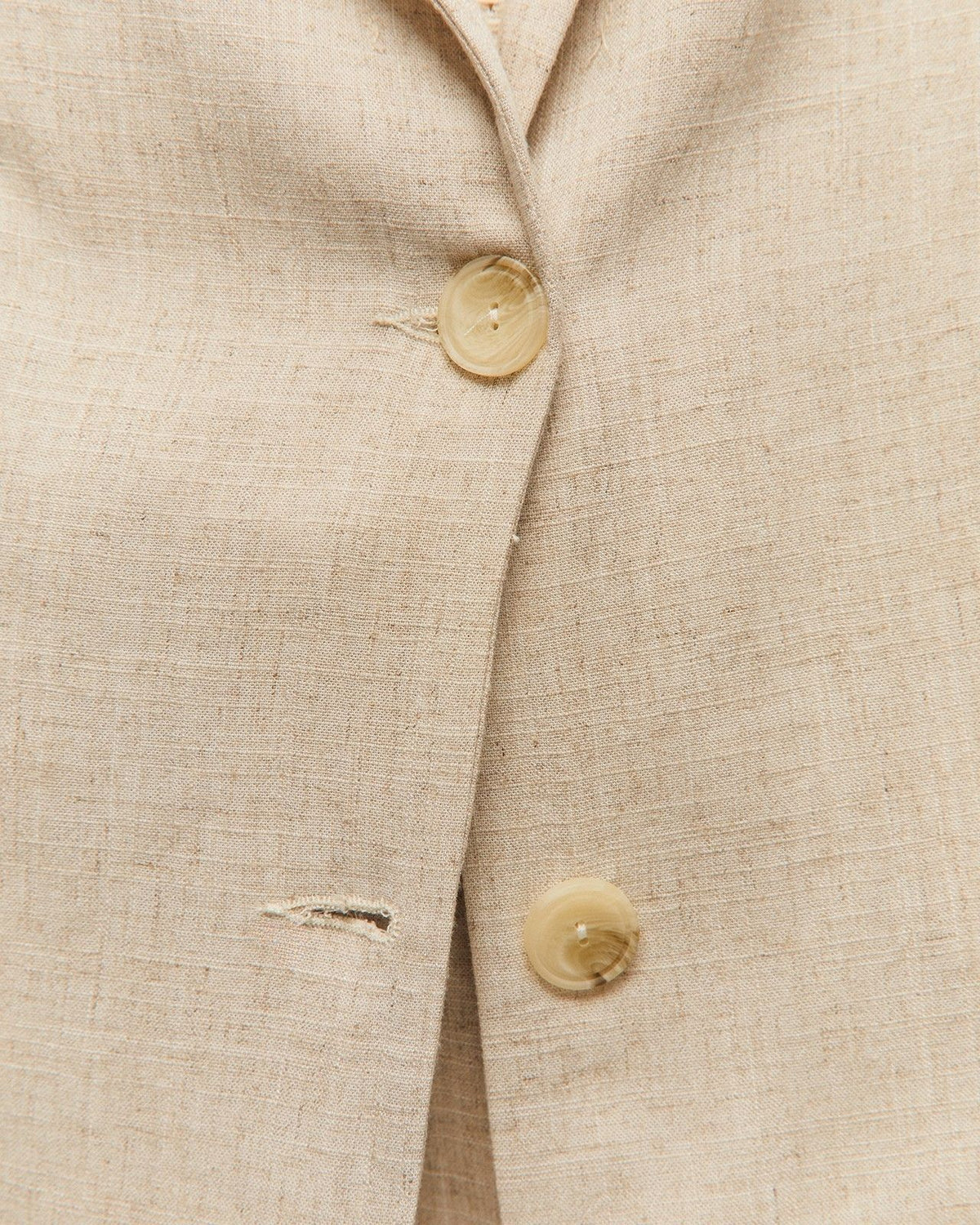 Americana fluida de lino con cuello de solapa y manga larga. Bolsillos de vivo en el delantero. Cierre con dos botones. Prenda sostenible.