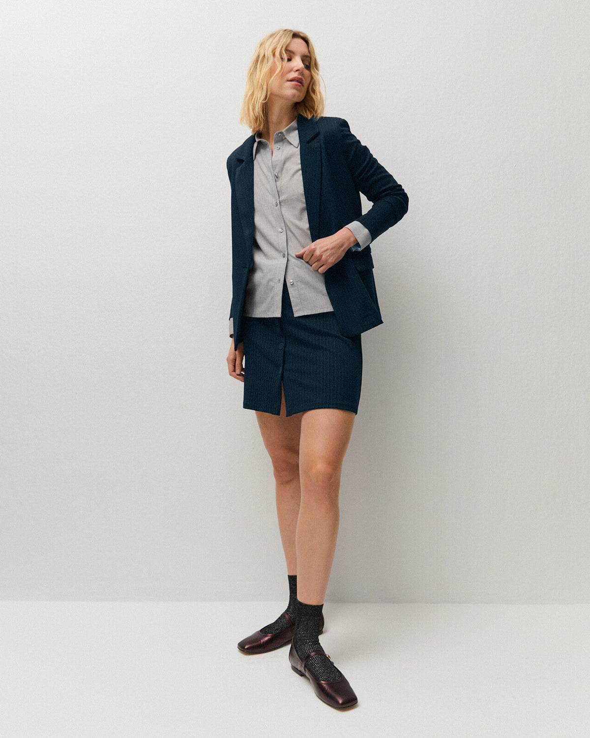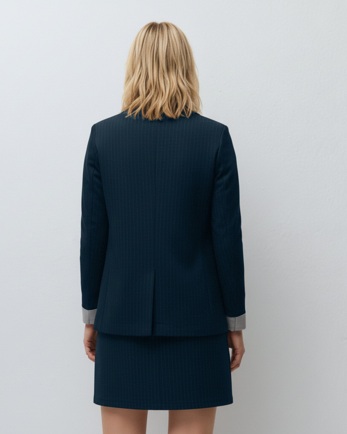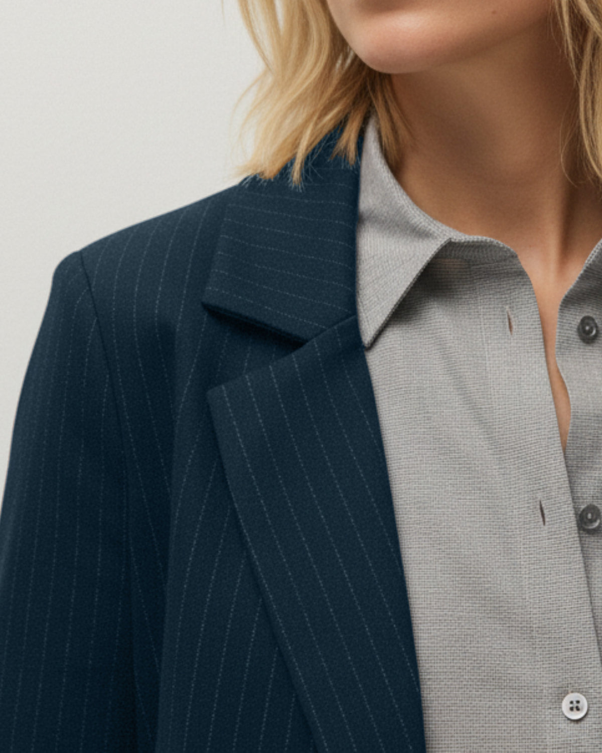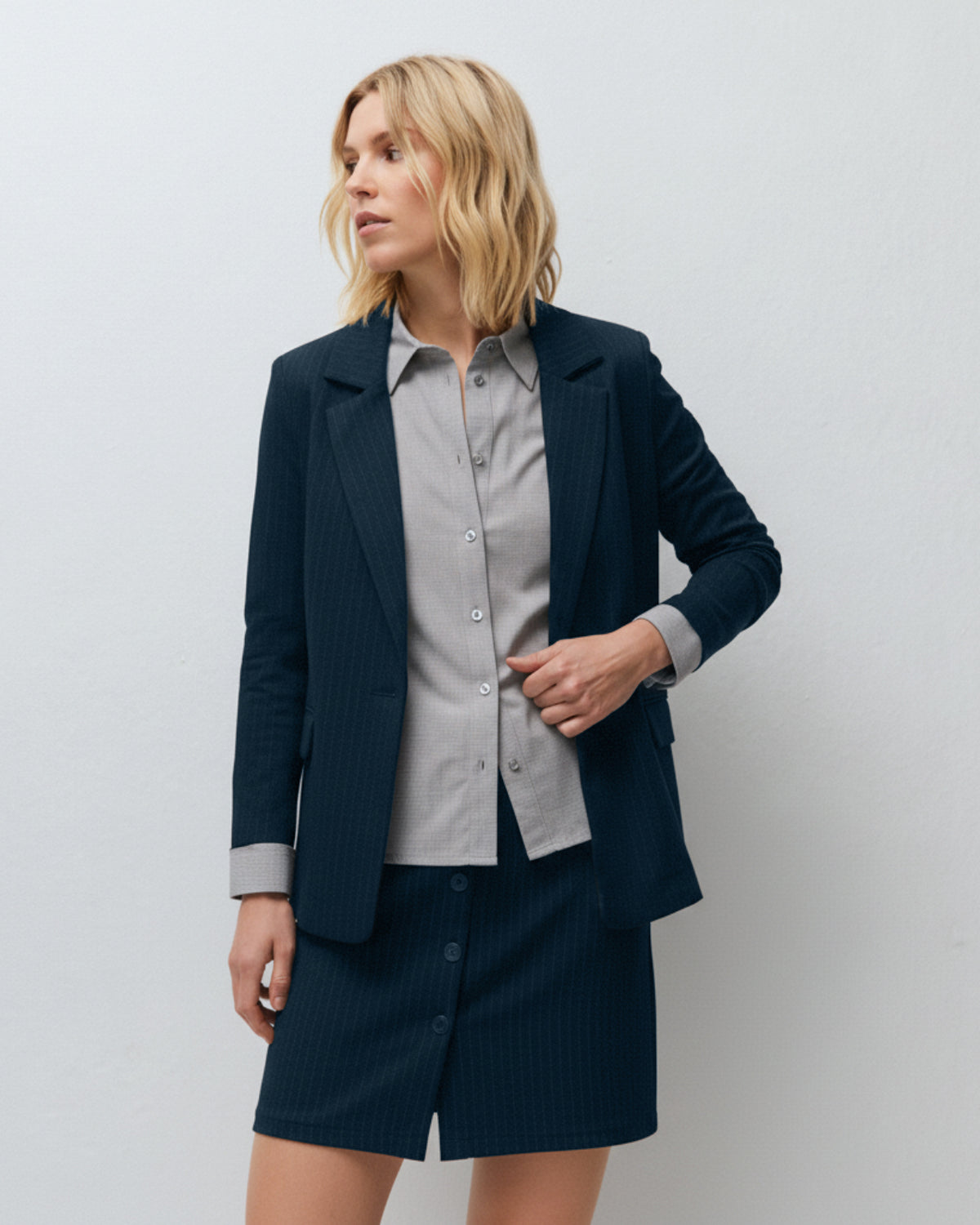 Blazer pour femme à fines rayures, col à revers cranté et fermeture boutonnée.