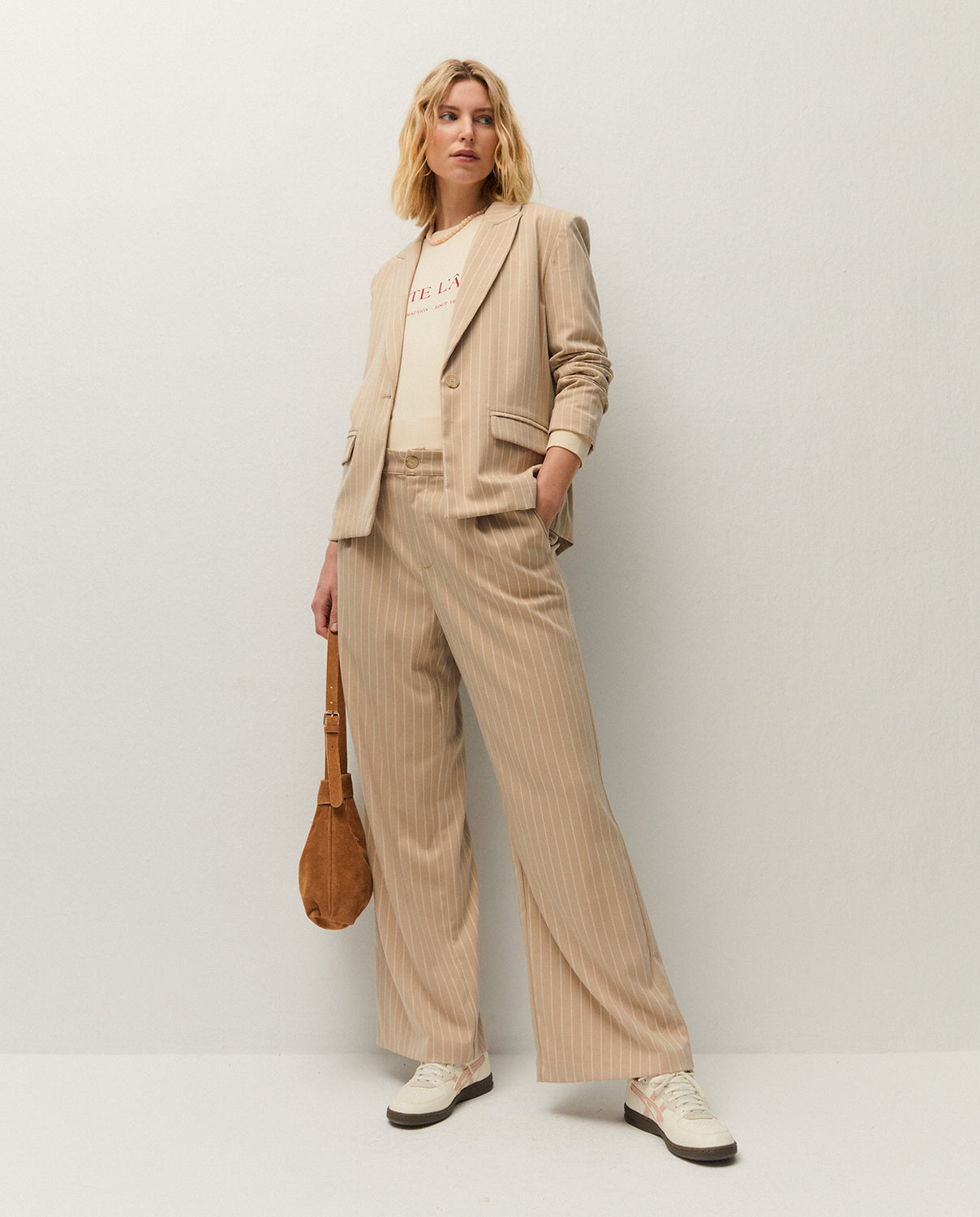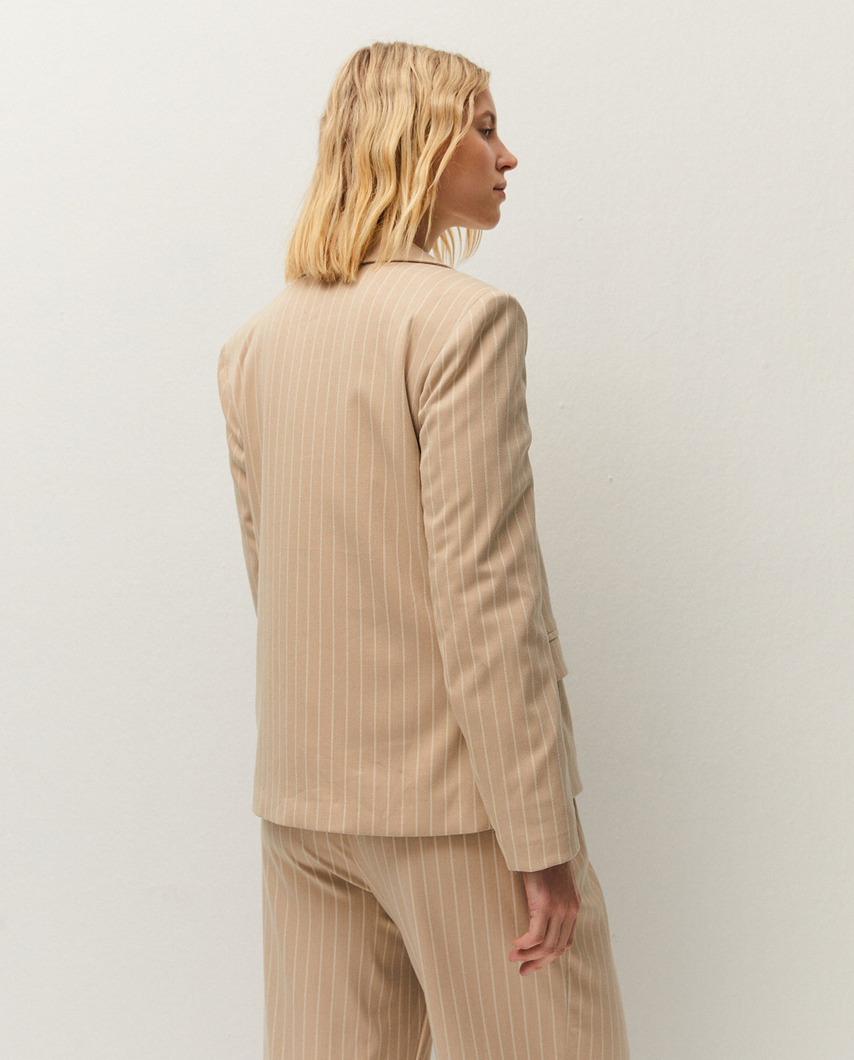 Blazer con cuello de solapa y manga larga con hombreras. Bolsillos delanteros. Forro interior combinado. Cierre frontal con dos botones. Prenda sostenible.