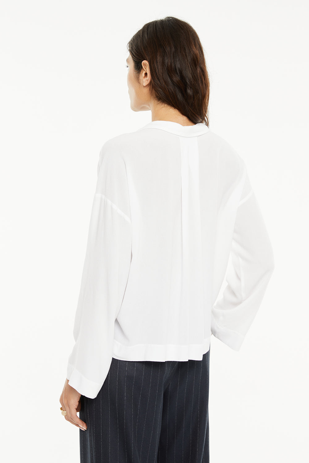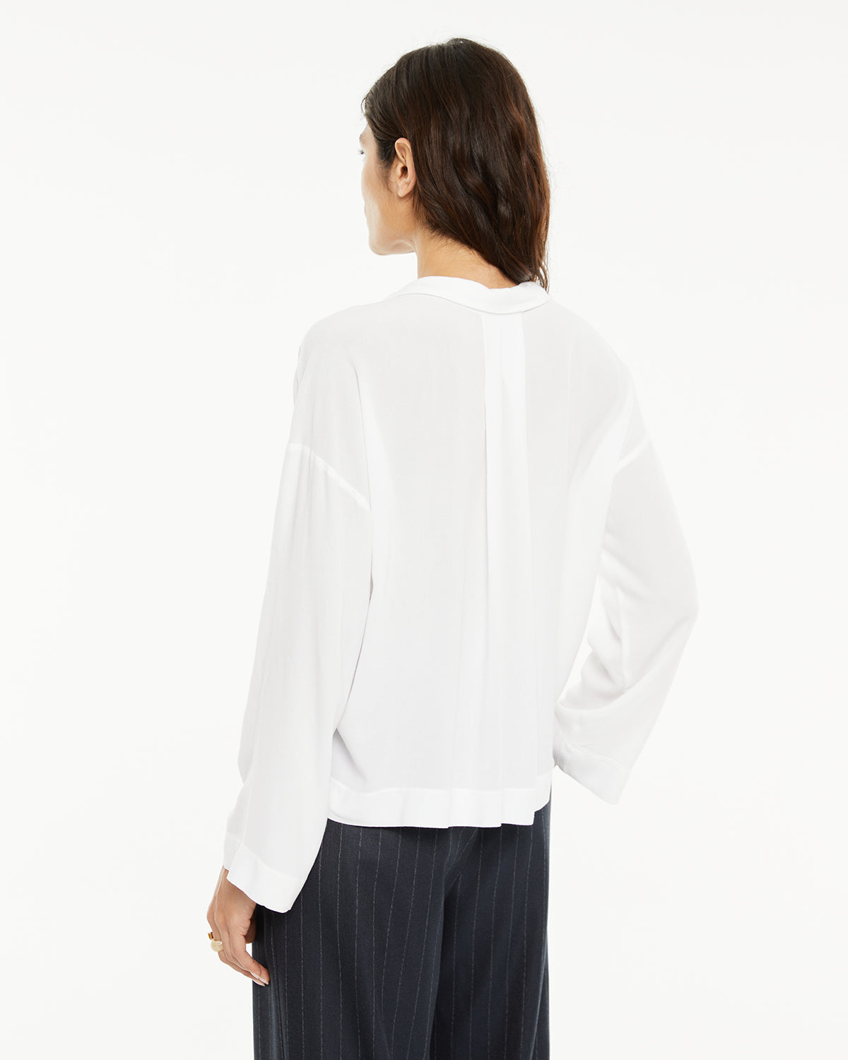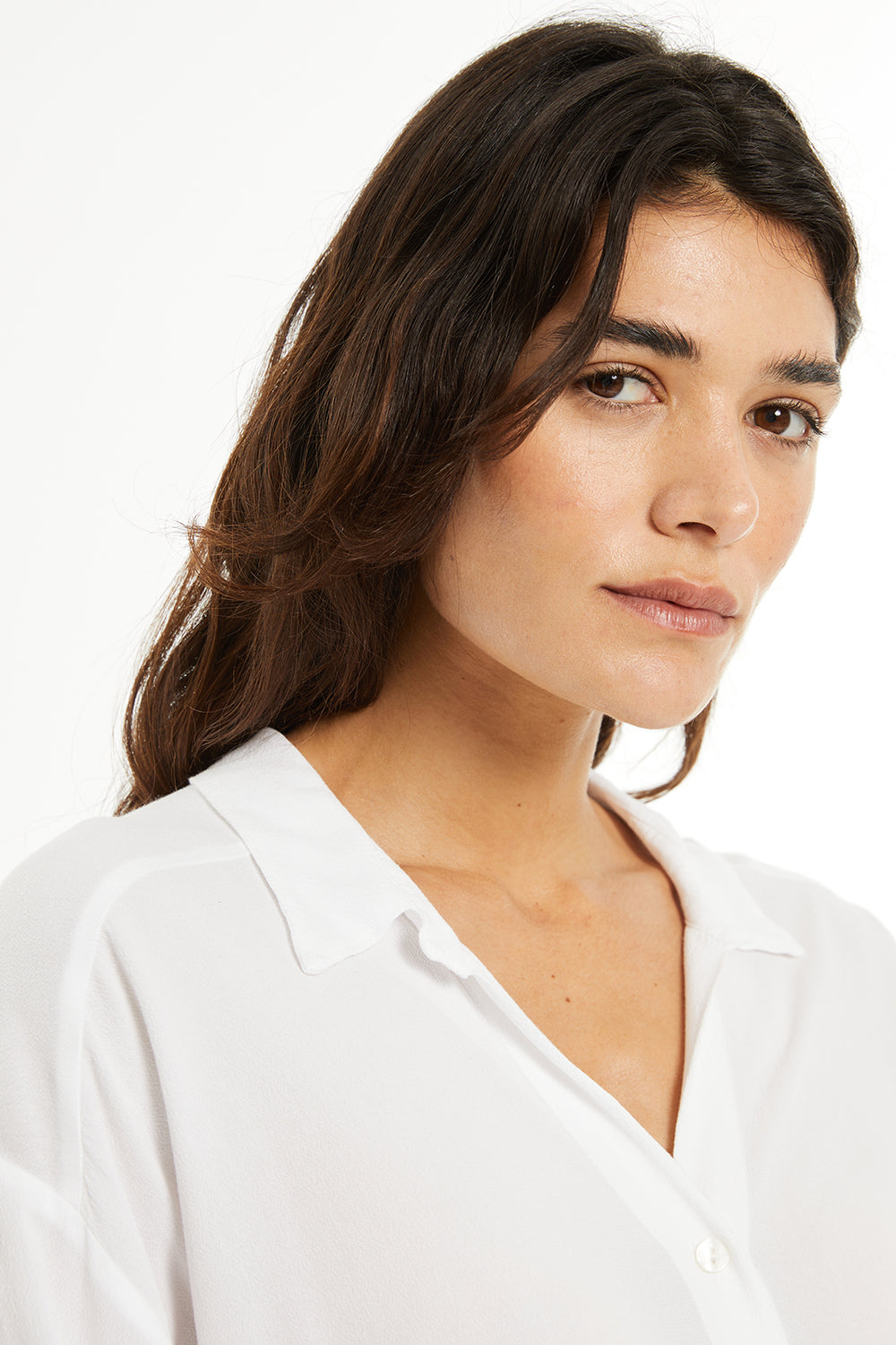 Chemise fluide pour femme, à encolure classique et coutures d'épaules décalées vers l'avant. Un vêtement écoresponsable.