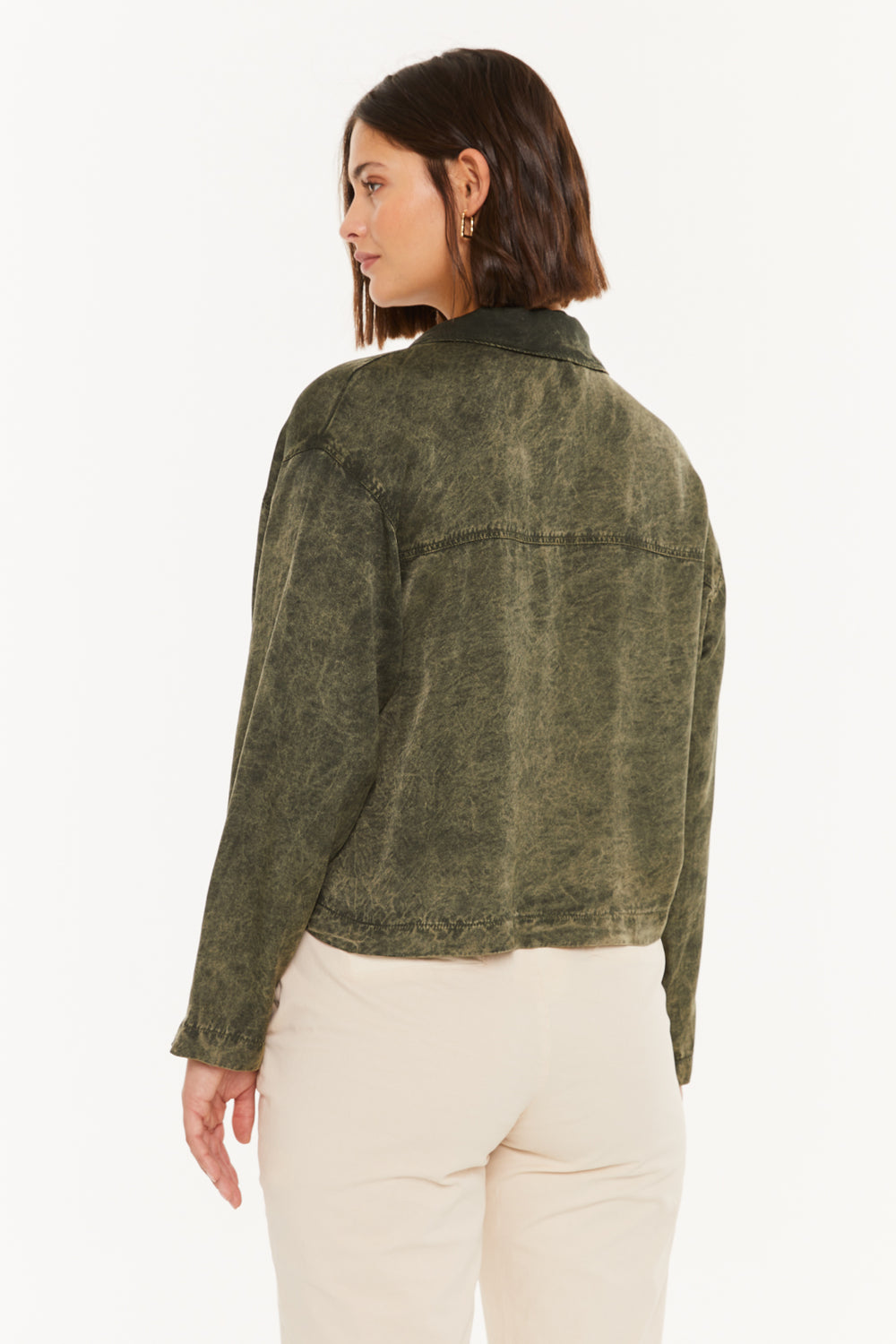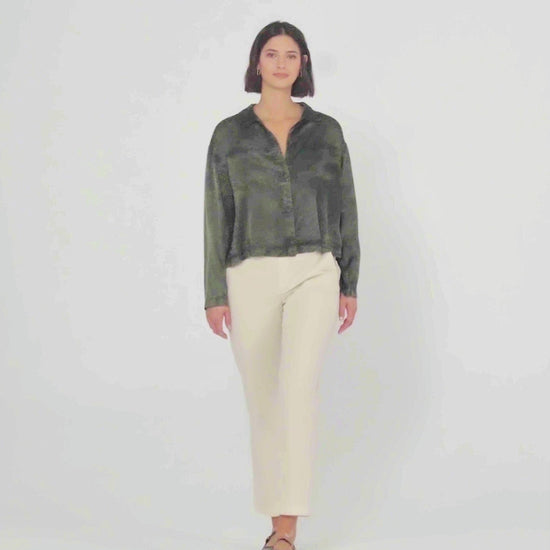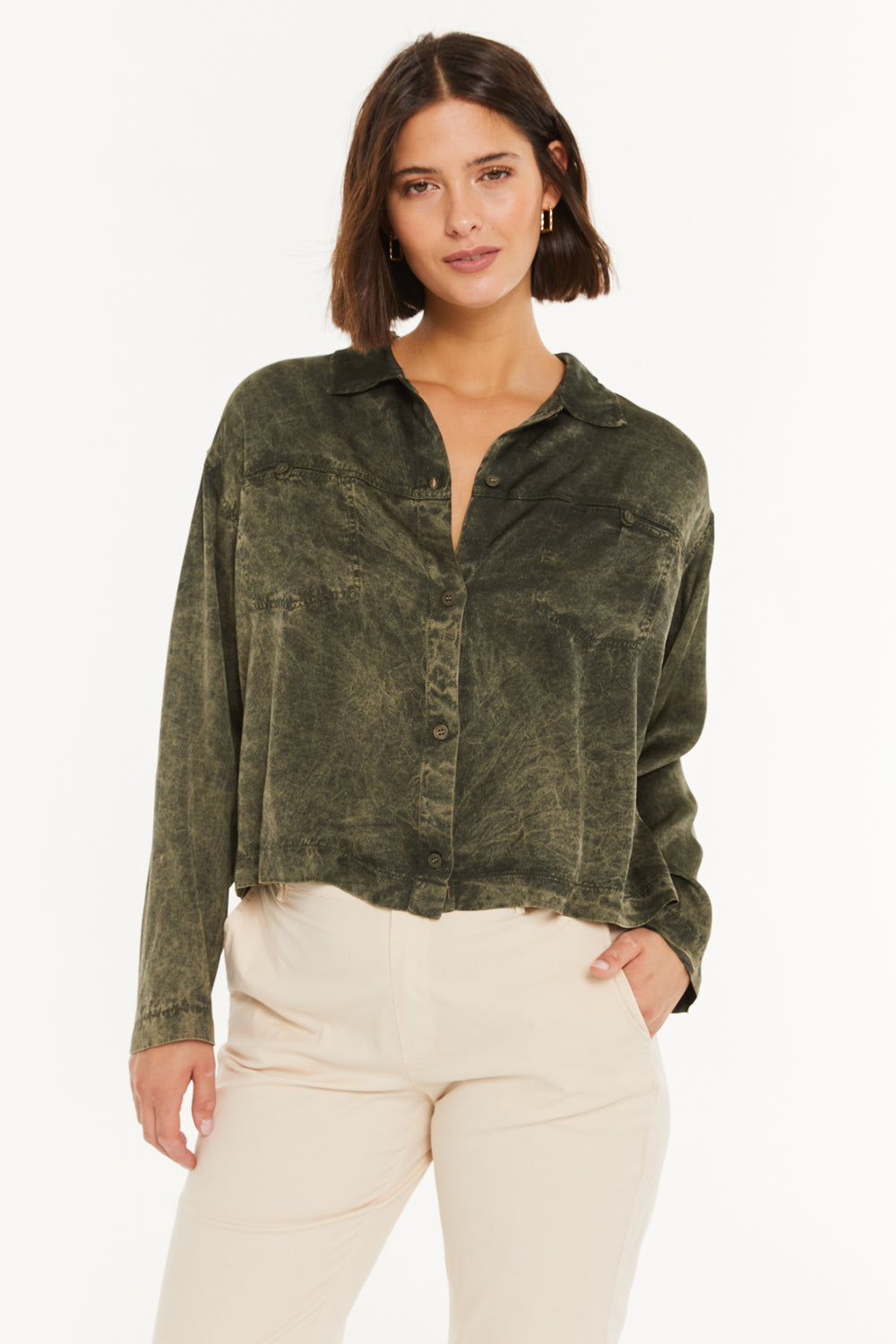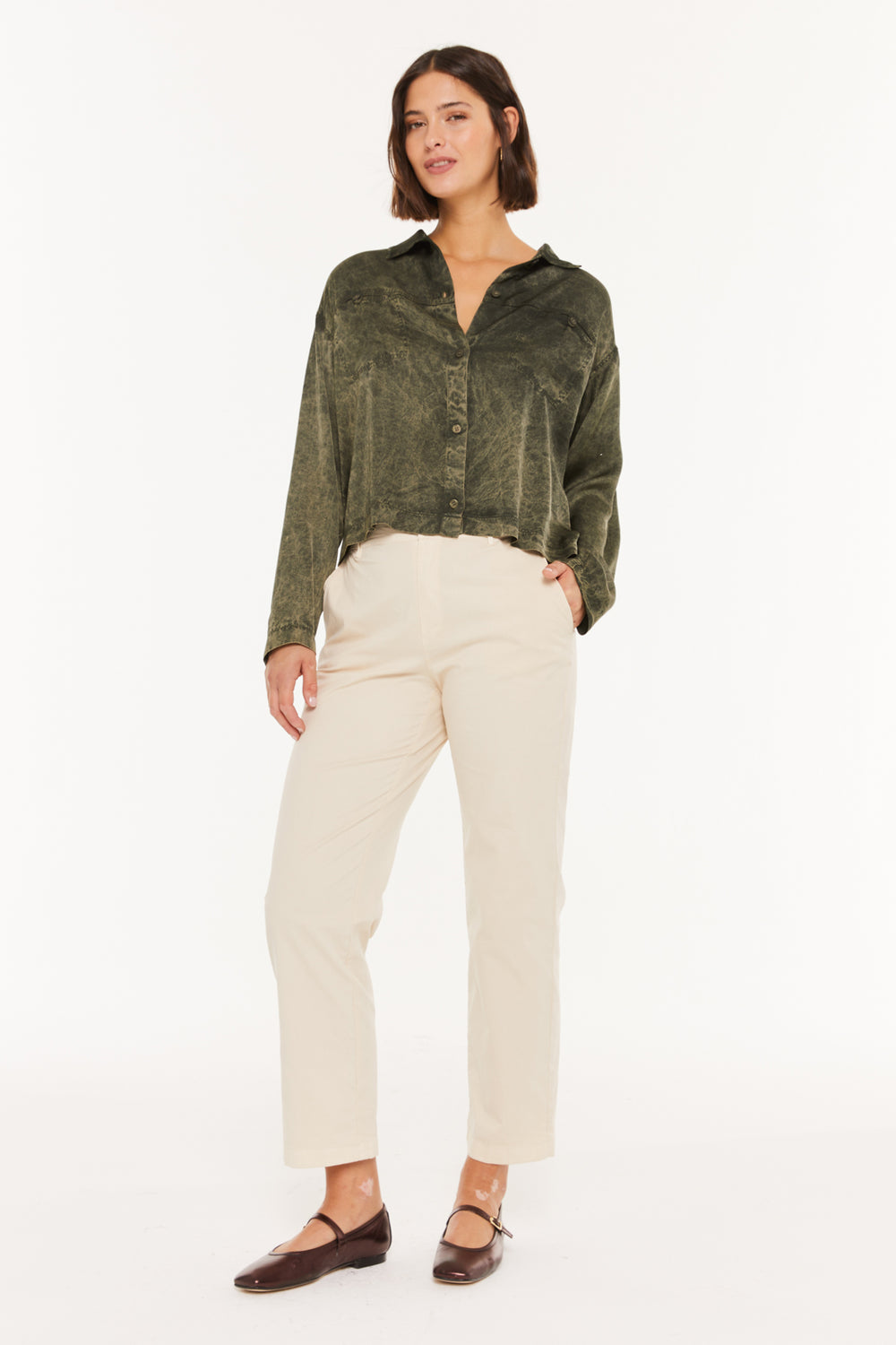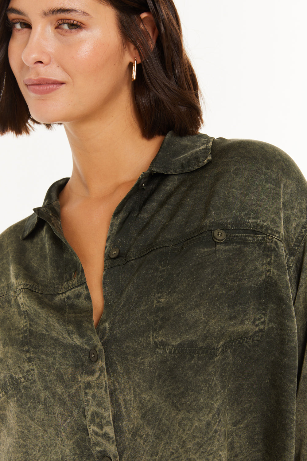Chemise fluide pour femme, à encolure classique, poches avant et fermeture boutonnée. Vêtement écoresponsable.