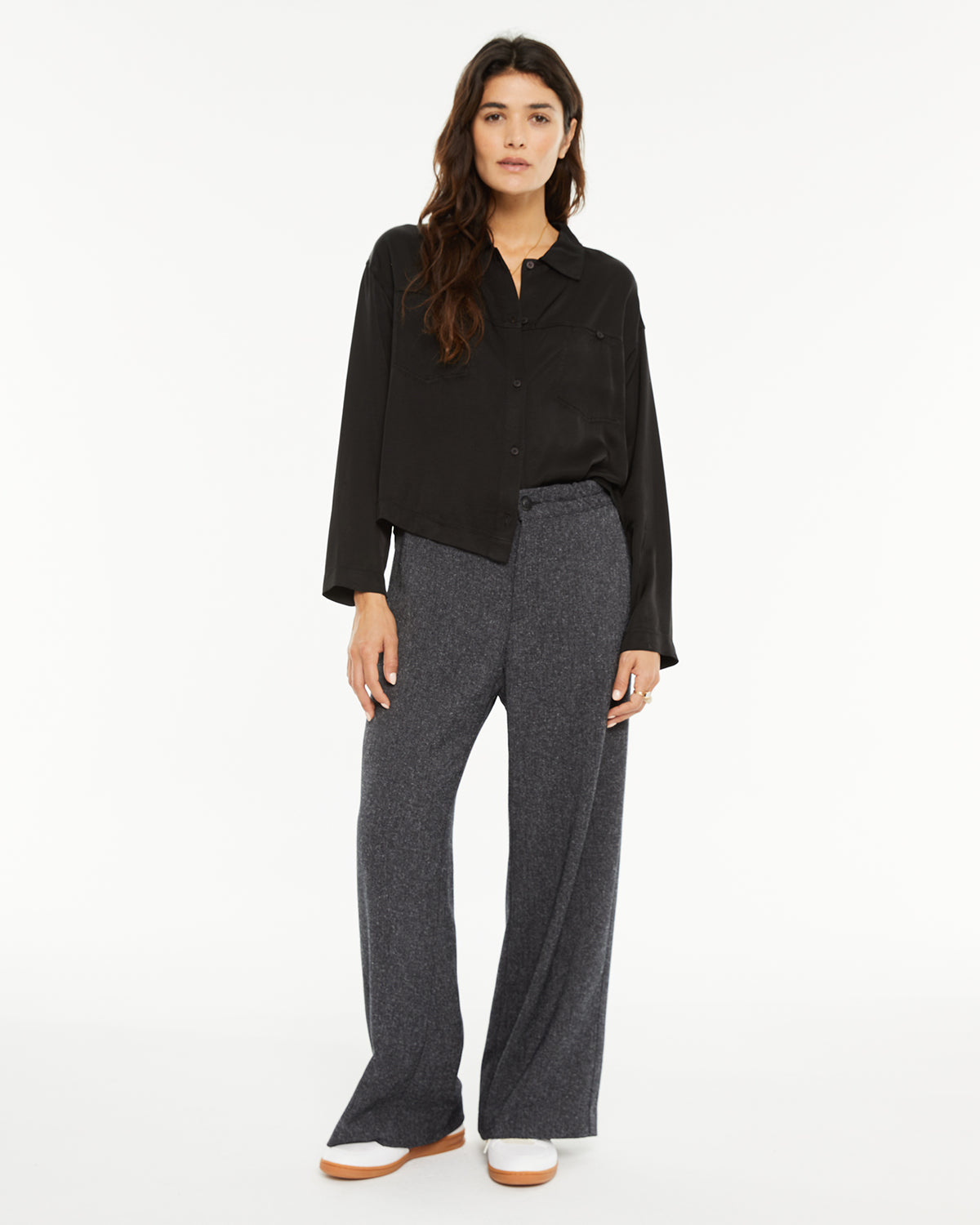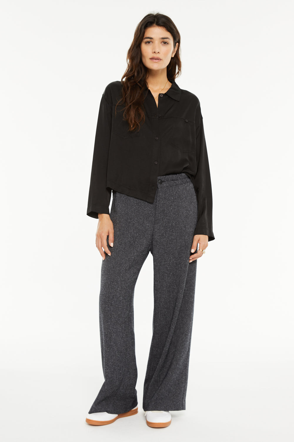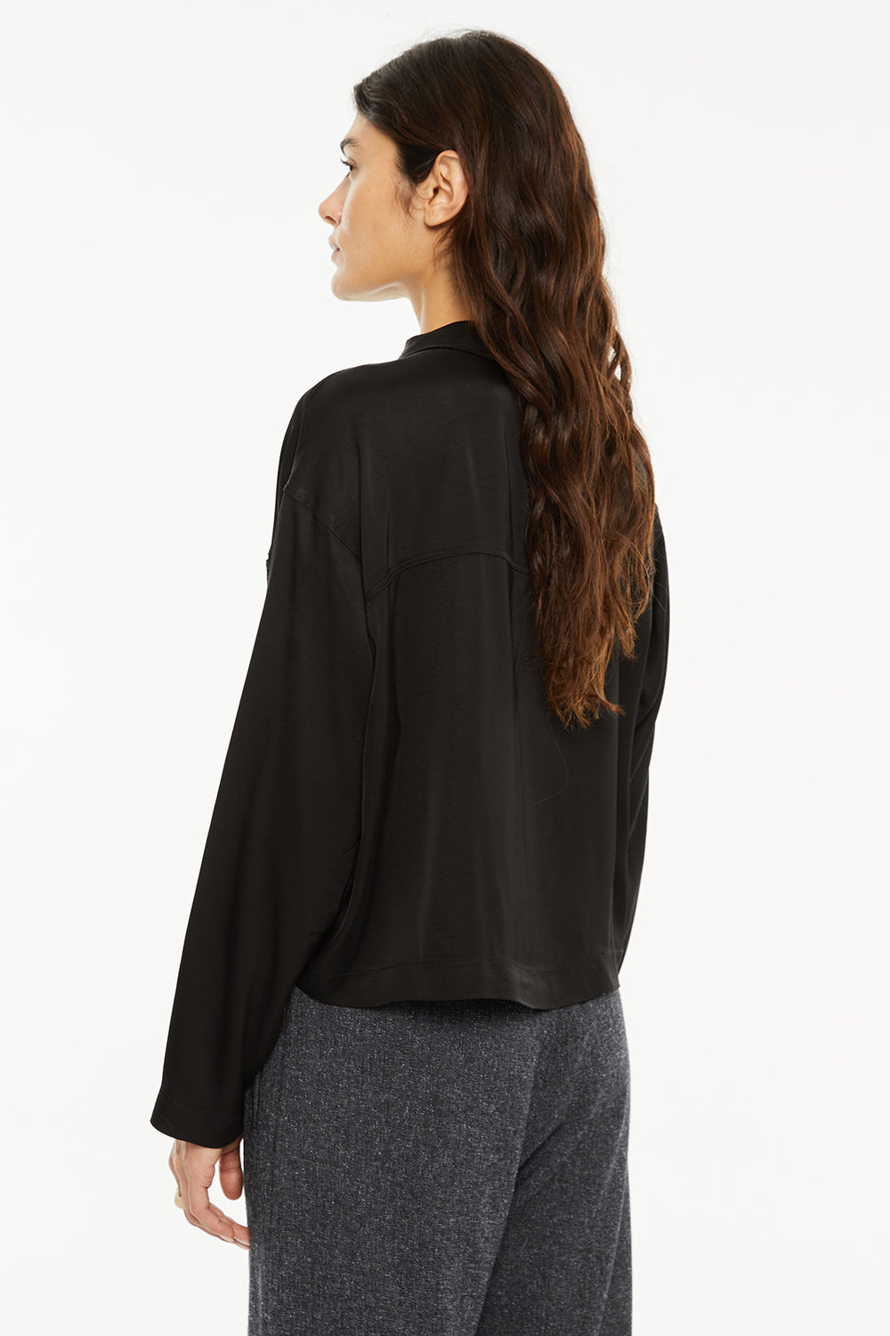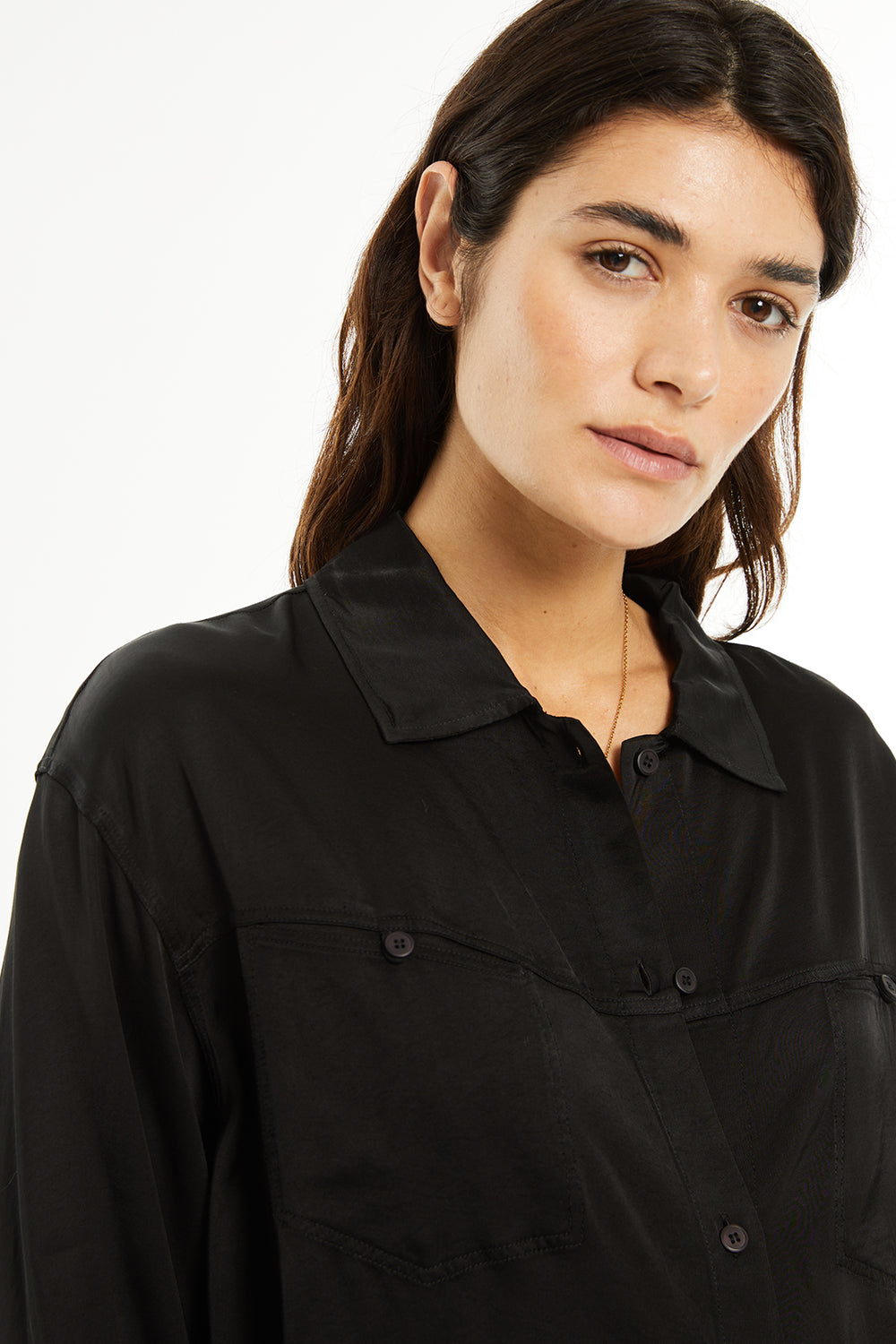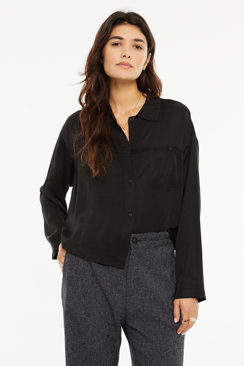 Chemise fluide pour femme, à encolure classique, poches avant et fermeture boutonnée. Vêtement écoresponsable.