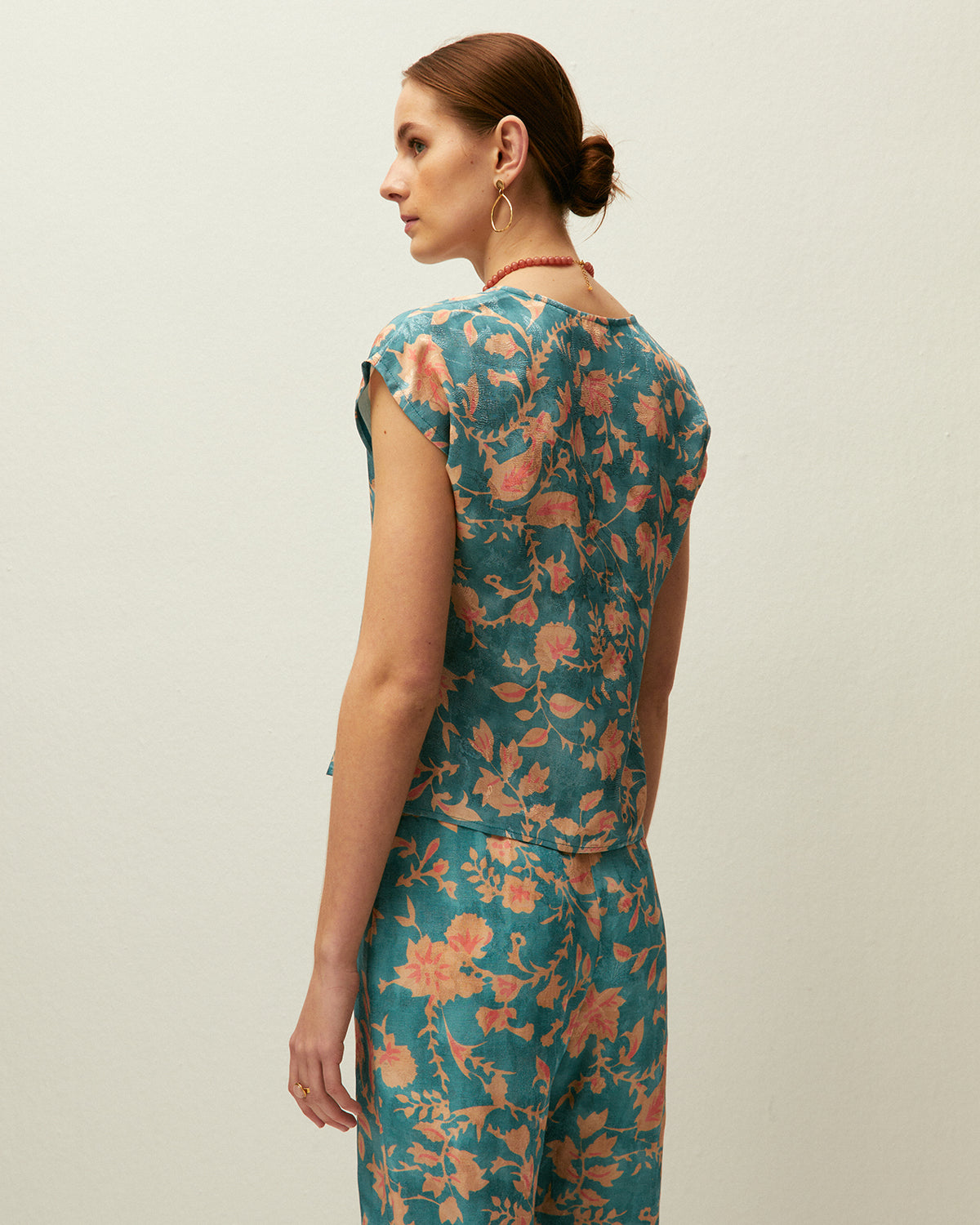 Camisa con cuello pico y manga corta, con estampado floral. Prenda sostenible.
