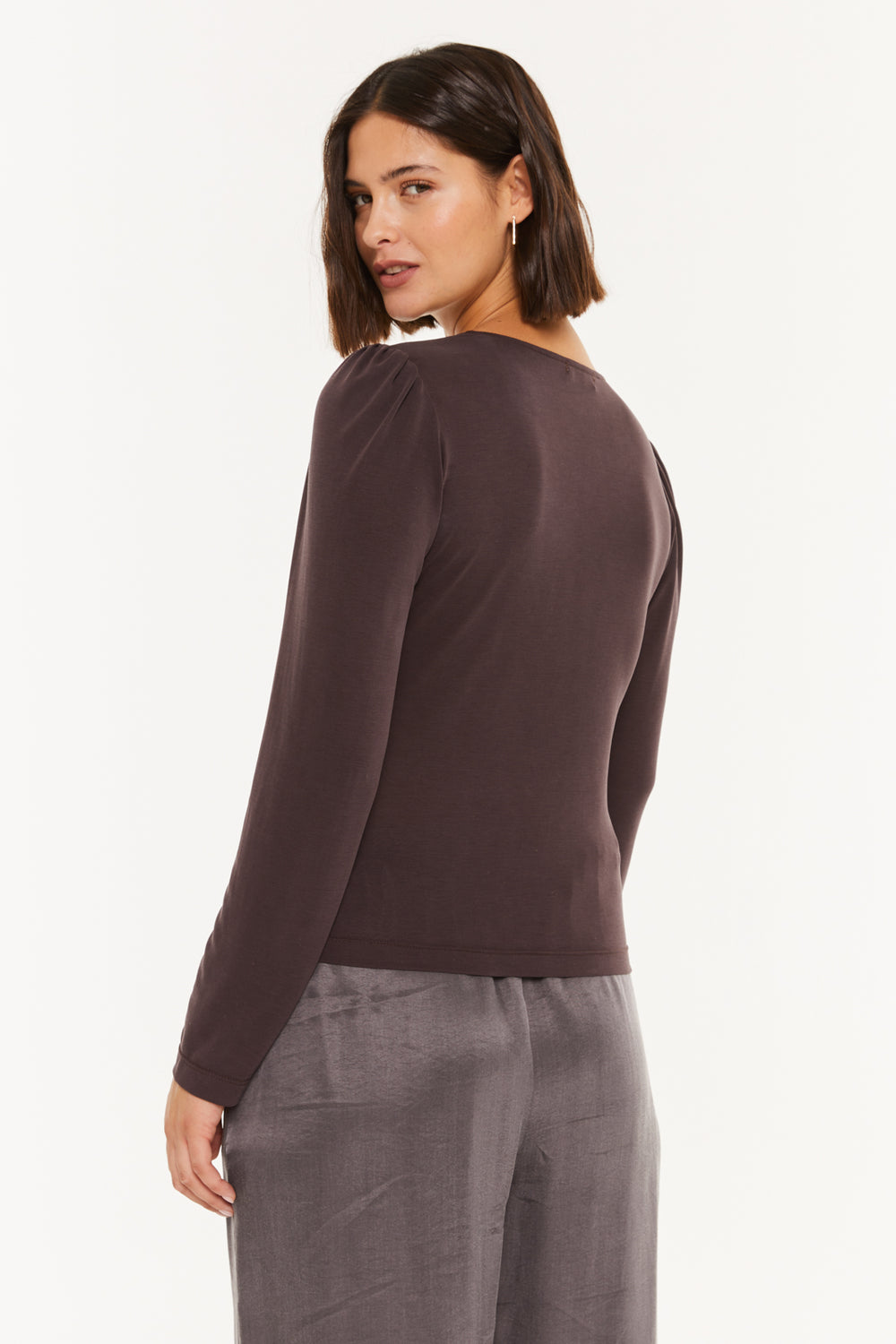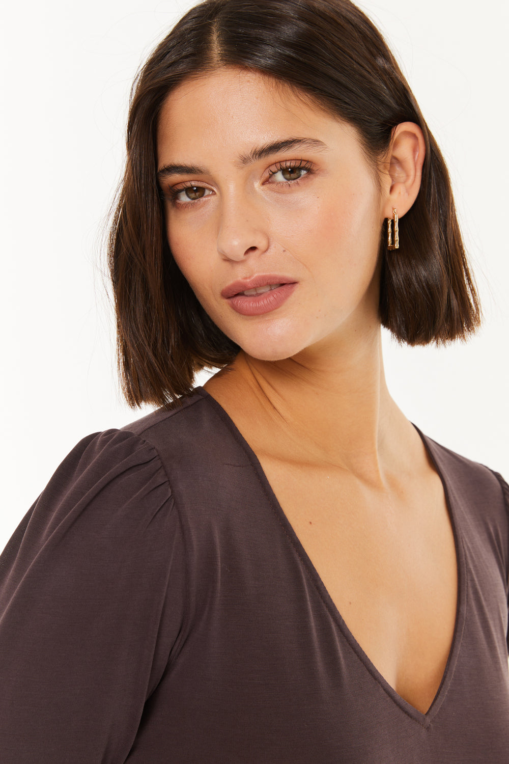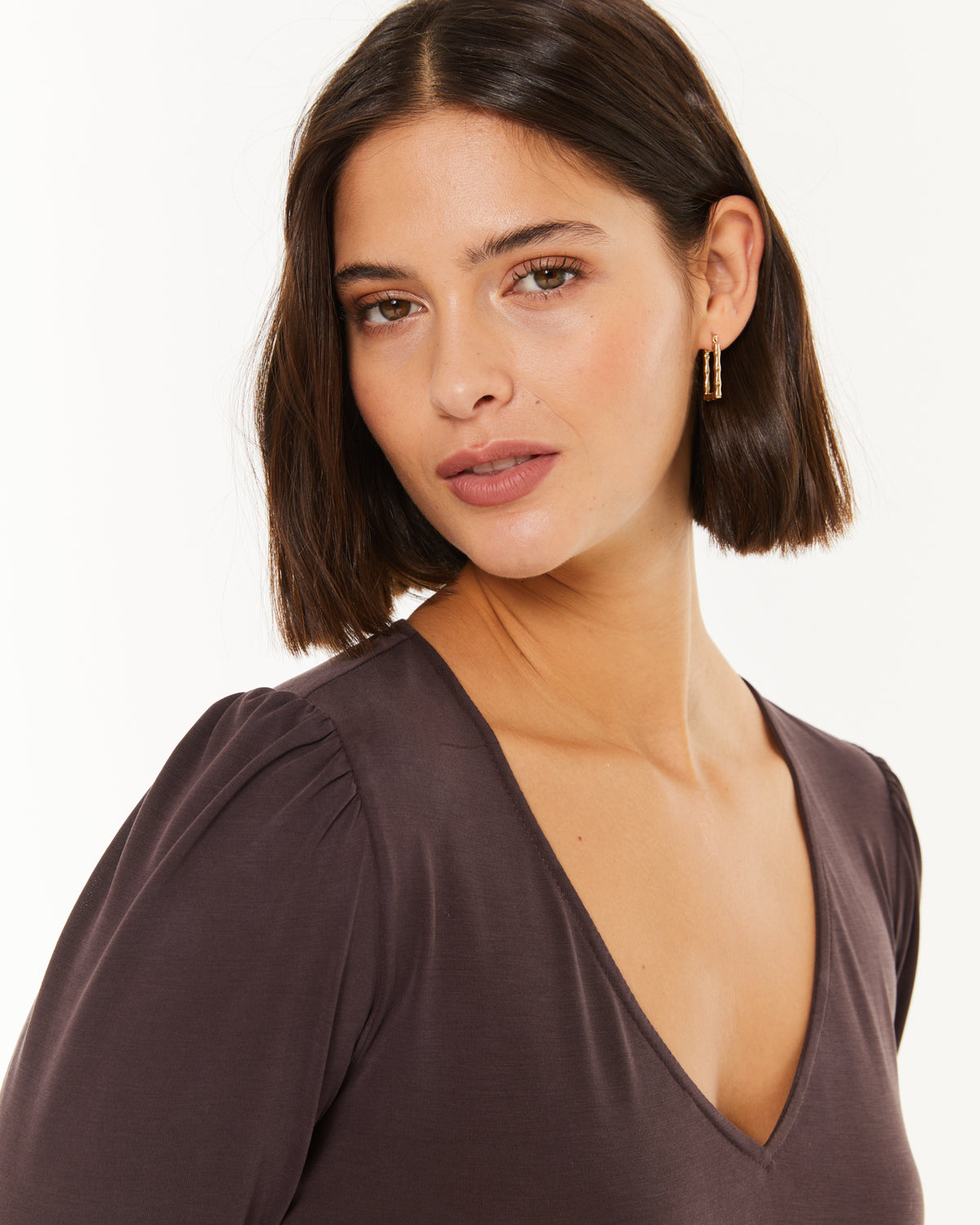 T-shirt femme à col en V et épaules froncées.