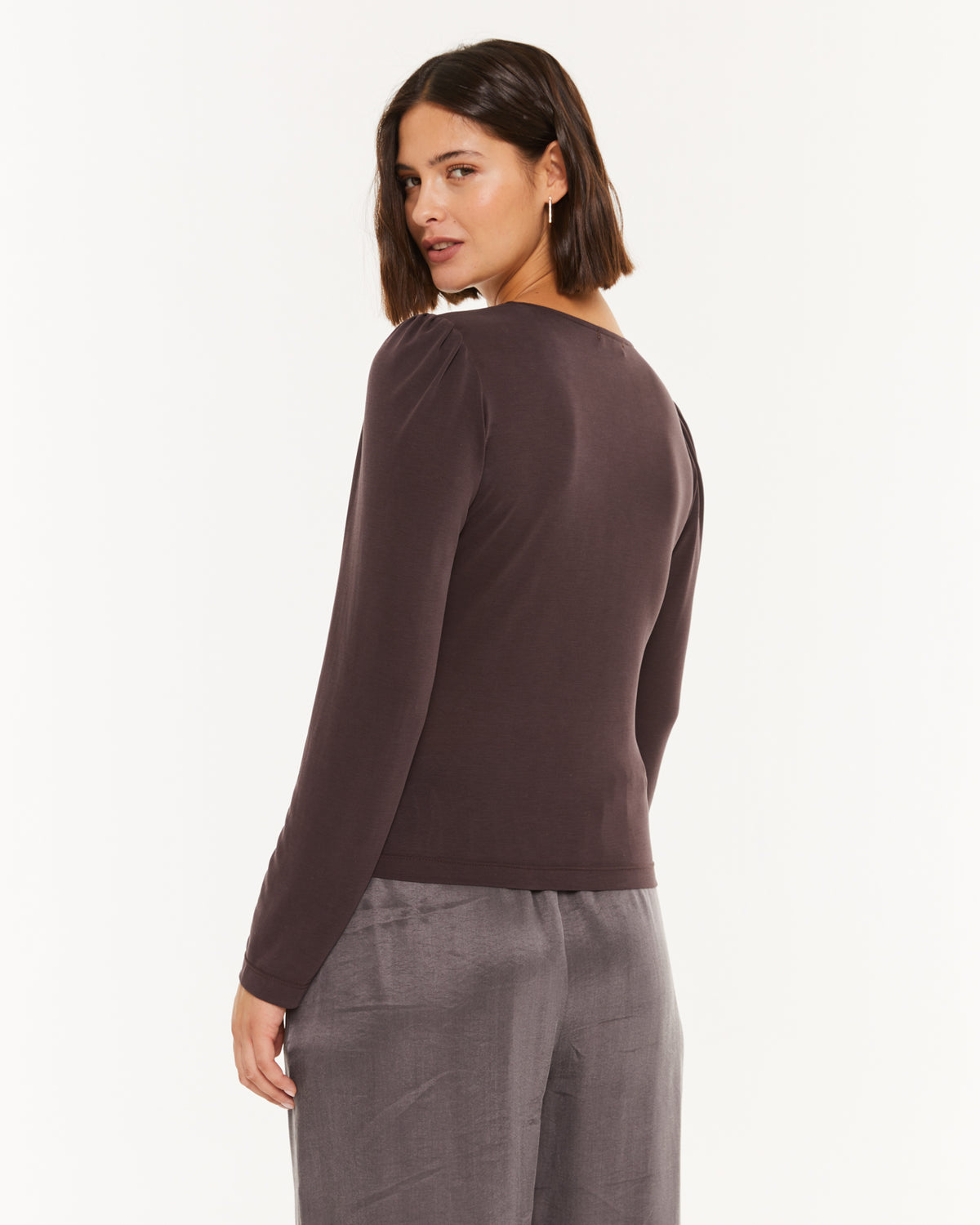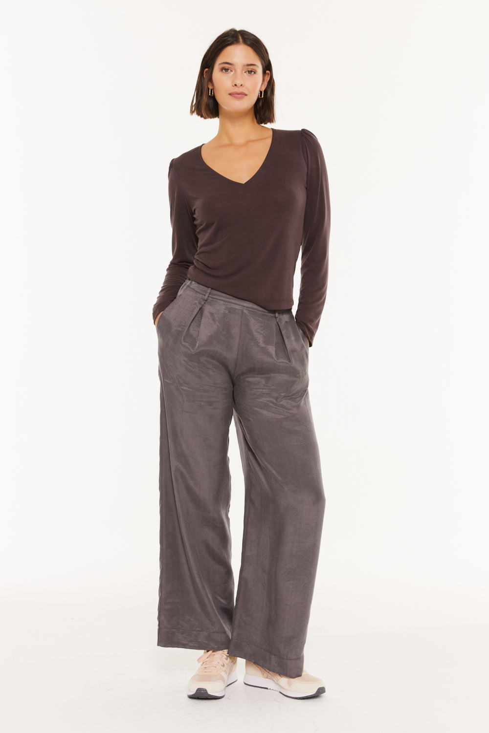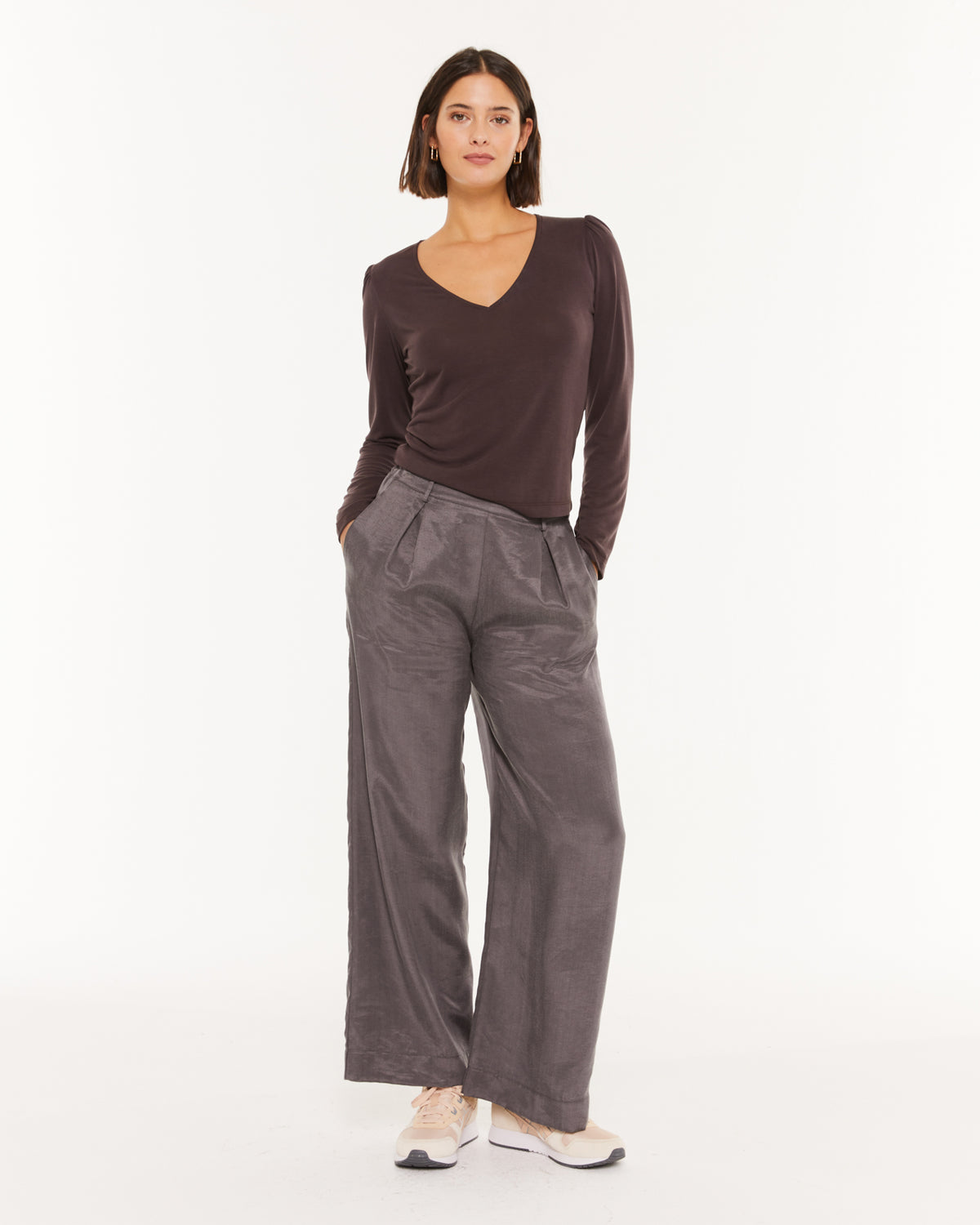 T-shirt femme à col en V et épaules froncées.