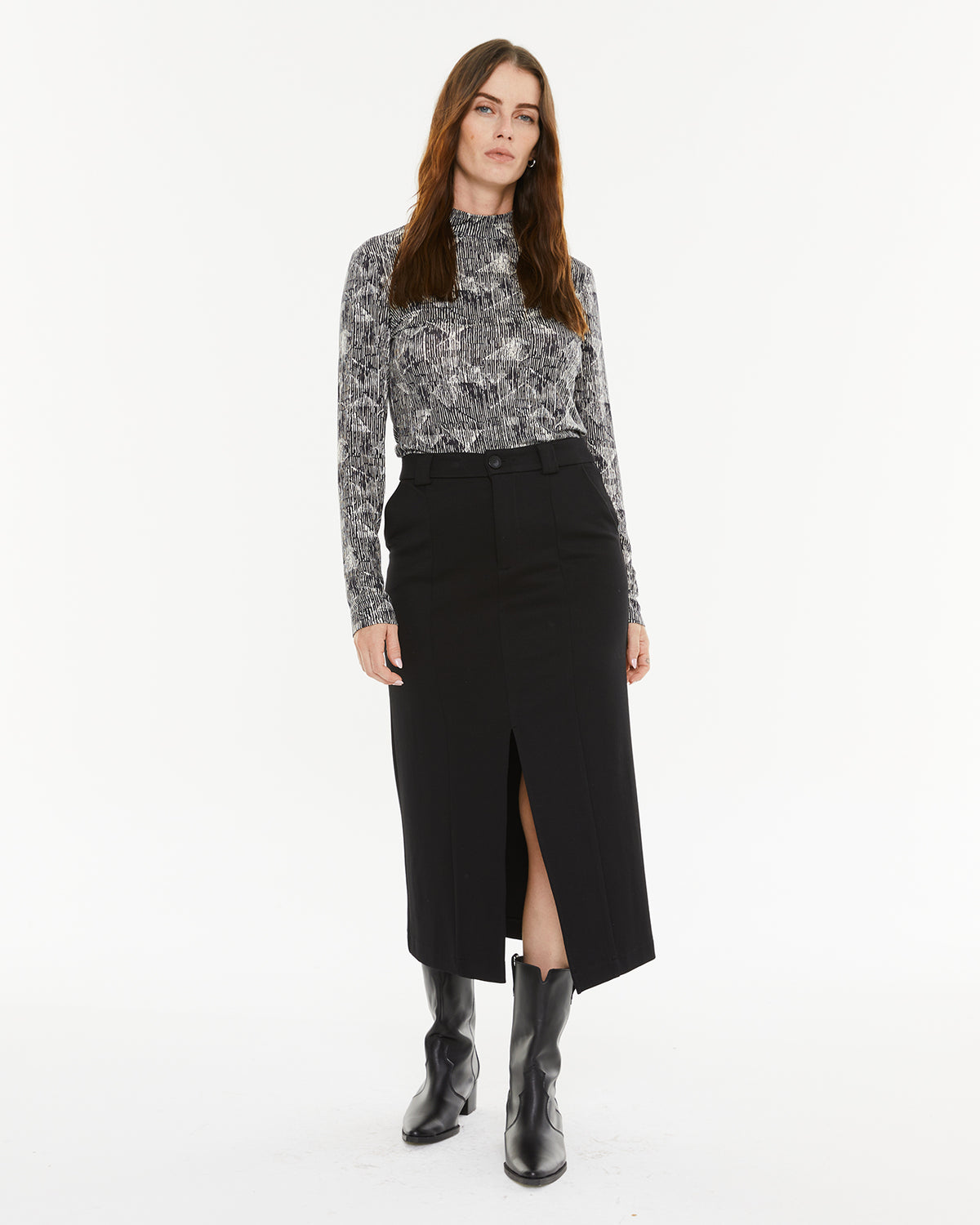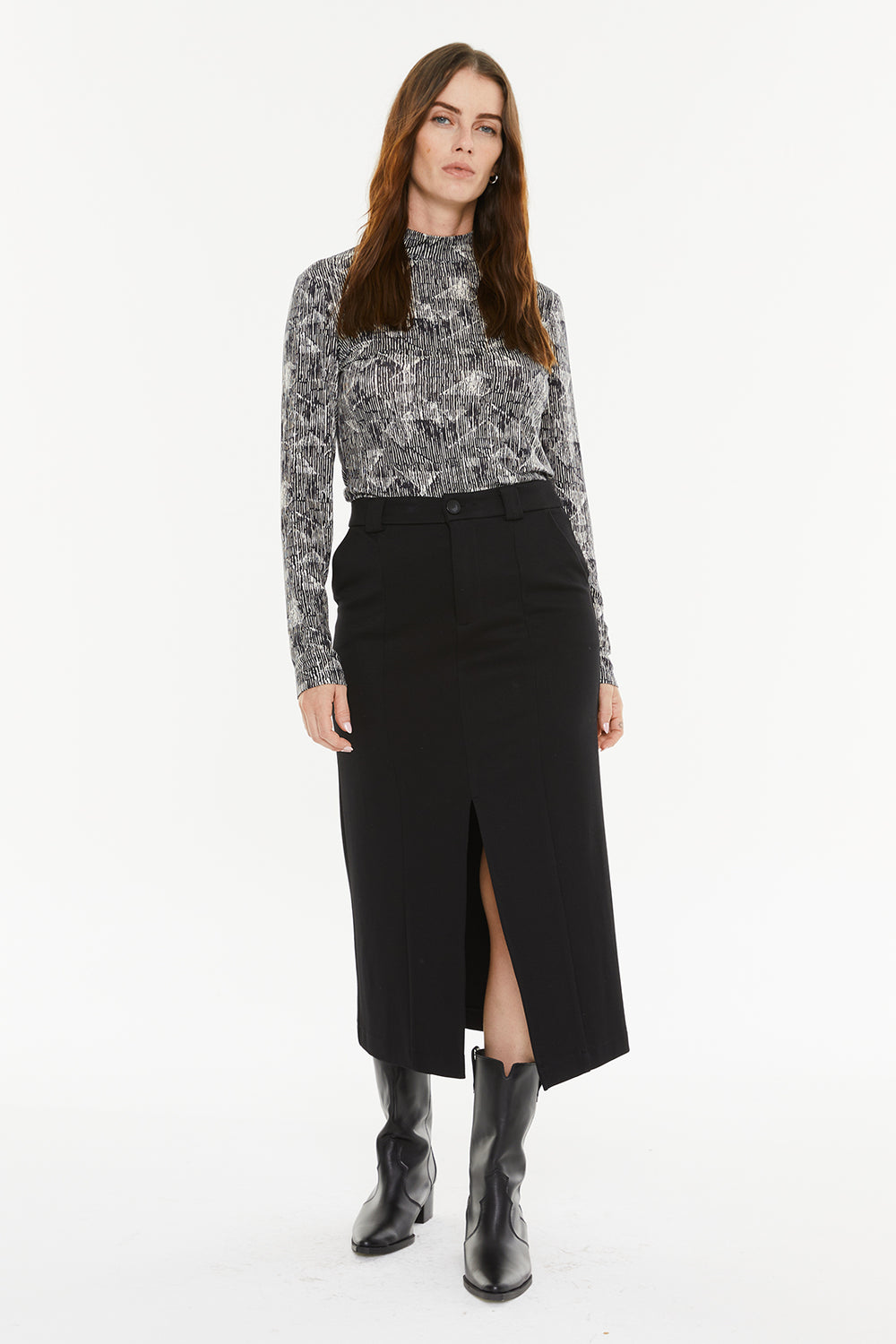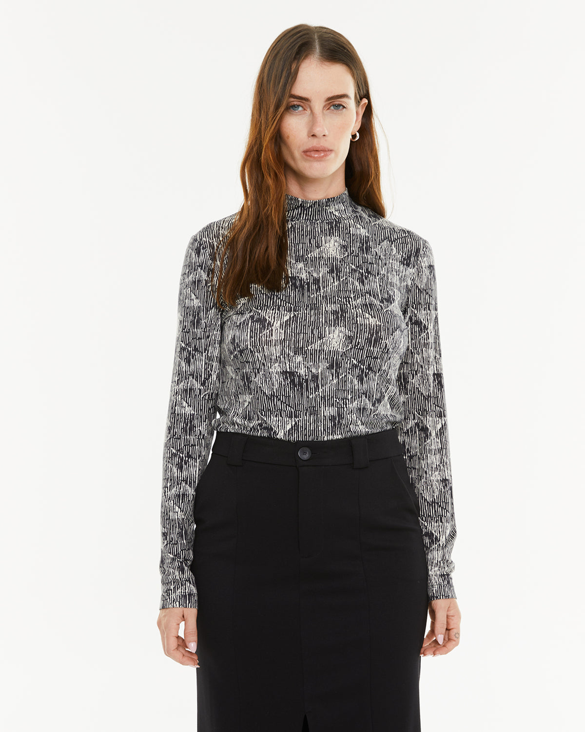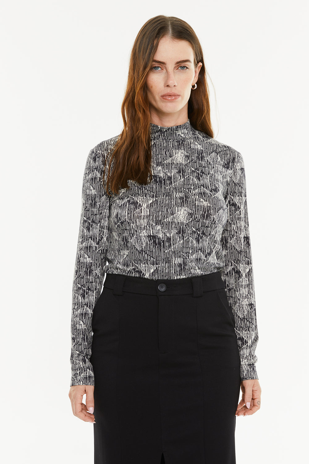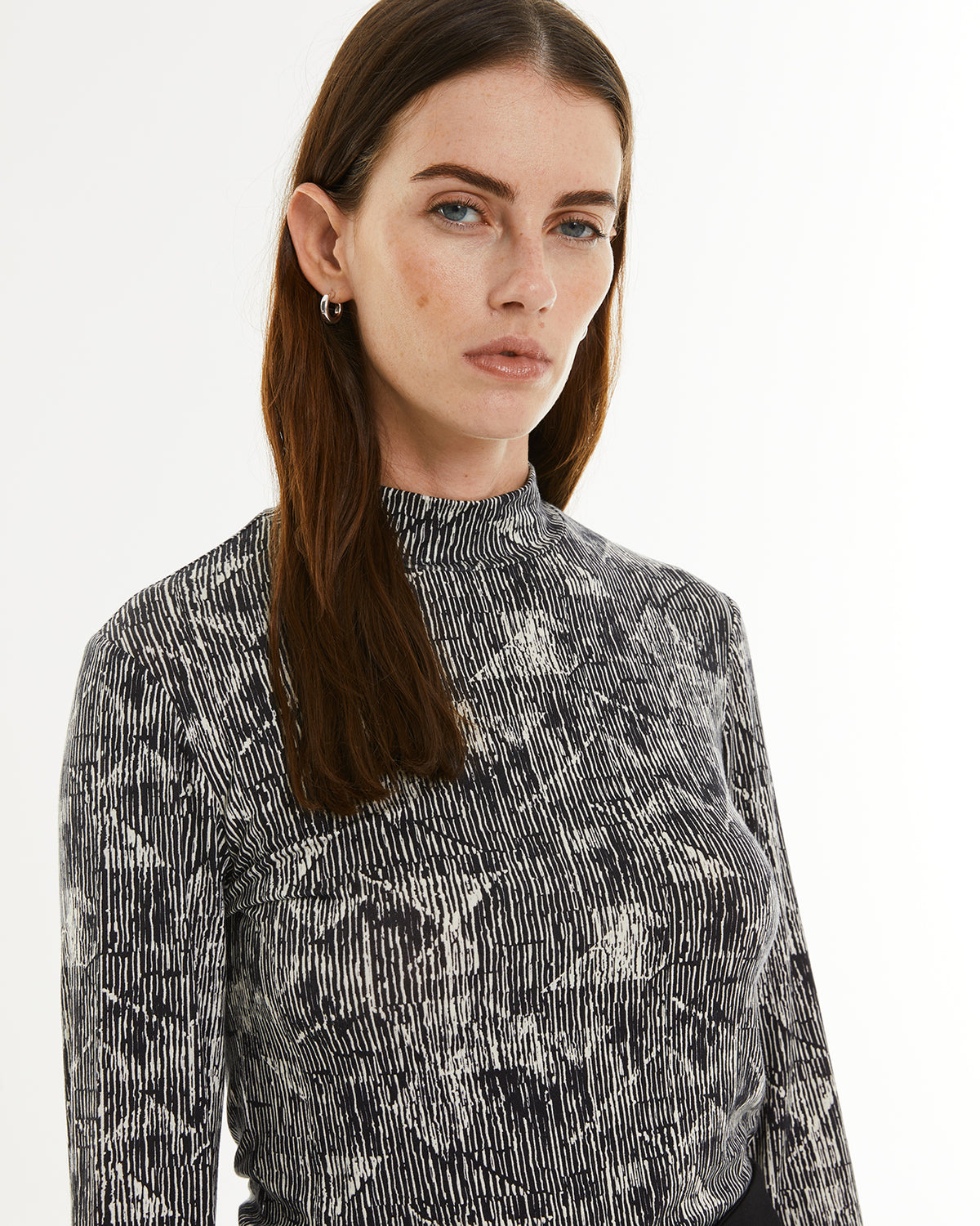 T-shirt femme à imprimé bicolore et col montant. Vêtement écoresponsable.