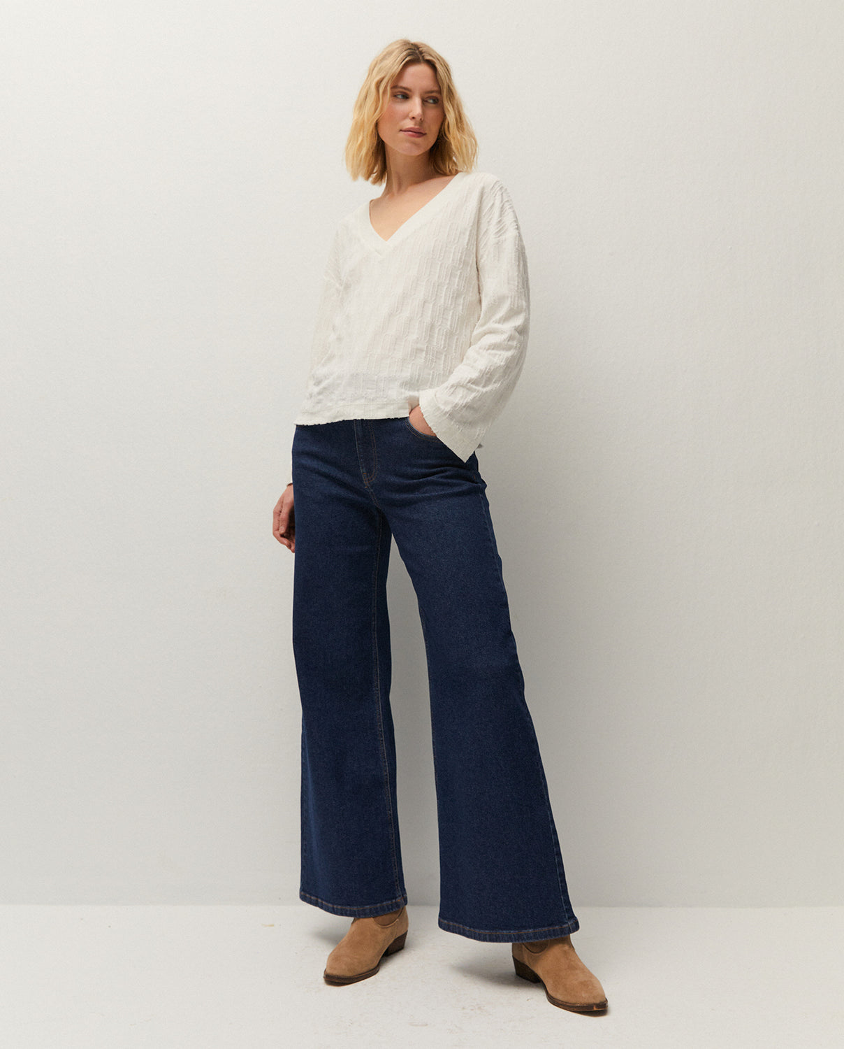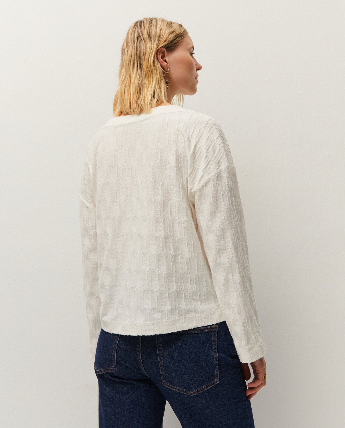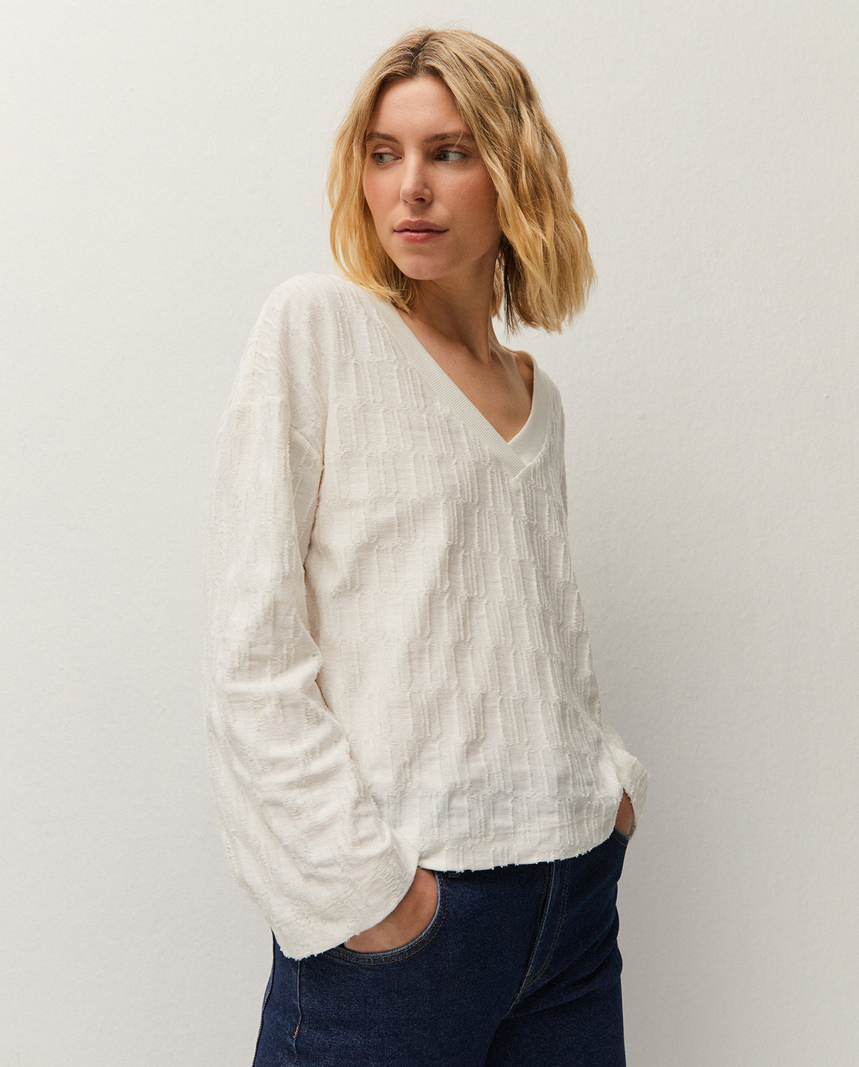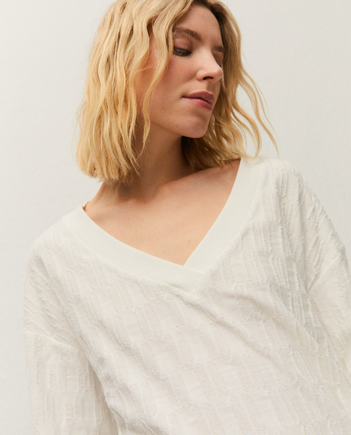 Camiseta de jacquard con cuello pico y manga larga. Detalle de rib en escote, bajo y puños.