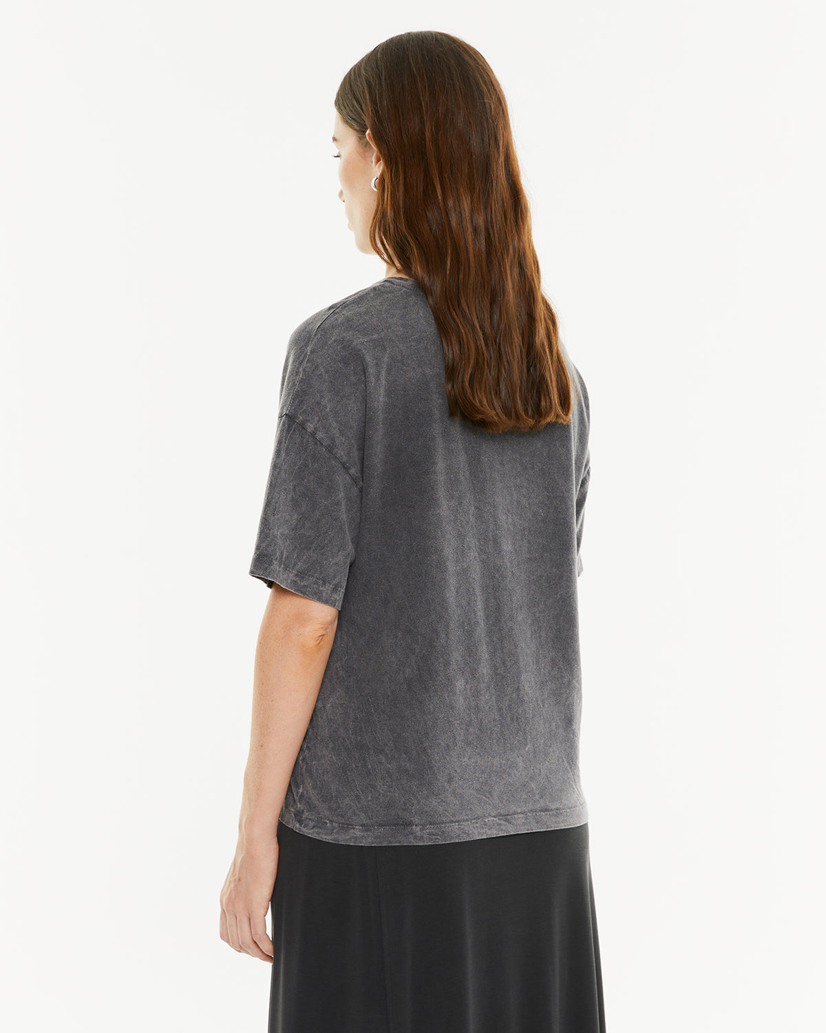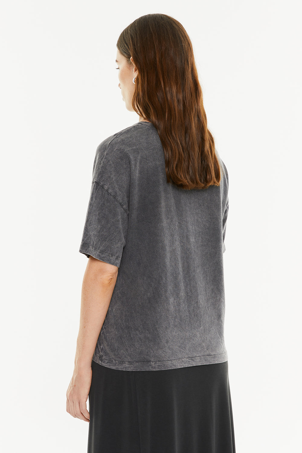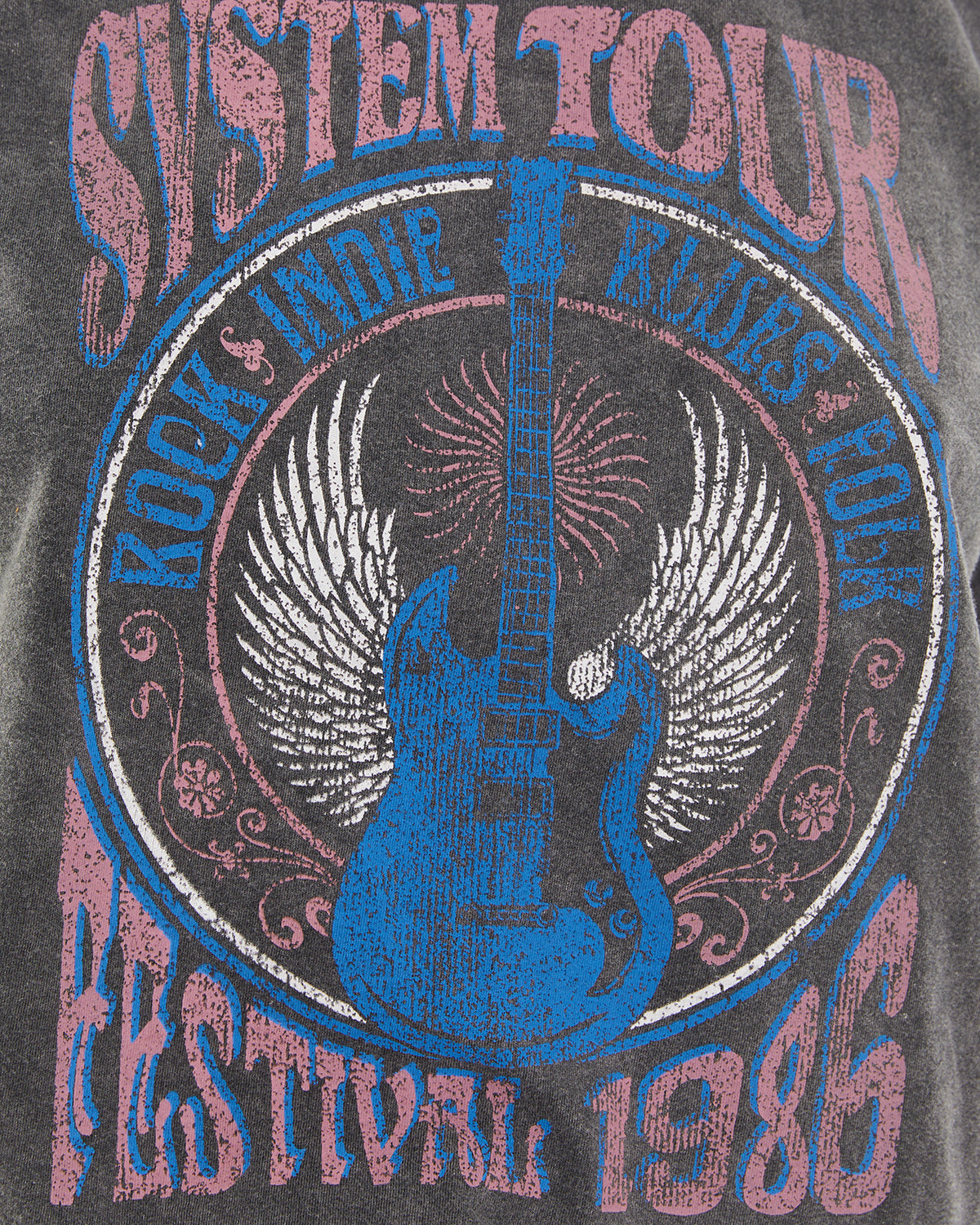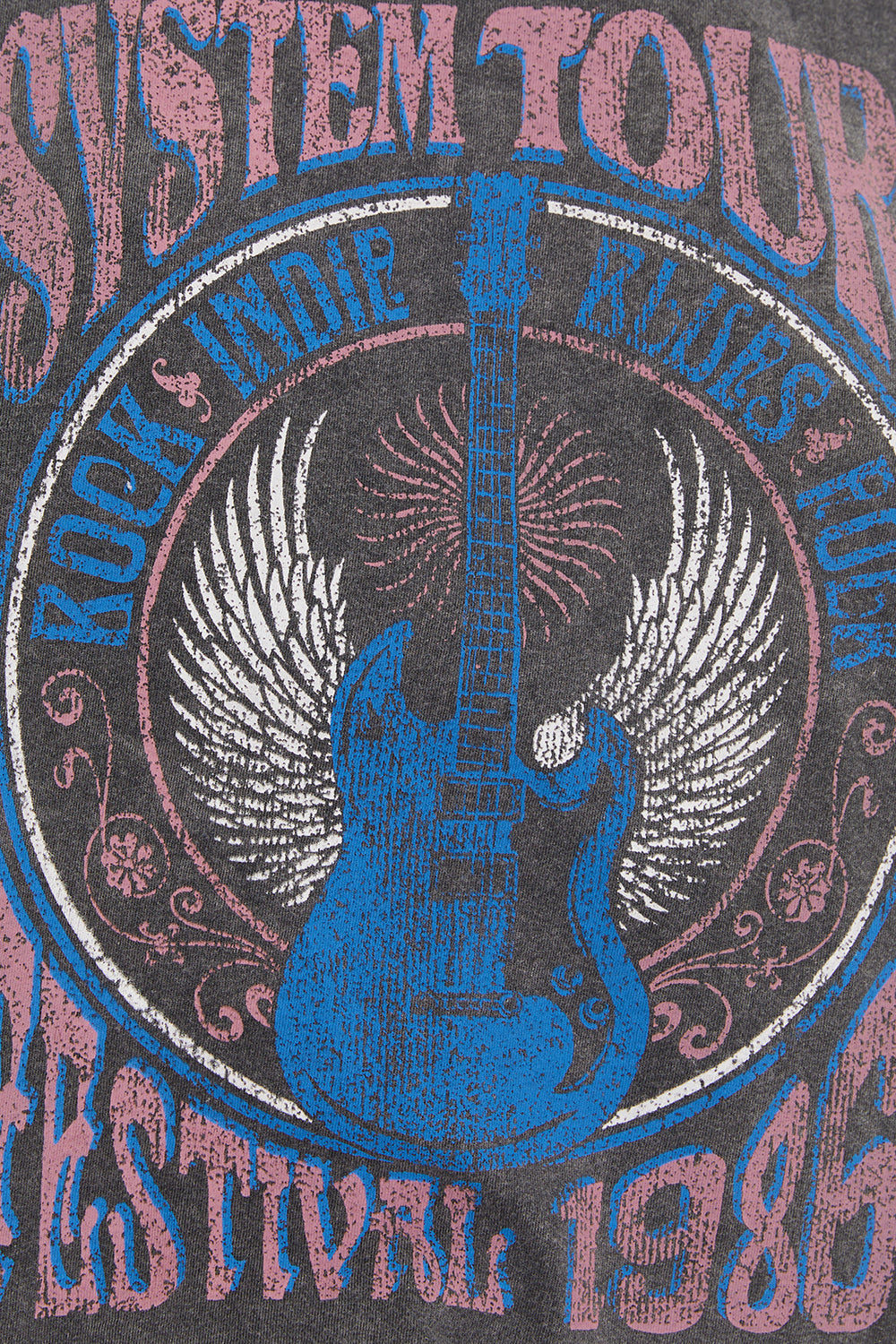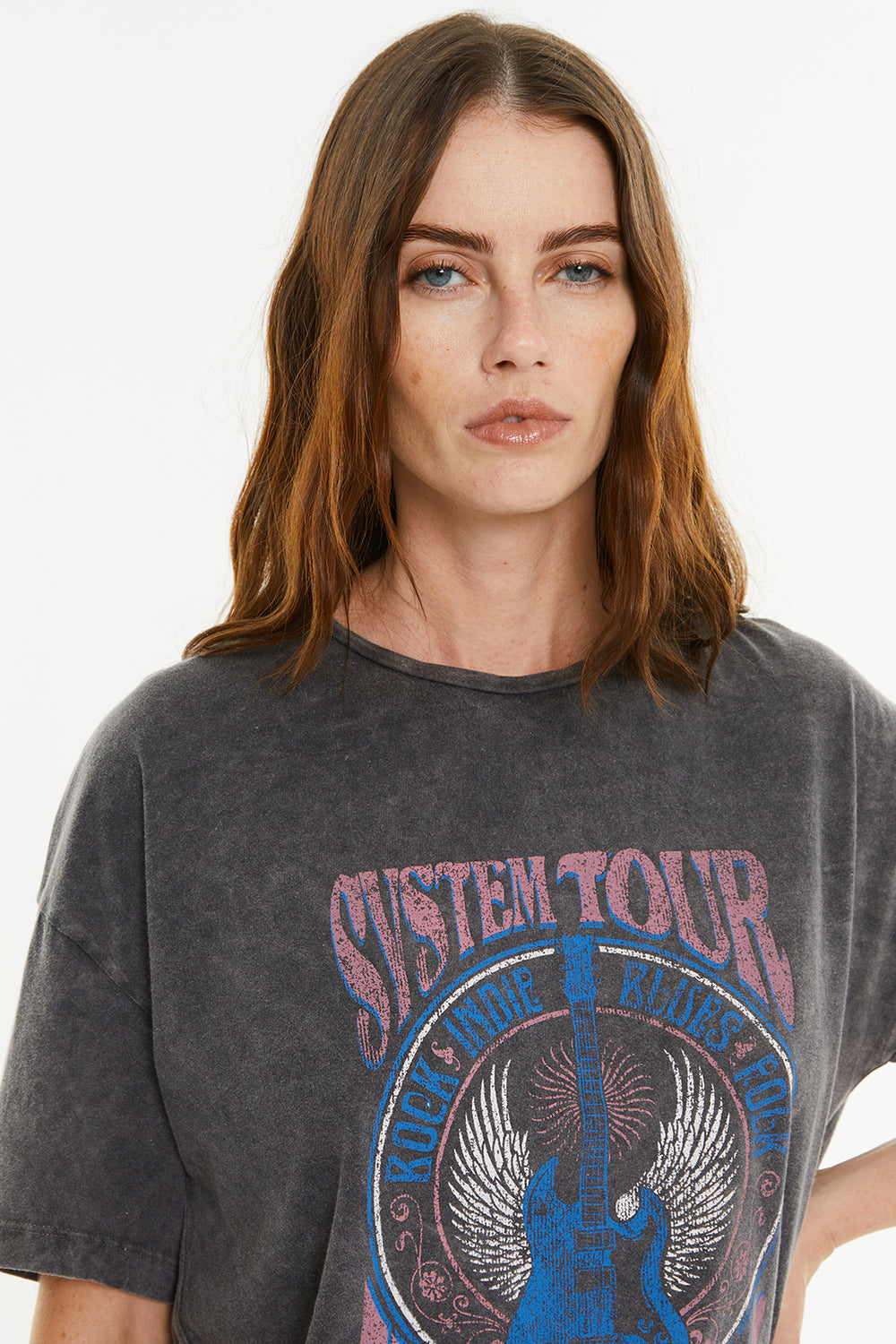 T-shirt oversize à manches courtes pour femme, avec teinture effet vieilli et imprimé guitare. Vêtement durable.