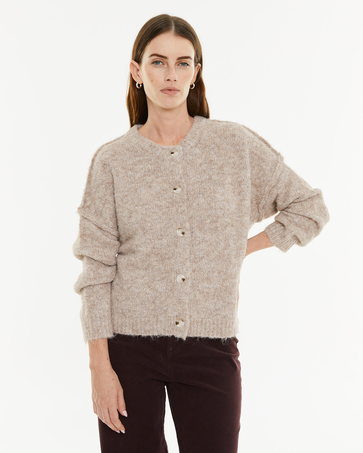 Gilet en maille pour femme, col rond, fermeture boutonnée sur le devant et finitions côtelées. Vêtement écoresponsable.