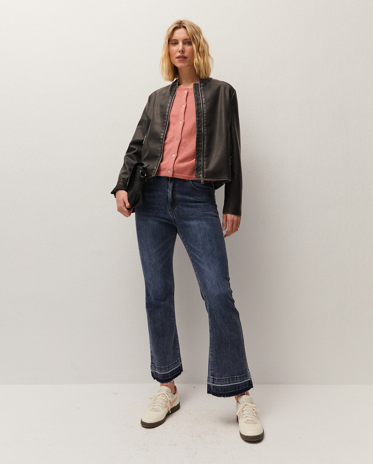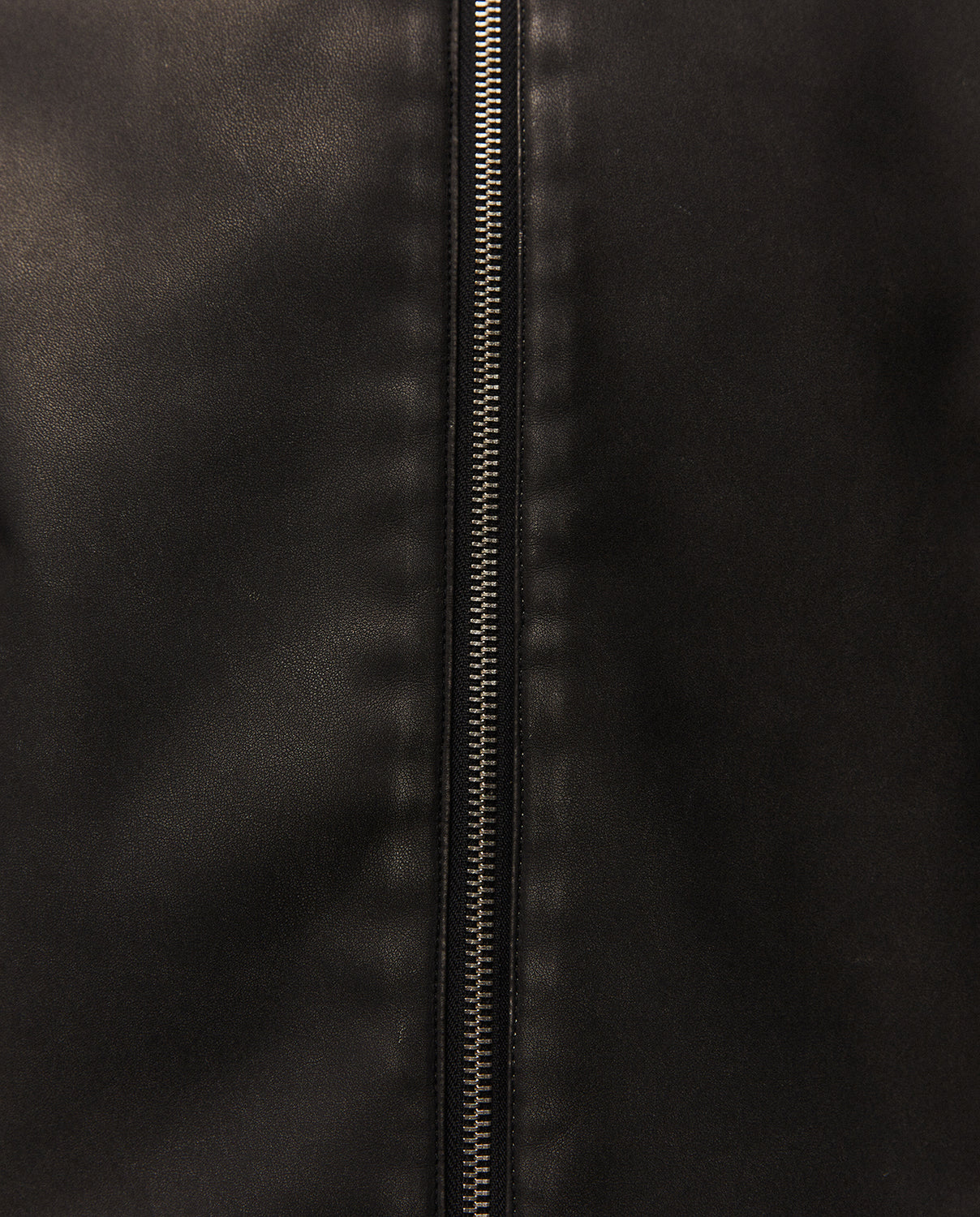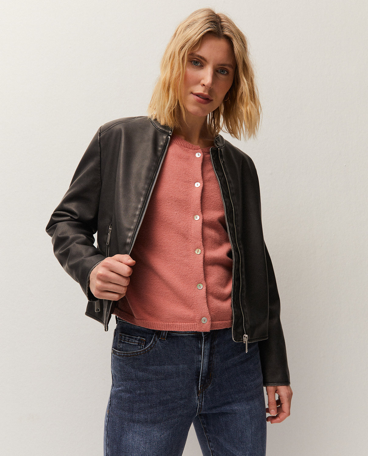 Cazadora de cuello mao y manga larga. Bolsillos delanteros con cremallera. Cierre frontal con cremallera.
