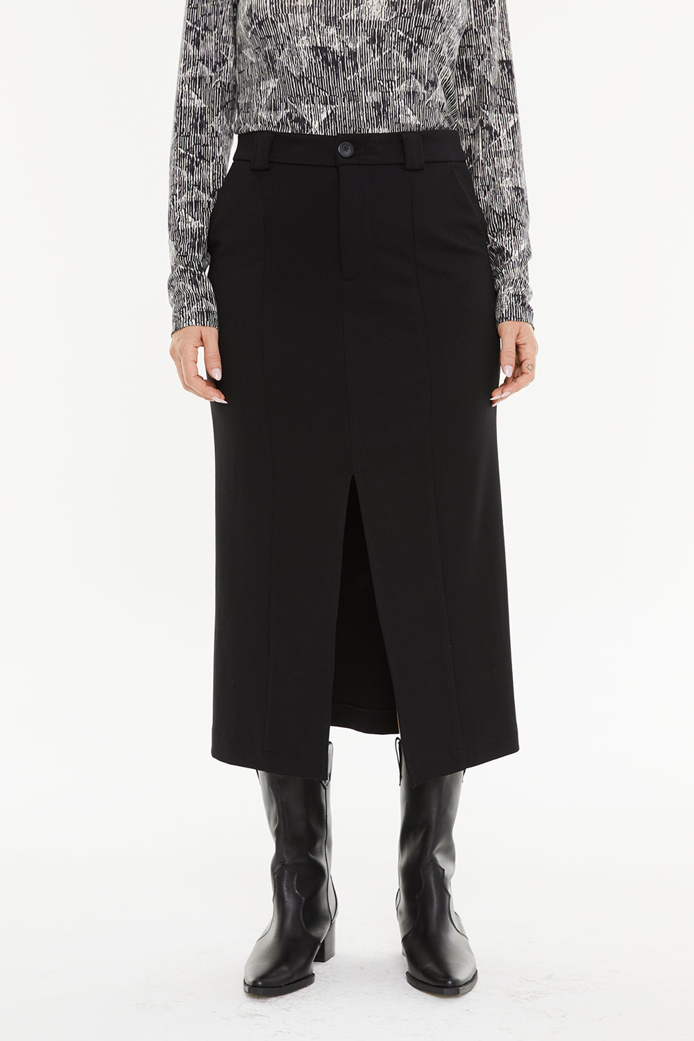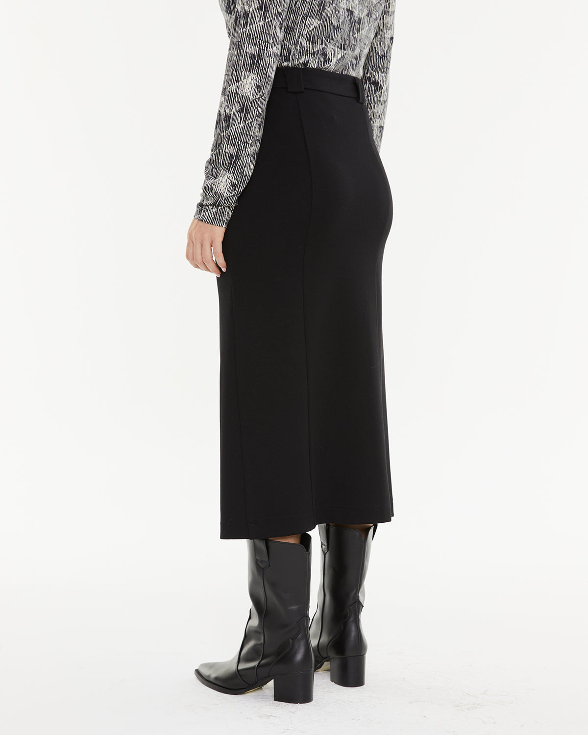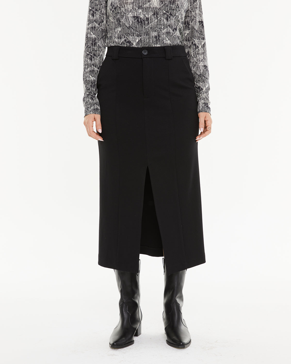 Jupe crayon midi pour femme avec poches latérales, fente centrale sur le devant et fermeture boutonnée.
