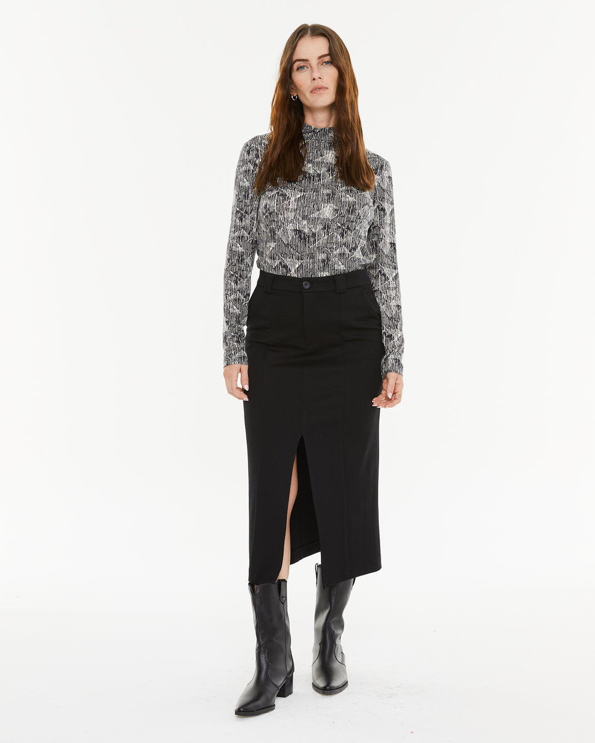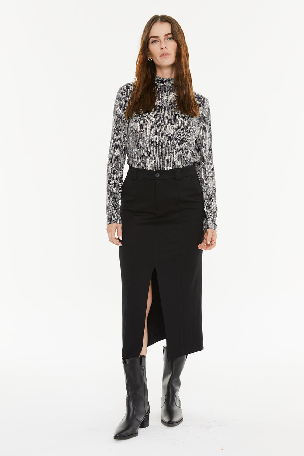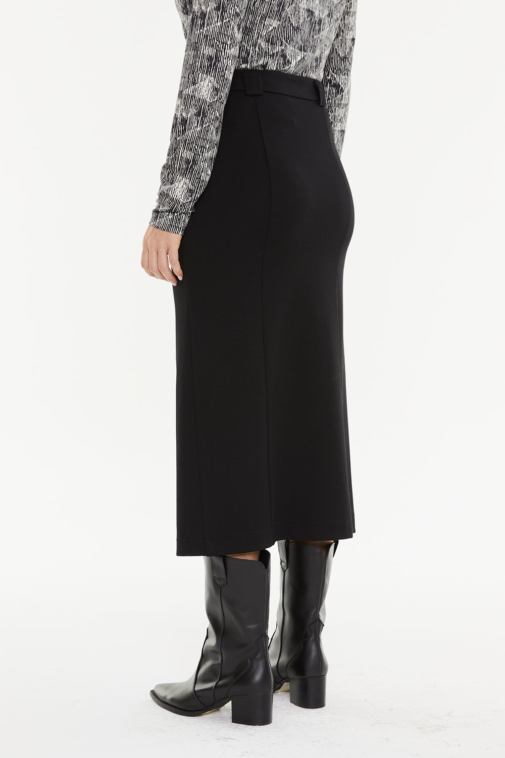 Jupe crayon midi pour femme avec poches latérales, fente centrale sur le devant et fermeture boutonnée.