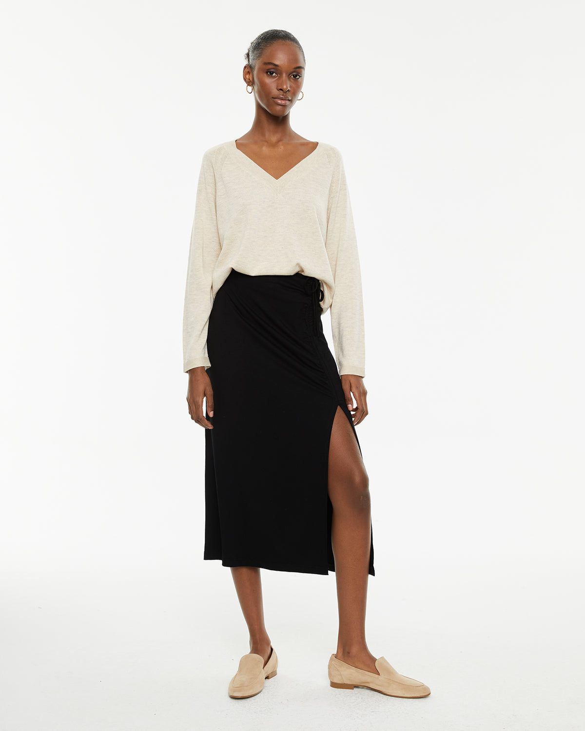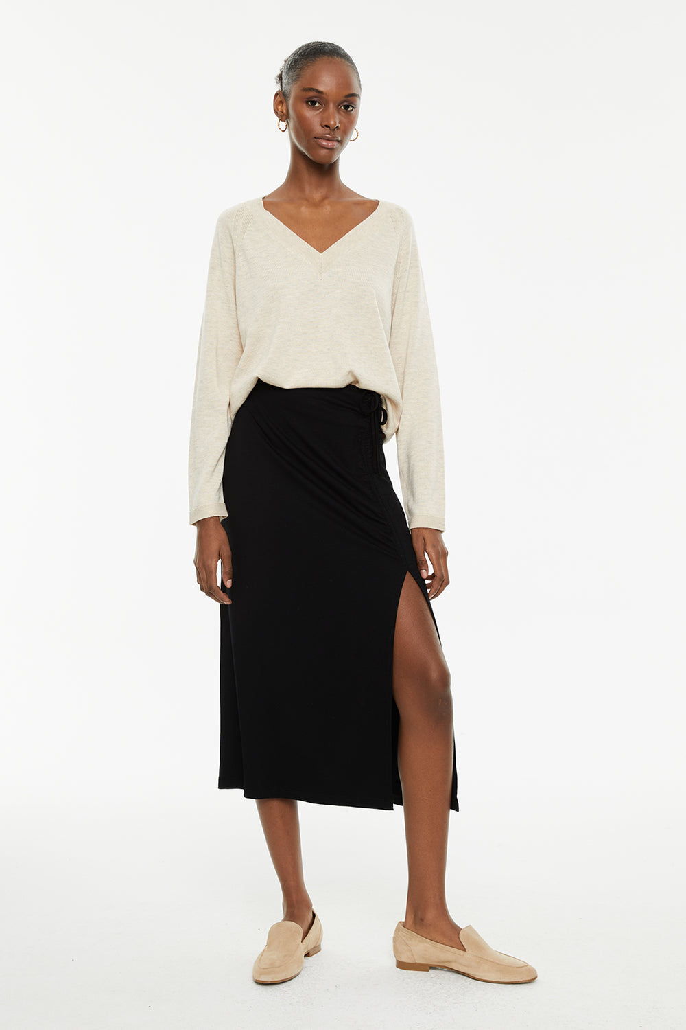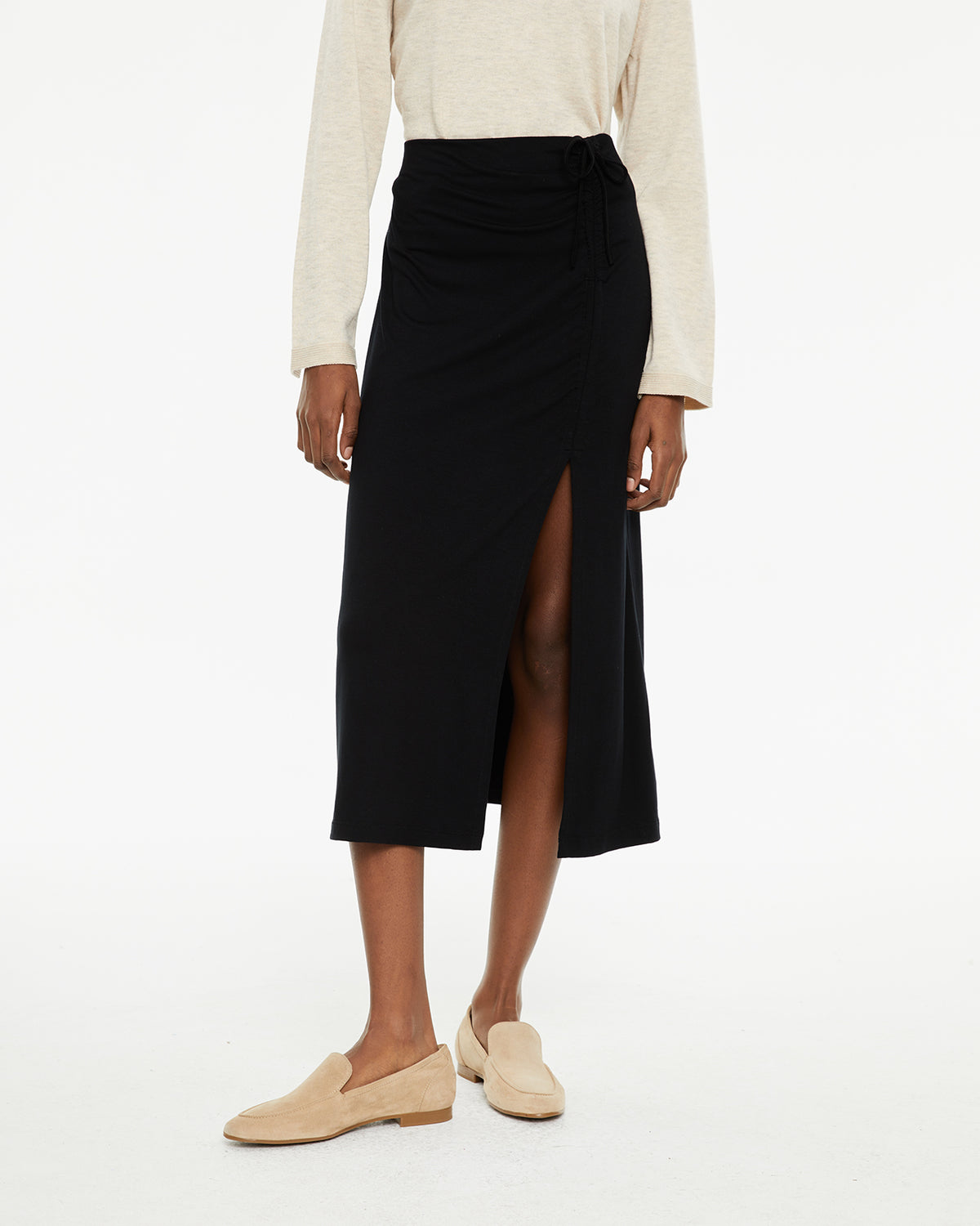 Jupe midi ajustée pour femme avec fente, taille élastique, ourlet évasé et fronces sur le côté. Vêtement durable.