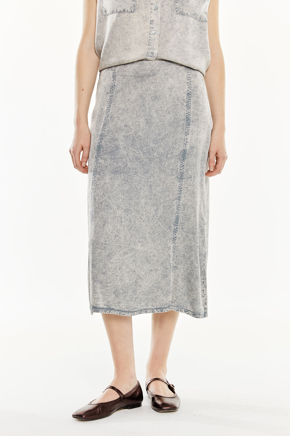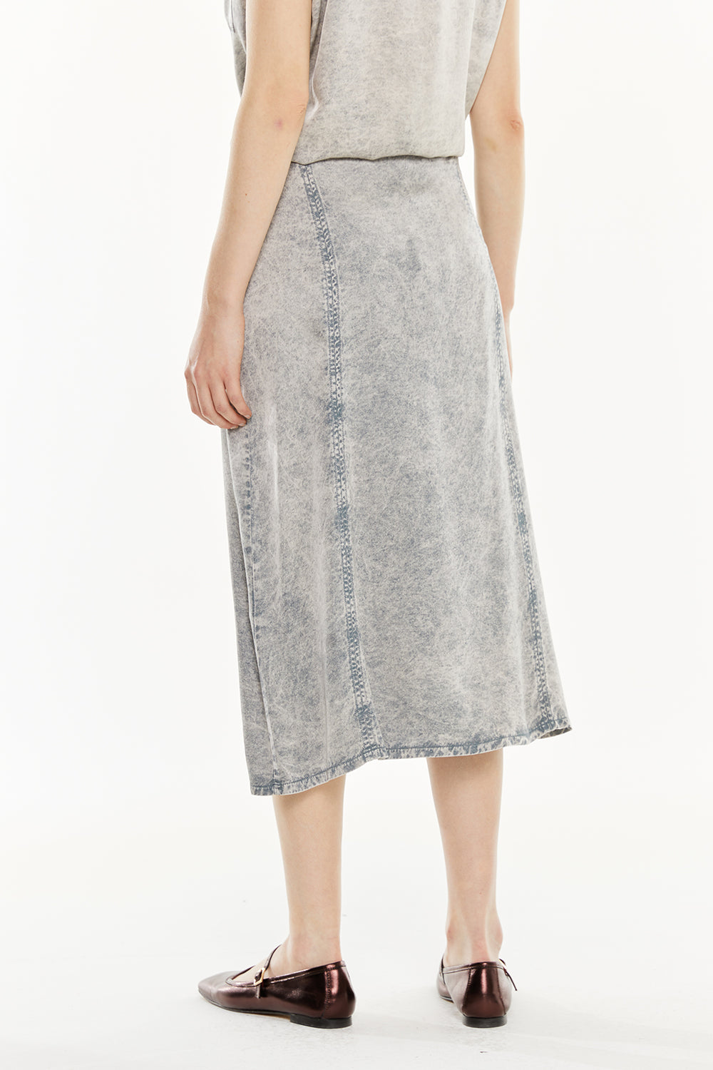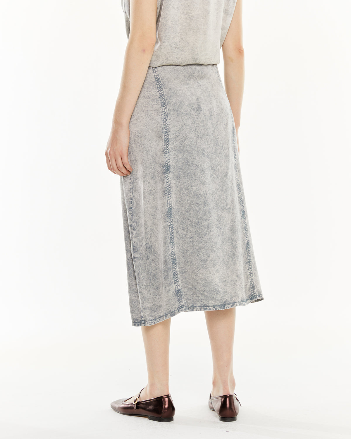 Jupe femme avec fermeture éclair latérale, surpiqûres sur le devant et finition teinture corrosive. Vêtement durable.