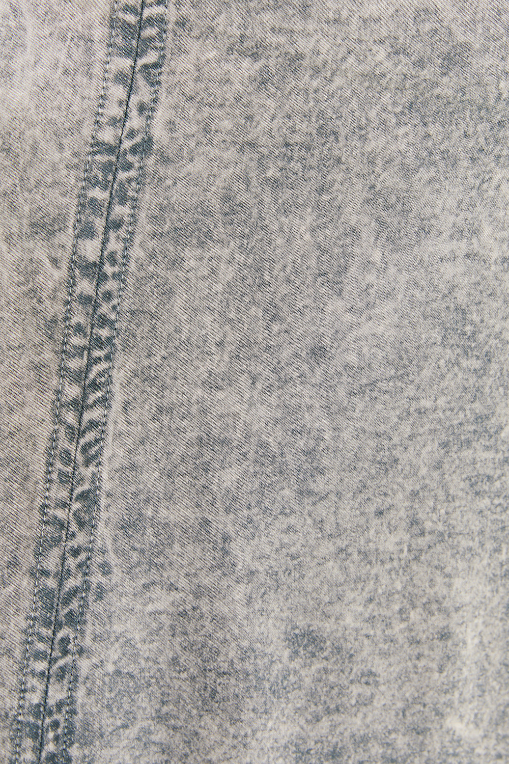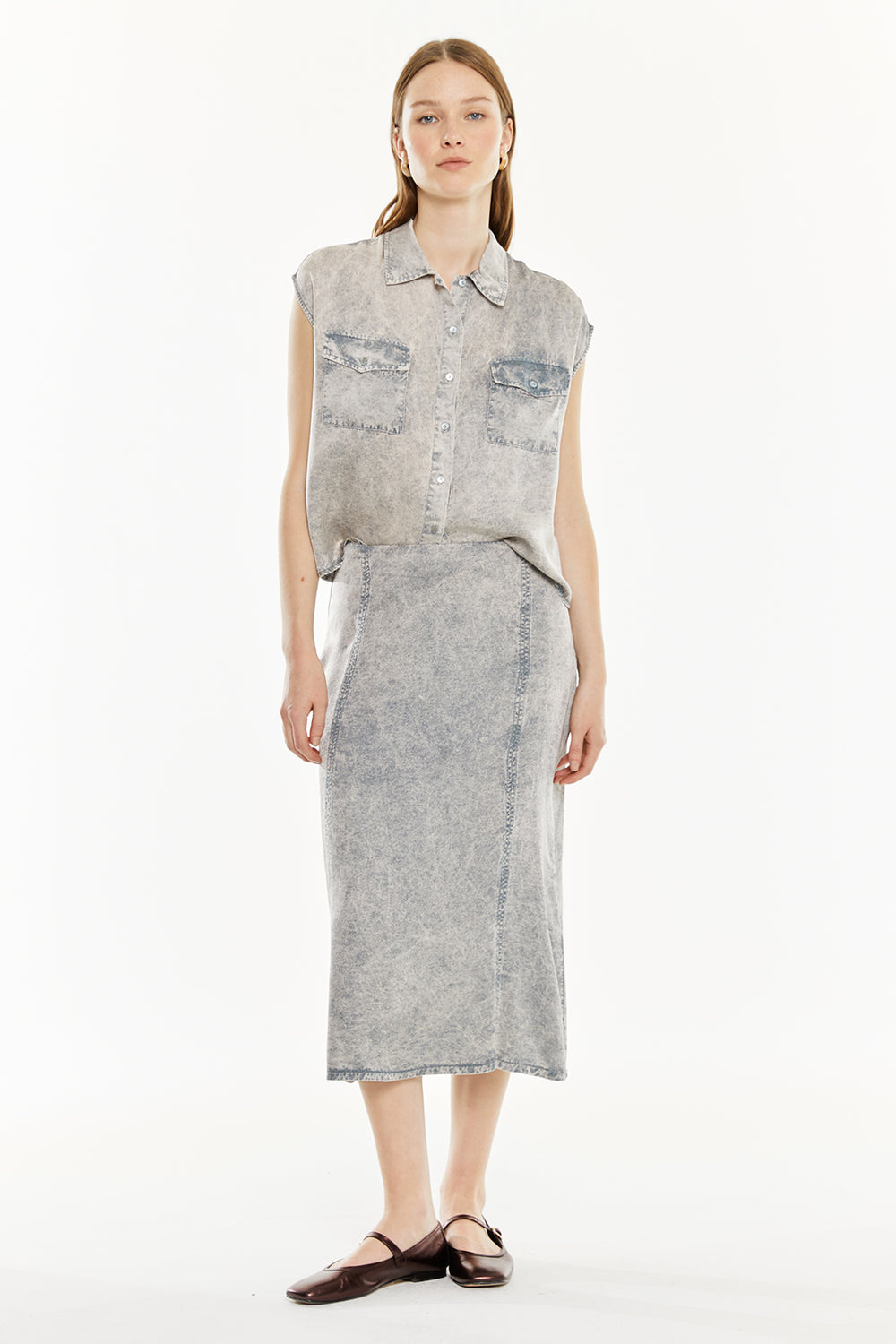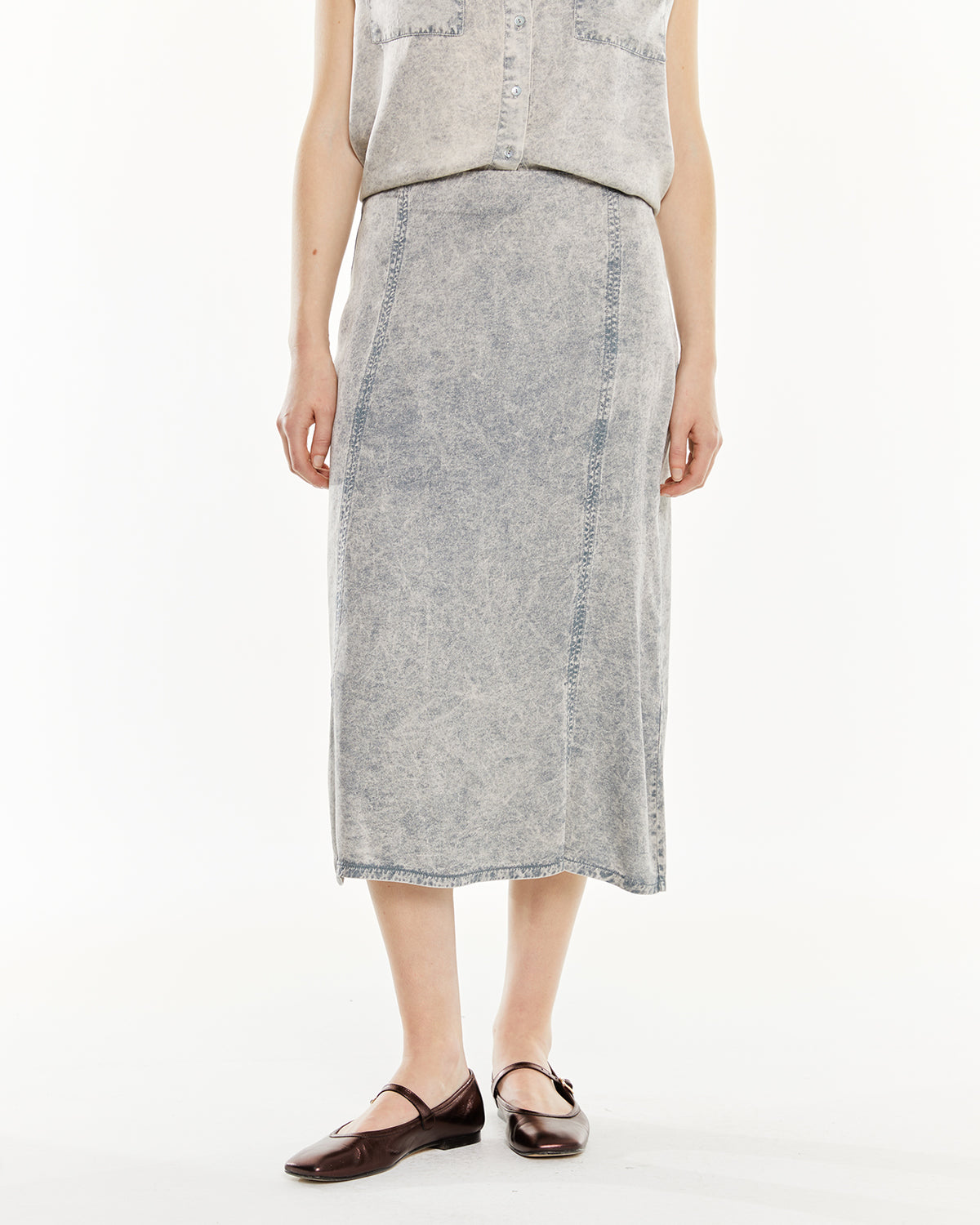 Jupe femme avec fermeture éclair latérale, surpiqûres sur le devant et finition teinture corrosive. Vêtement durable.