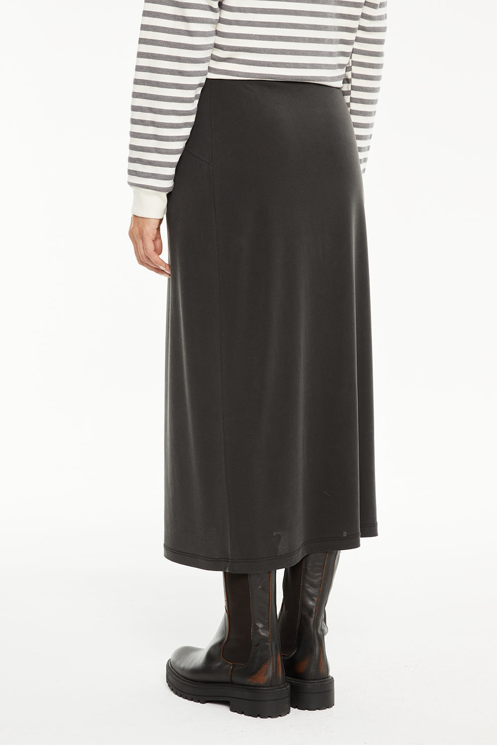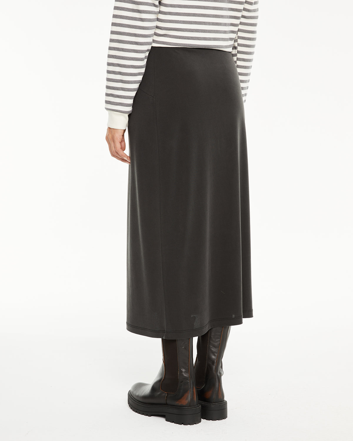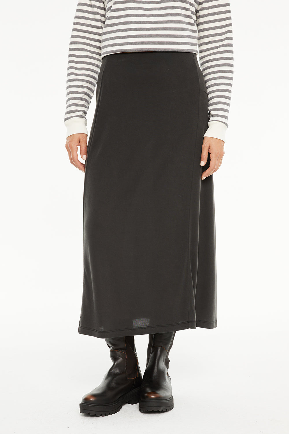 Jupe midi pour femme avec taille élastique et détails surpiqués sur le devant. Vêtement durable.