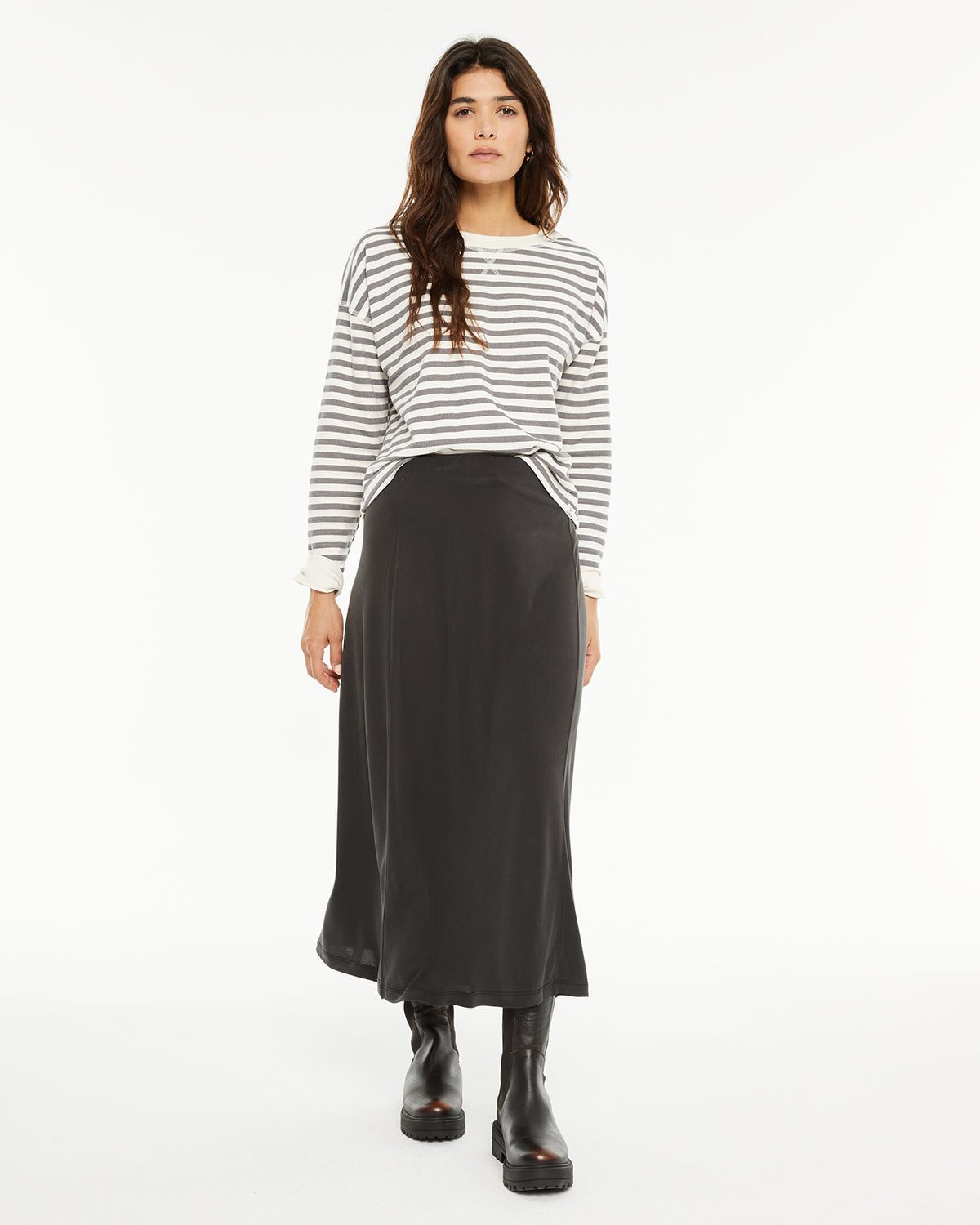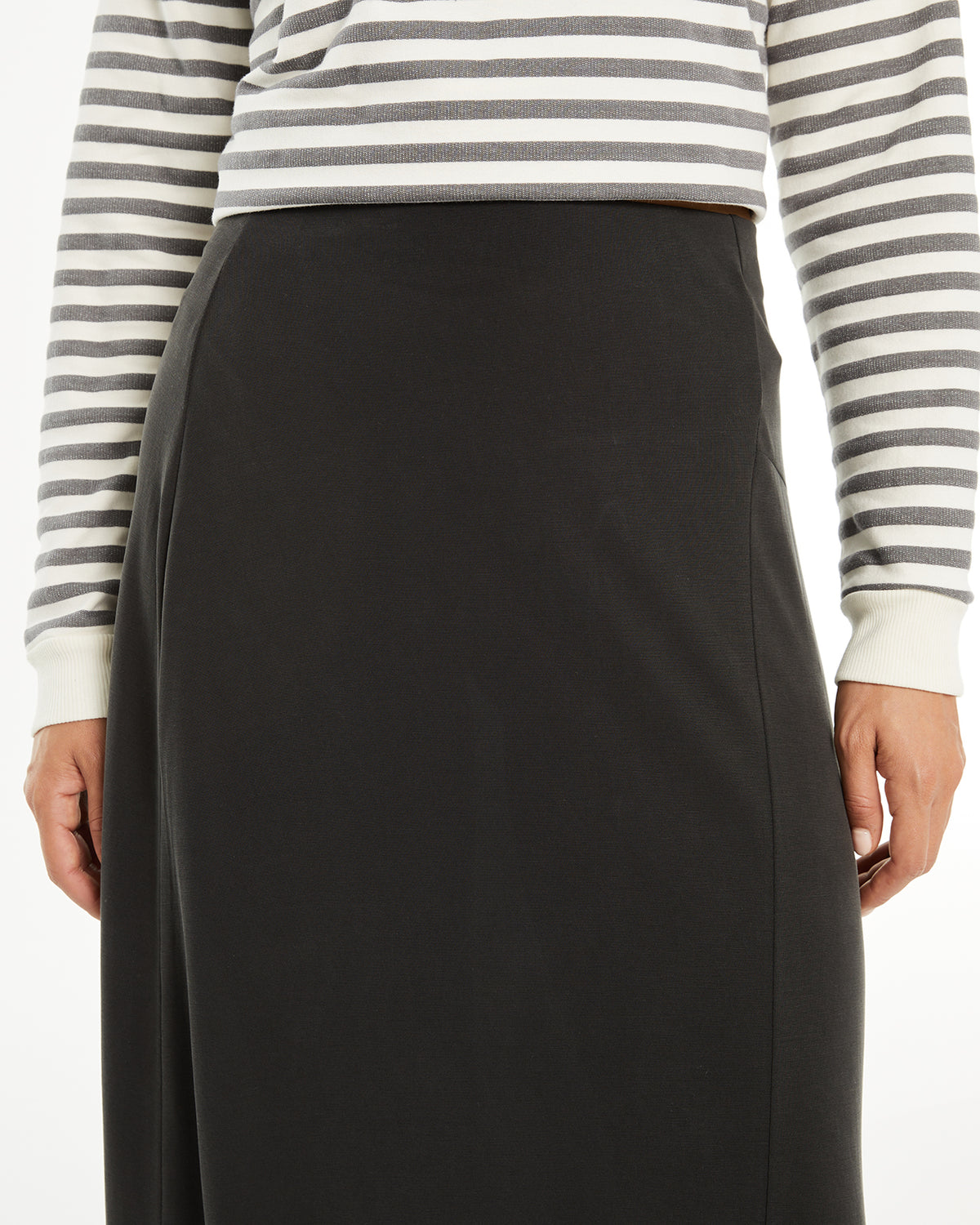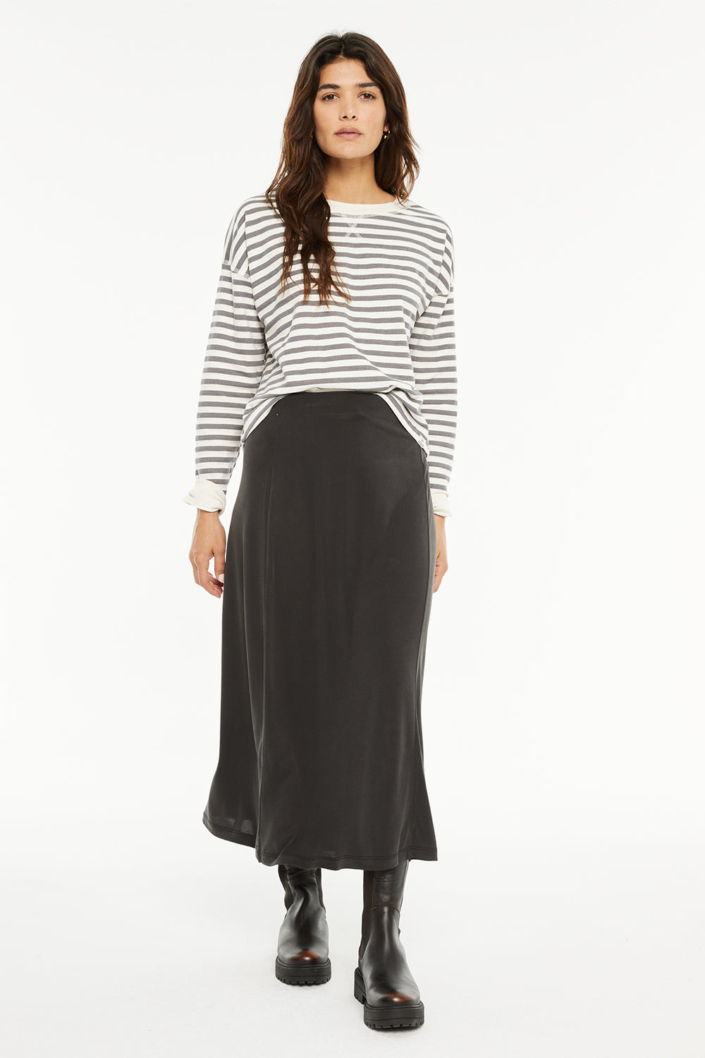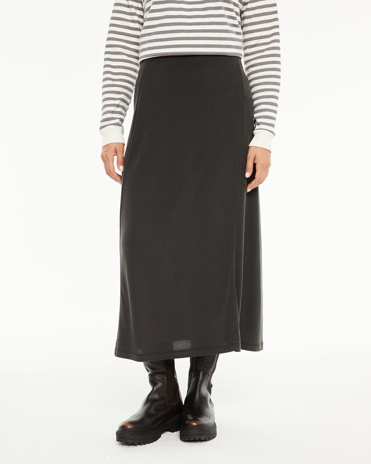 Jupe midi pour femme avec taille élastique et détails surpiqués sur le devant. Vêtement durable.