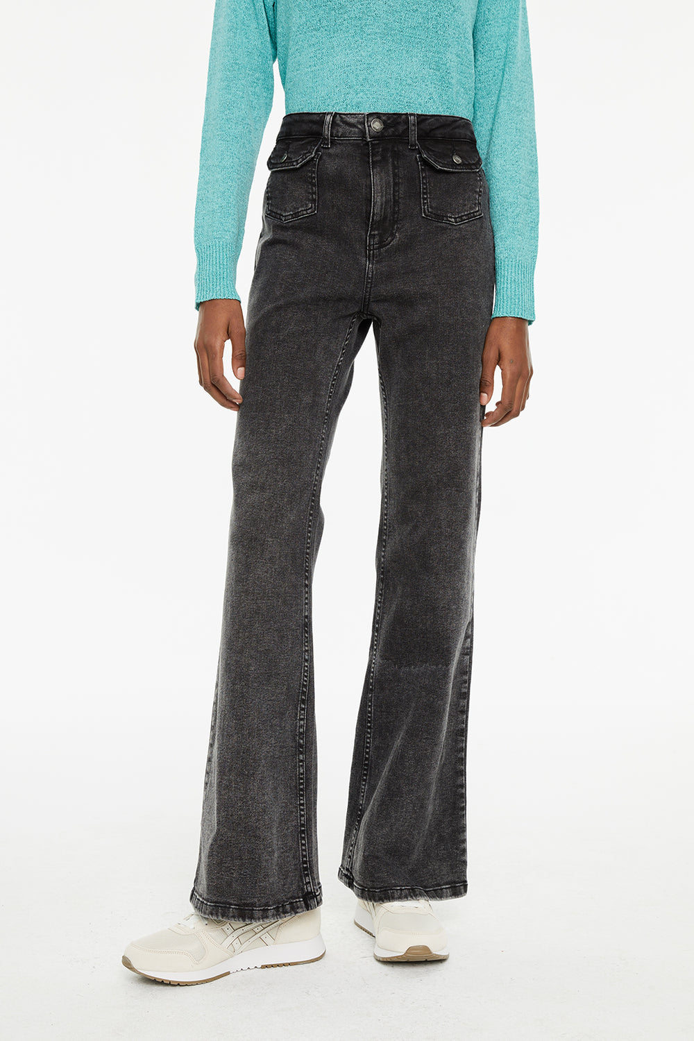 Jean gris pour femme, coupe évasée, taille mi-haute. Fermeture éclair et bouton métallique. Poches avant à boutons métalliques.