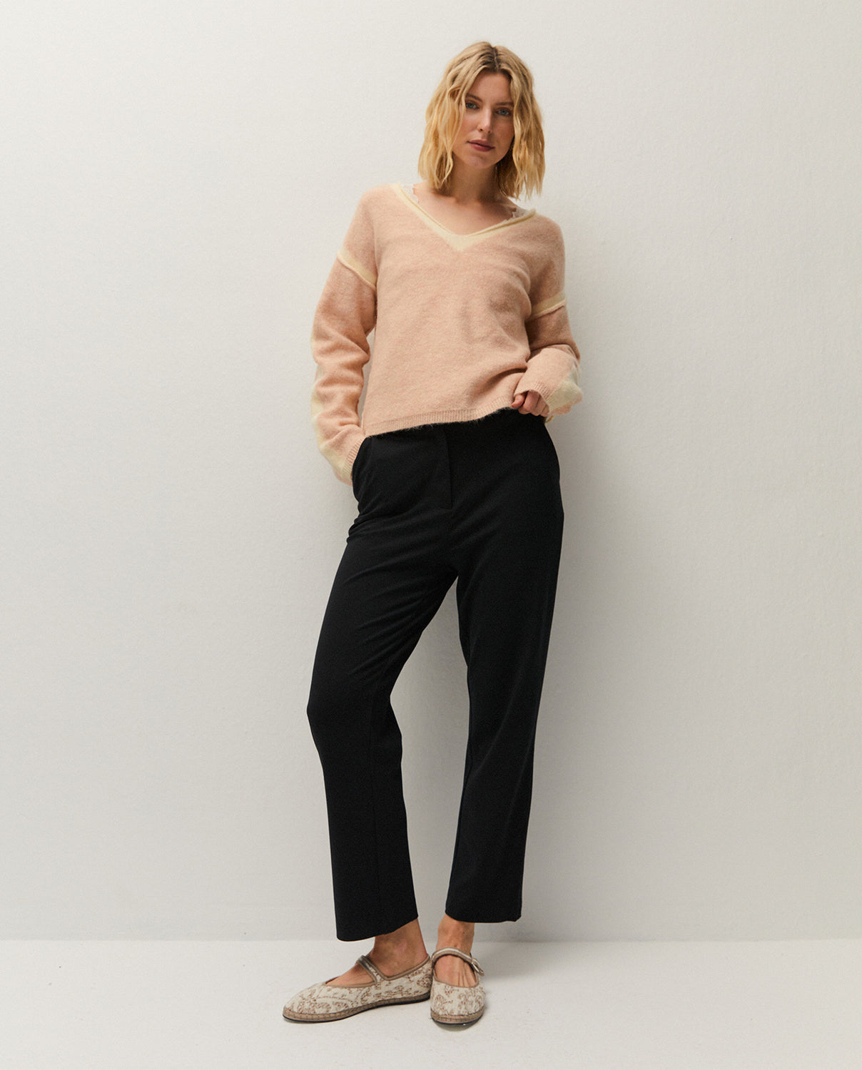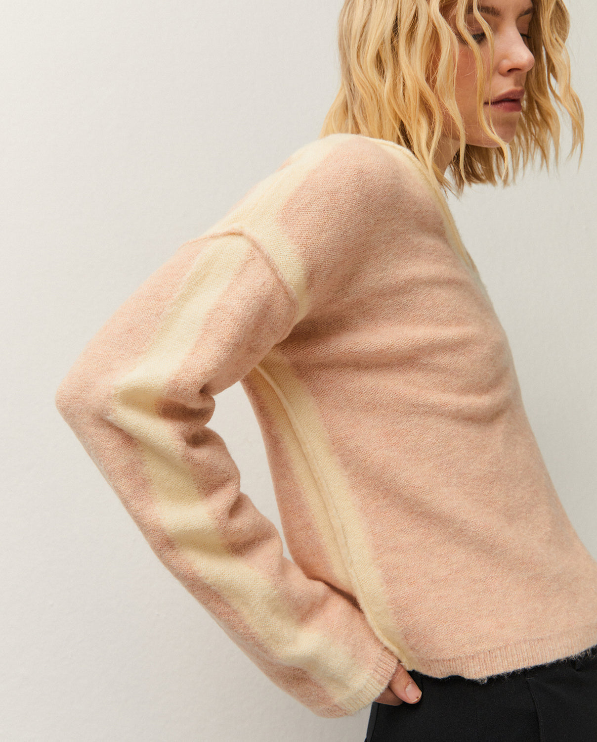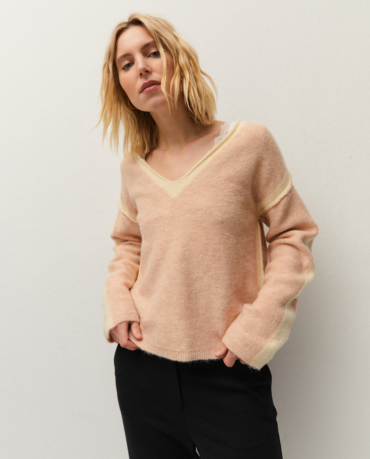 Jersey de cuello pico y manga larga con detalle de tiras a contraste en las mangas. Prenda sostenible.