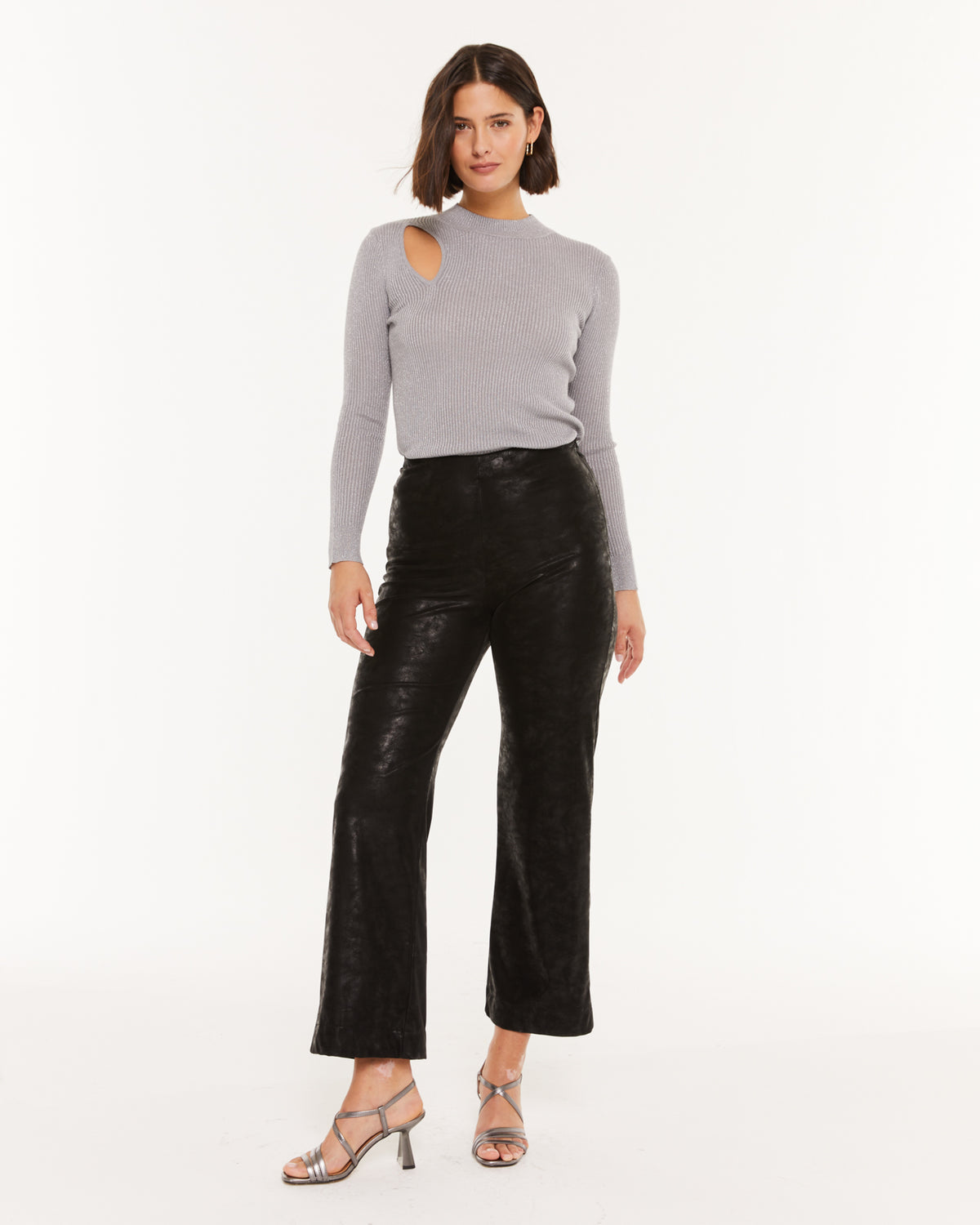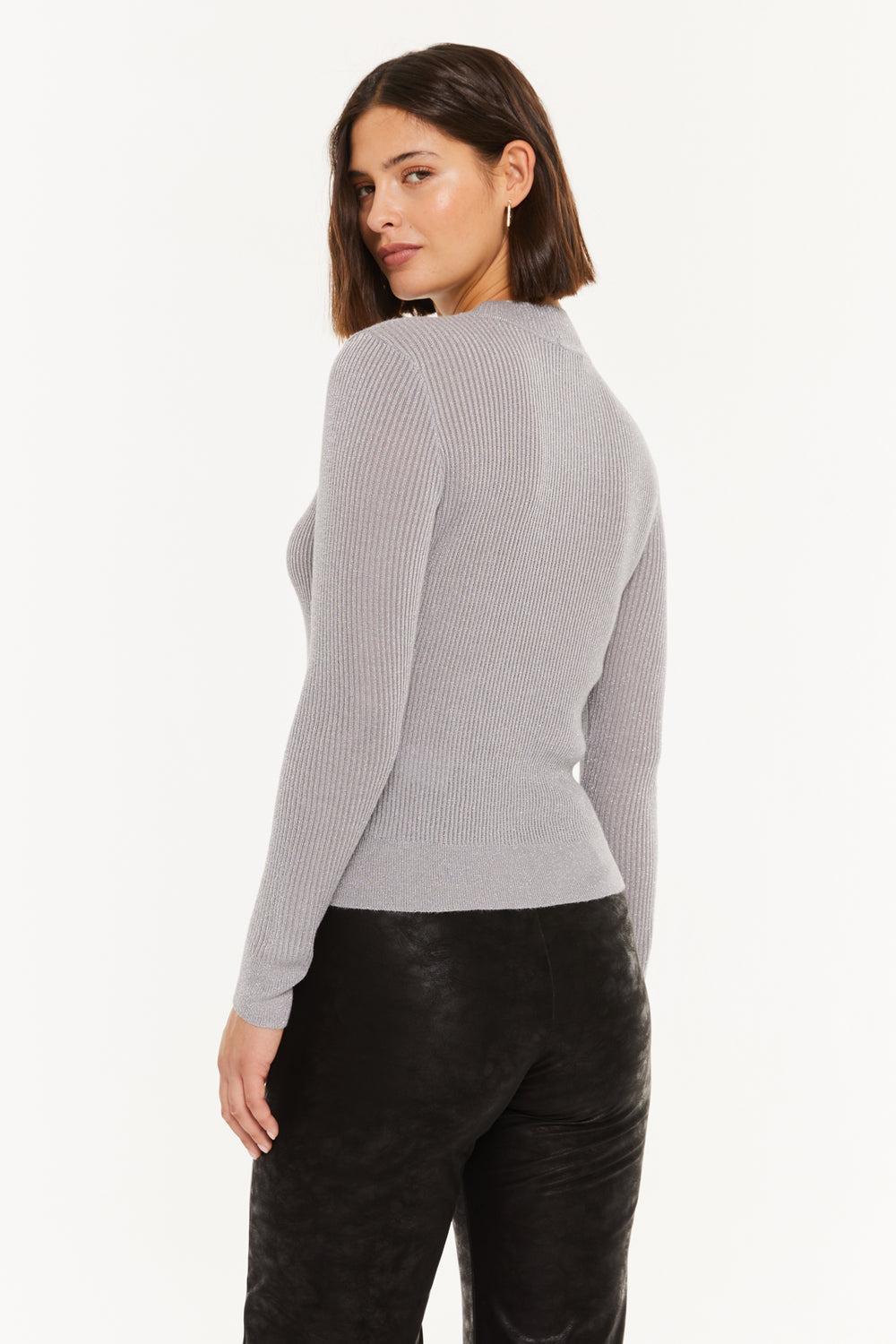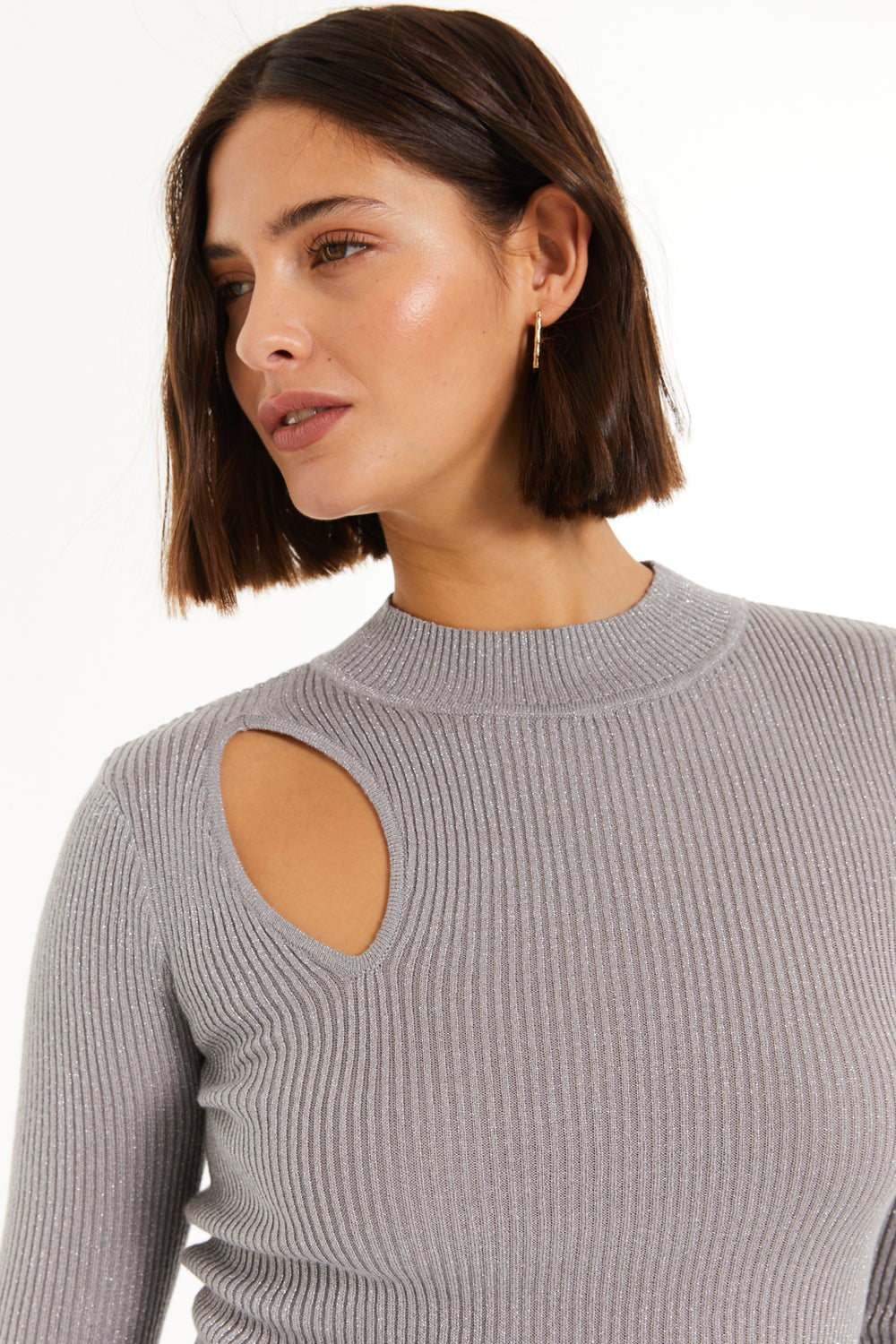 Pull pour femme en lurex, manches longues, col Perkins et découpe sur le devant.